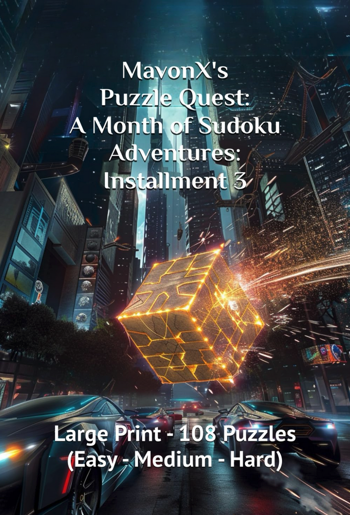 I am thrilled to announce that the third installment of my series, MavonX’s Puzzle Quest: A Month of Sudoku Adventures, is now available on Amazon! This edition, Installment 3: Large Print – 108 Puzzles (Easy – Medium – Hard), offers a variety of puzzles to challenge and entertain you.