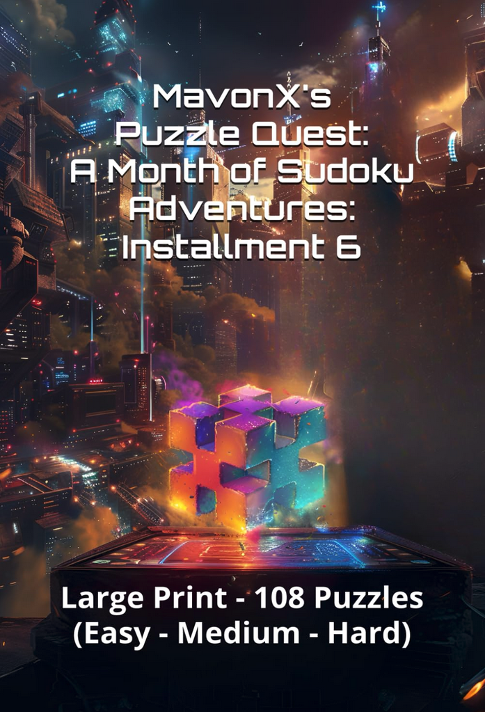 I am thrilled to announce that the sixth installment of my series, MavonX’s Puzzle Quest: A Month of Sudoku Adventures, is now available on Amazon! This edition, Installment 6: Large Print – 108 Puzzles (Easy – Medium – Hard), offers a variety of puzzles to challenge and entertain you.