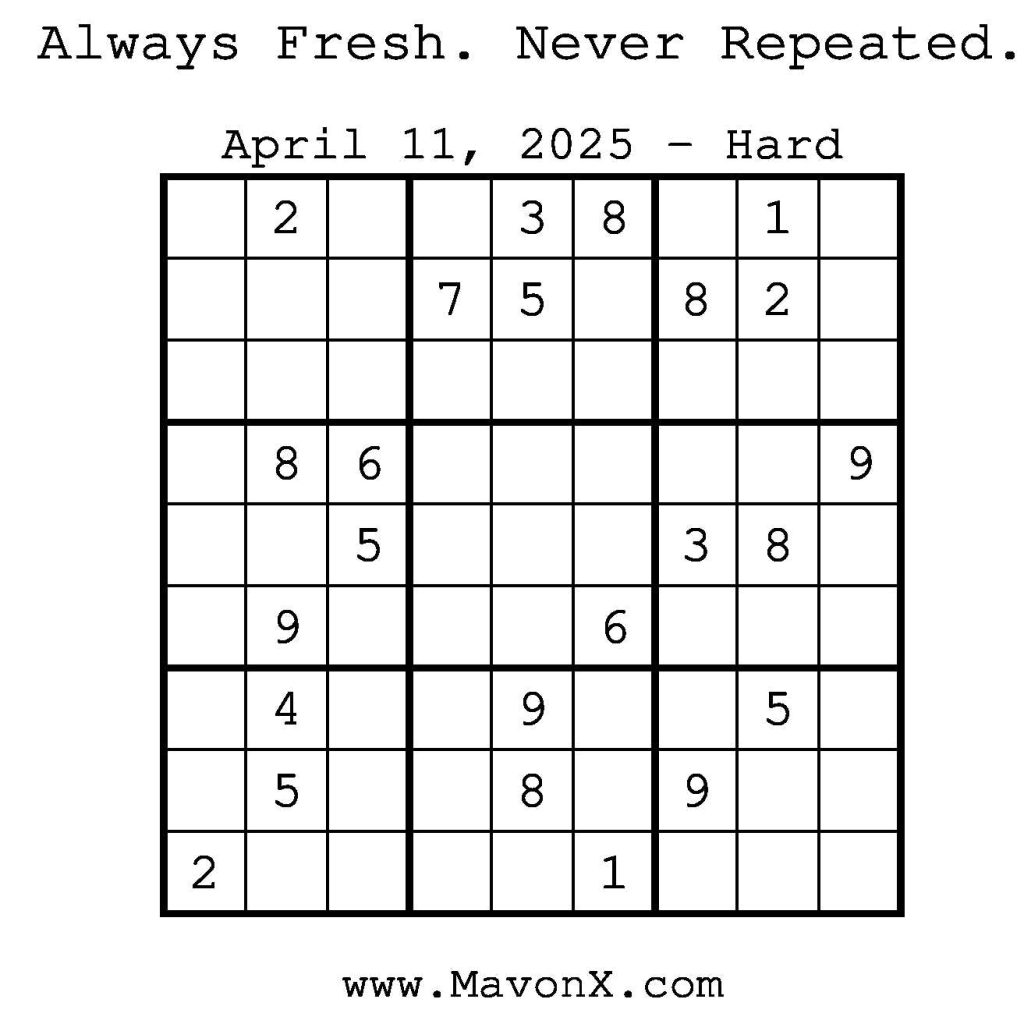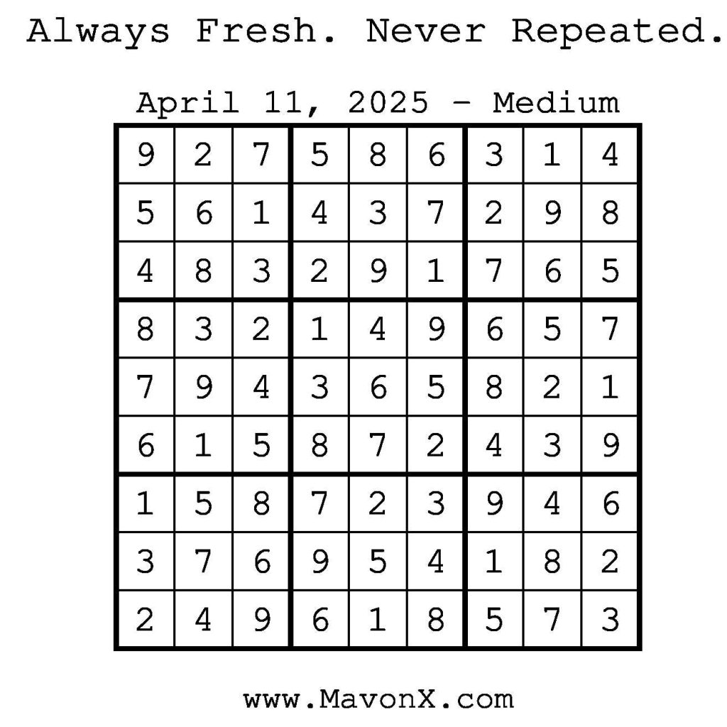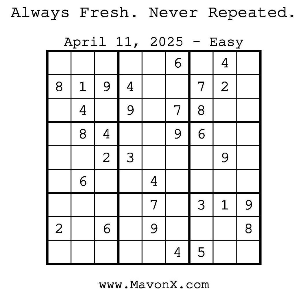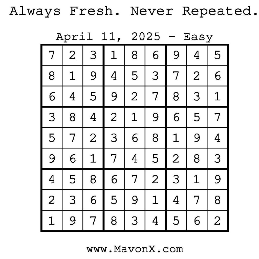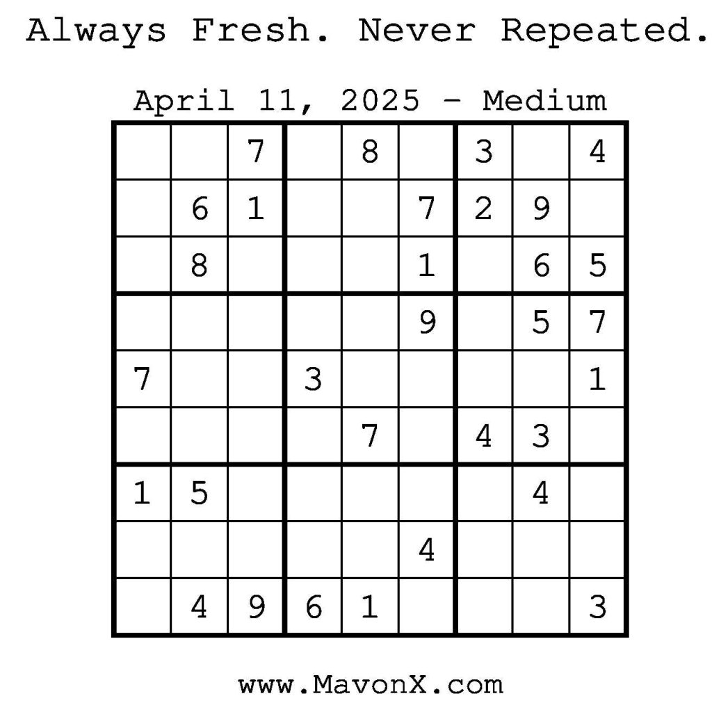 Puzzles of the Day – April 11, 2025 Post author:admin Post published:April 11, 2025 Post category:Free Stuff / Puzzle of the Day / Puzzle of the Day Solutions / Solutions Post comments:0 Comments Check out our books on Amazon! Check out our books on Barnes and Noble! Check out our books on Etsy! Easy Sudoku Coach Link Medium Sudoku Coach Link Hard Sudoku Coach Link Show Solution You Might Also Like Puzzles of the Day – February 27, 2026 February 26, 2026 Puzzles of the Day – February 28, 2026 February 27, 2026 Puzzles of the Day – September 8, 2025 September 7, 2025 Leave a Reply Cancel replyCommentEnter your name or username to comment Enter your email address to comment Enter your website URL (optional) Save my name, email, and website in this browser for the next time I comment.