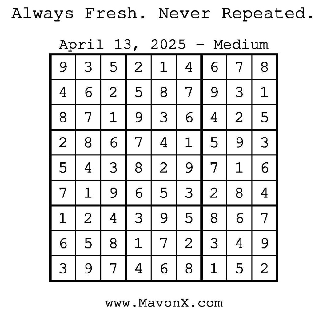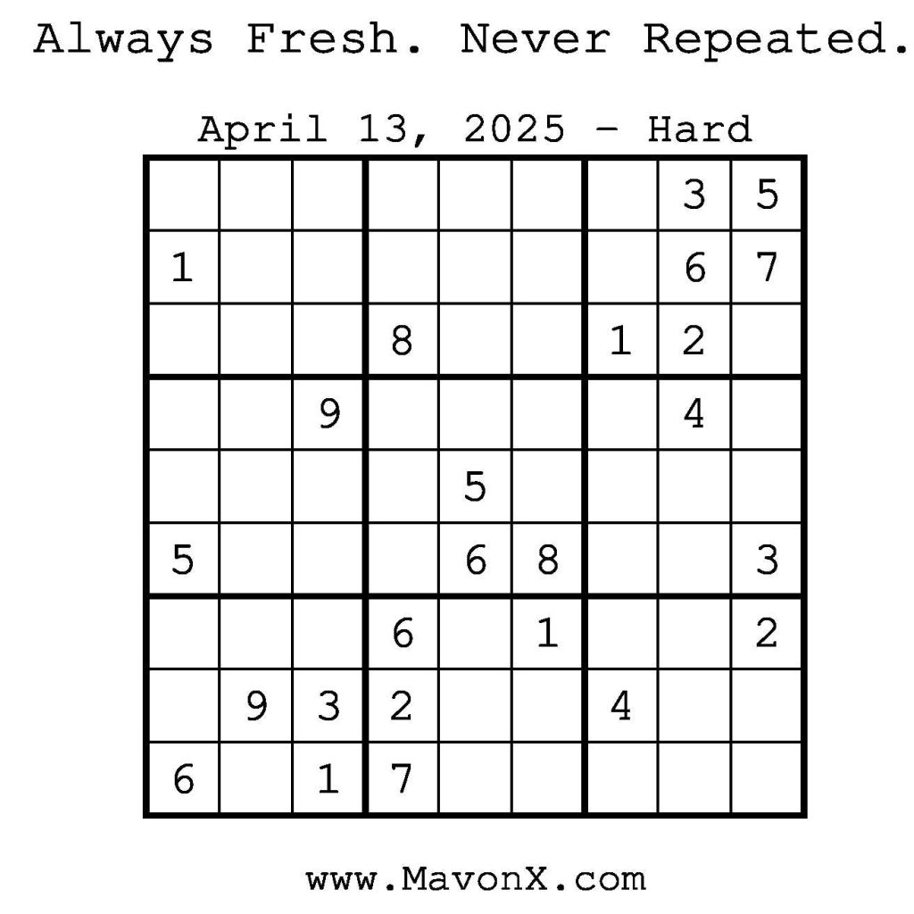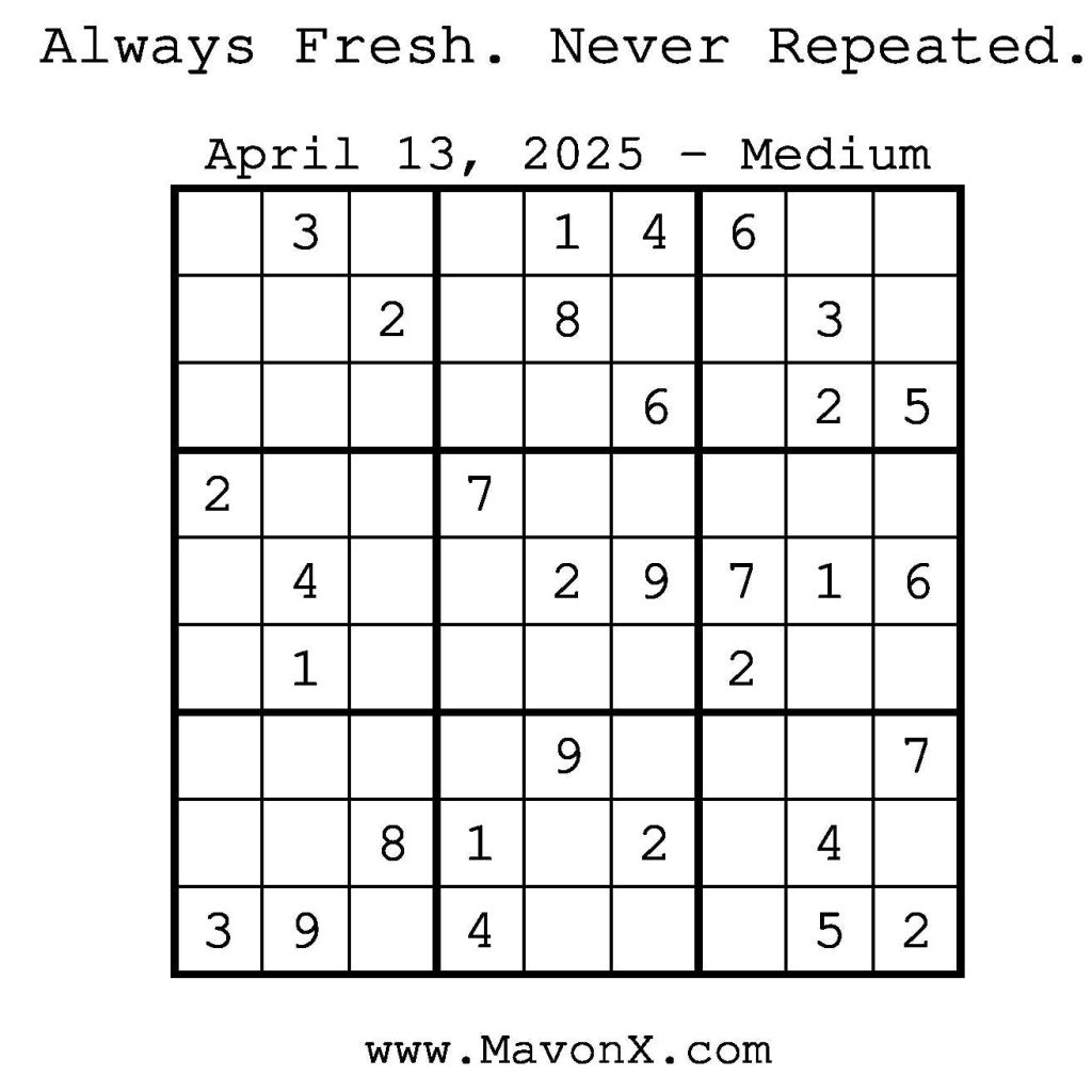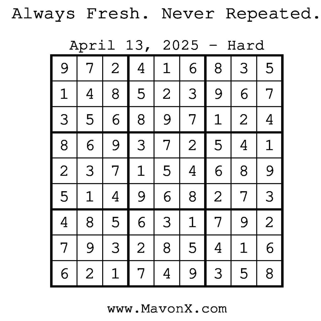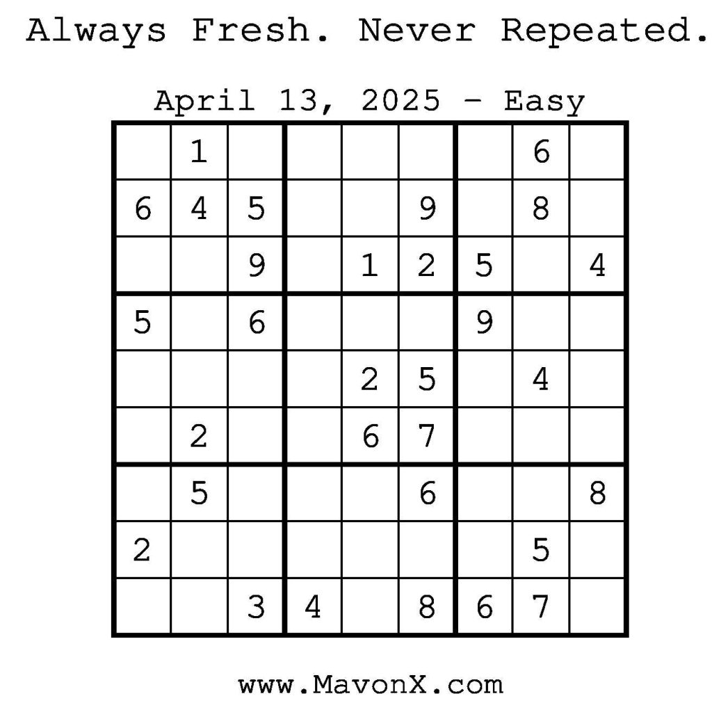 Puzzles of the Day – April 13, 2025 Post author:admin Post published:April 12, 2025 Post category:Free Stuff / Puzzle of the Day / Puzzle of the Day Solutions / Solutions Post comments:0 Comments Check out our books on Amazon! Check out our books on Barnes and Noble! Check out our books on Etsy! Easy Sudoku Coach Link Medium Sudoku Coach Link Hard Sudoku Coach Link Show Solution You Might Also Like Puzzles of the Day – March 17, 2026 March 17, 2026 Puzzles of the Day – October 22, 2025 October 22, 2025 Puzzle of the Day – July 24, 2024 July 26, 2024 Leave a Reply Cancel replyCommentEnter your name or username to comment Enter your email address to comment Enter your website URL (optional) Save my name, email, and website in this browser for the next time I comment.