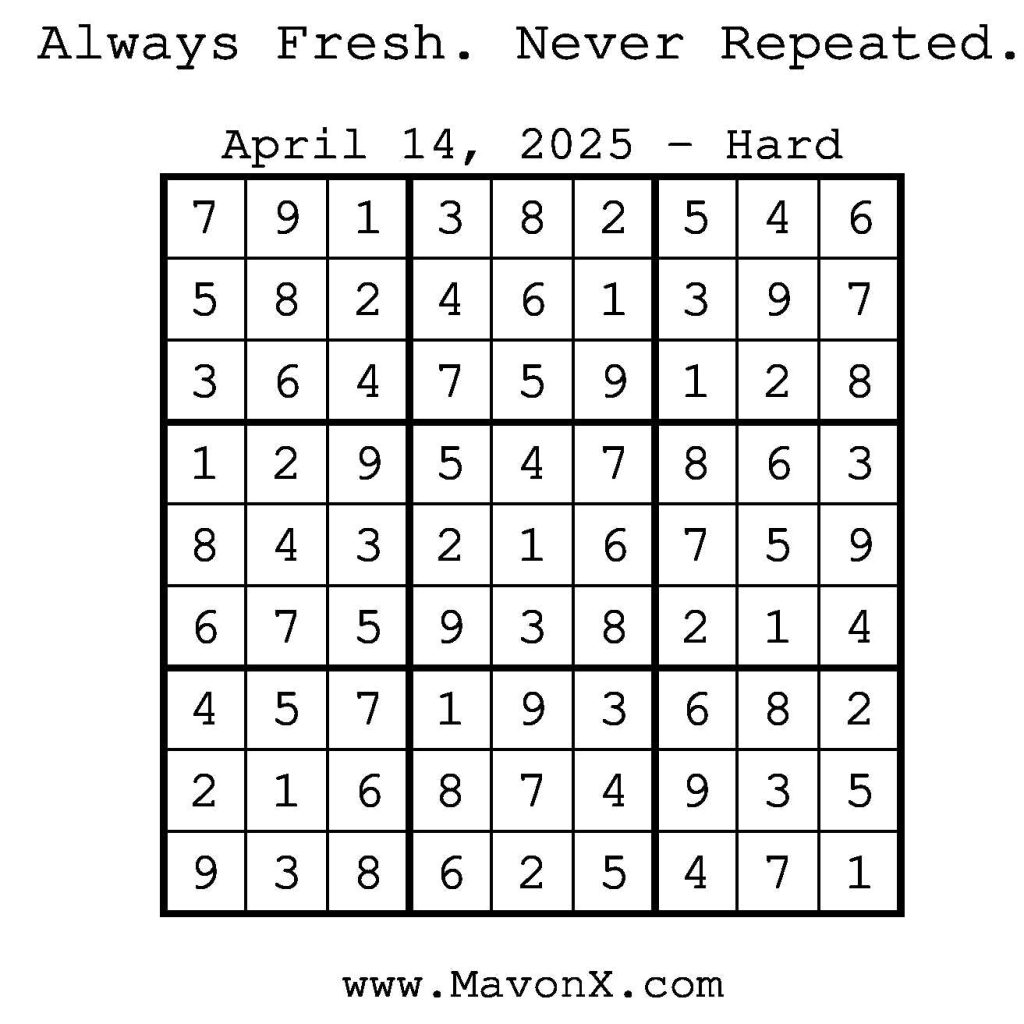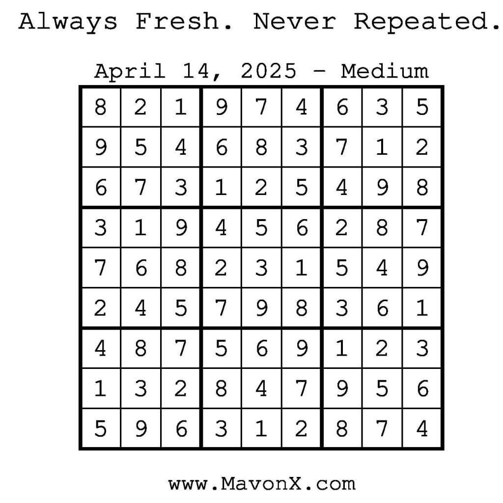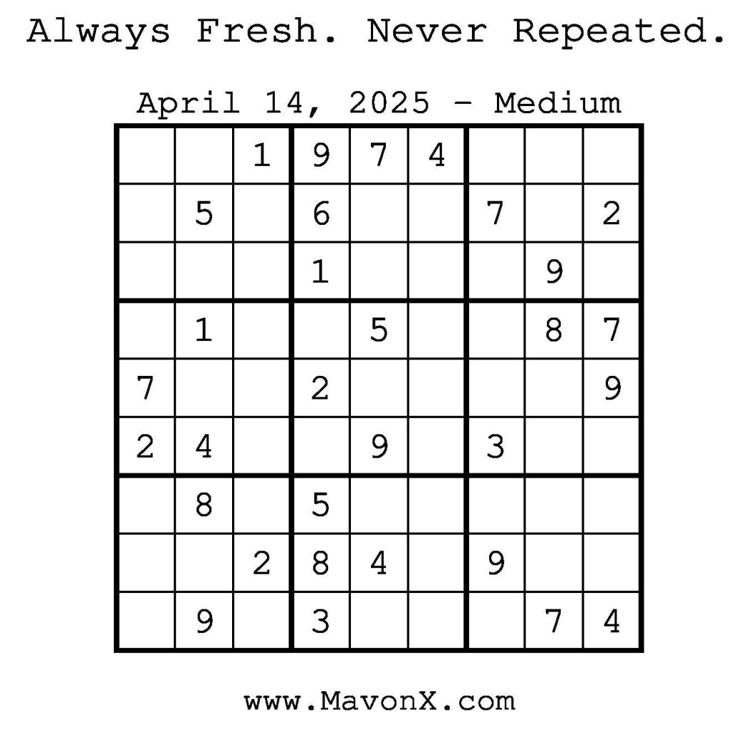 Puzzles of the Day – April 14, 2025 Post author:admin Post published:April 14, 2025 Post category:Free Stuff / Puzzle of the Day / Puzzle of the Day Solutions / Solutions Post comments:0 Comments Check out our books on Amazon! Check out our books on Barnes and Noble! Check out our books on Etsy! Easy Sudoku Coach Link Medium Sudoku Coach Link Hard Sudoku Coach Link Show Solution You Might Also Like Puzzles of the Day – May 7, 2025 May 6, 2025 Puzzles of the Day – October 26, 2025 October 26, 2025 Puzzles of the Day – June 26, 2025 June 27, 2025 Leave a Reply Cancel replyCommentEnter your name or username to comment Enter your email address to comment Enter your website URL (optional) Save my name, email, and website in this browser for the next time I comment.