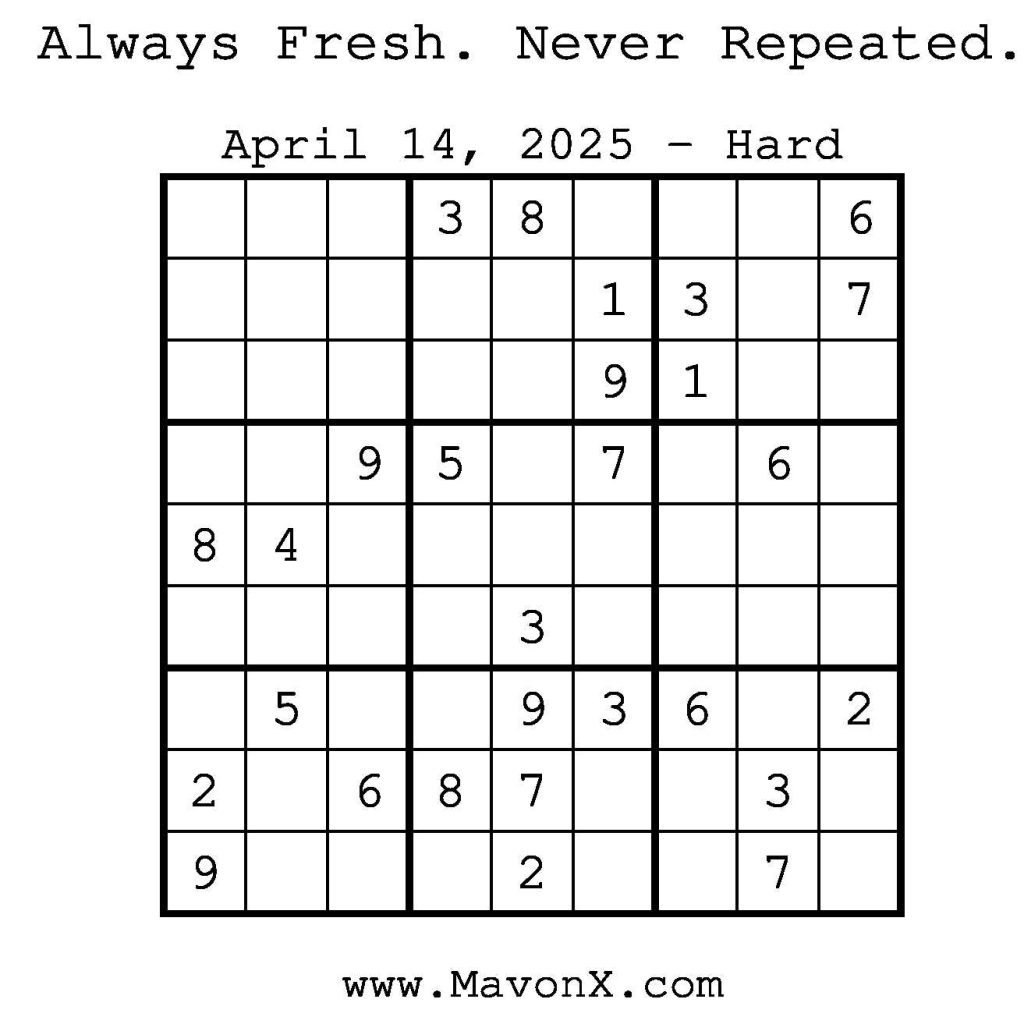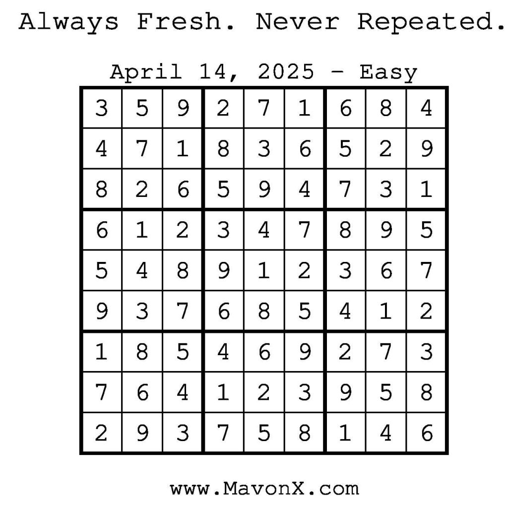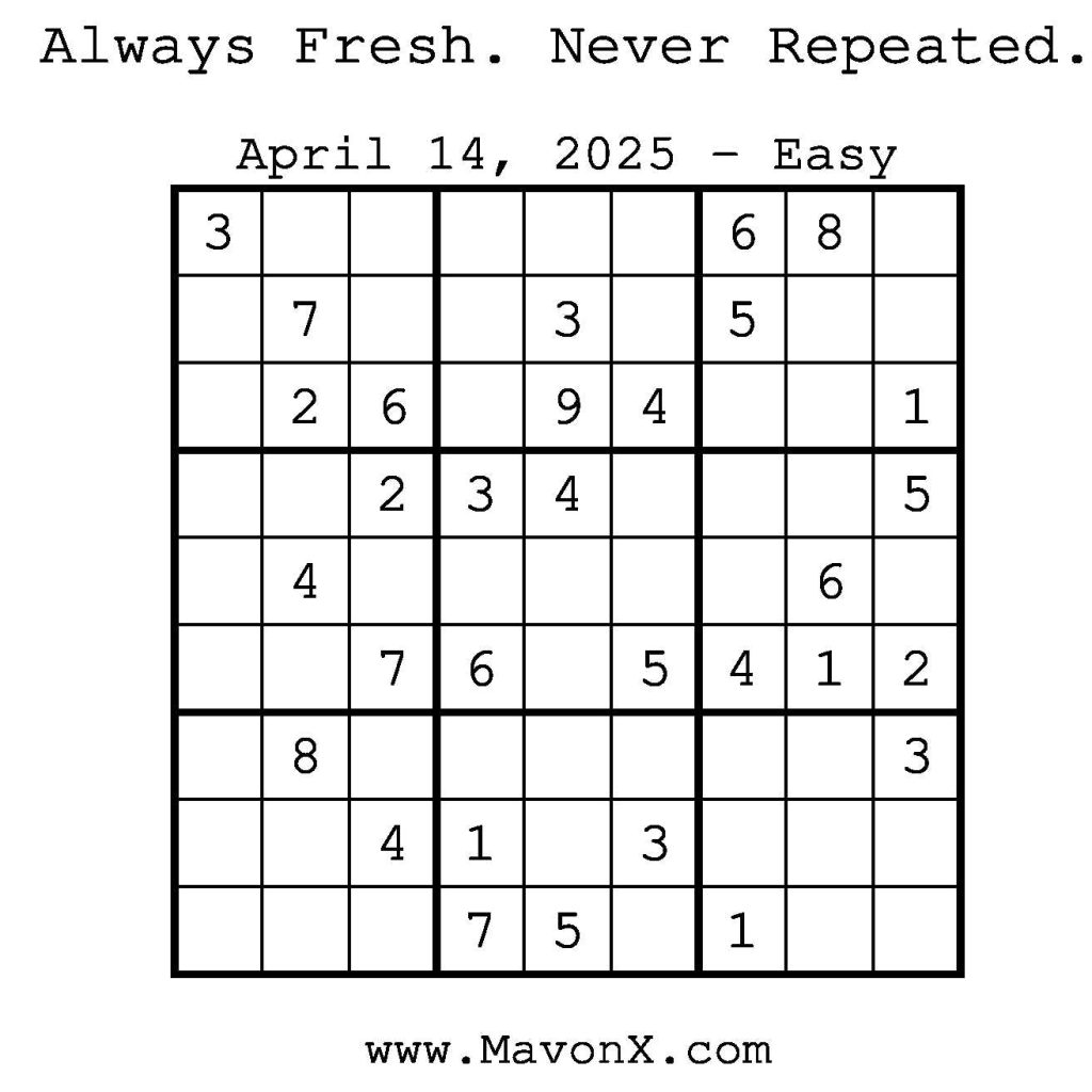 Puzzles of the Day – April 14, 2025 Post author:admin Post published:April 14, 2025 Post category:Free Stuff / Puzzle of the Day / Puzzle of the Day Solutions / Solutions Post comments:0 Comments Check out our books on Amazon! Check out our books on Barnes and Noble! Check out our books on Etsy! Easy Sudoku Coach Link Medium Sudoku Coach Link Hard Sudoku Coach Link Show Solution You Might Also Like Puzzles of the Day – May 7, 2025 May 6, 2025 Puzzles of the Day – October 26, 2025 October 26, 2025 Puzzles of the Day – June 26, 2025 June 27, 2025 Leave a Reply Cancel replyCommentEnter your name or username to comment Enter your email address to comment Enter your website URL (optional) Save my name, email, and website in this browser for the next time I comment.