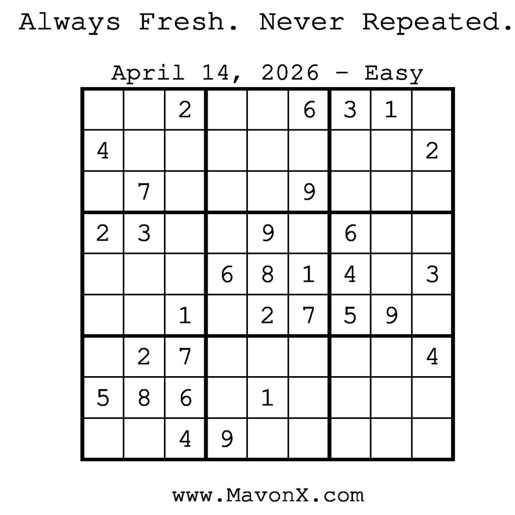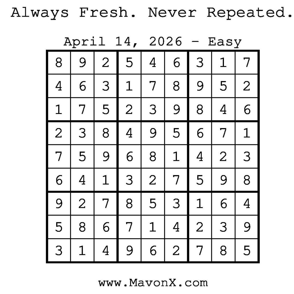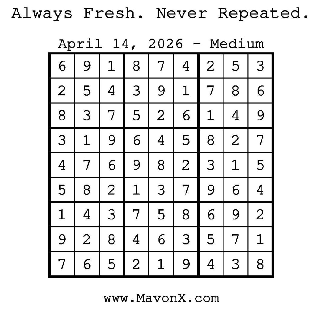 Puzzles of the Day – April 14, 2026 Post author:admin Post published:April 14, 2026 Post category:Free Stuff / Puzzle of the Day / Puzzle of the Day Solutions / Solutions Post comments:0 Comments Check out our books on Amazon! Check out our books on Barnes and Noble! Check out our books on Etsy! Easy Sudoku Coach Link Medium Sudoku Coach Link Hard Sudoku Coach Link Show Solution You Might Also Like Puzzle of the Day – August 9, 2024 August 9, 2024 Puzzles of the Day – September 25, 2025 September 25, 2025 Puzzles of the Day – January 22, 2025 January 22, 2025 Leave a Reply Cancel replyCommentEnter your name or username to comment Enter your email address to comment Enter your website URL (optional) Save my name, email, and website in this browser for the next time I comment.