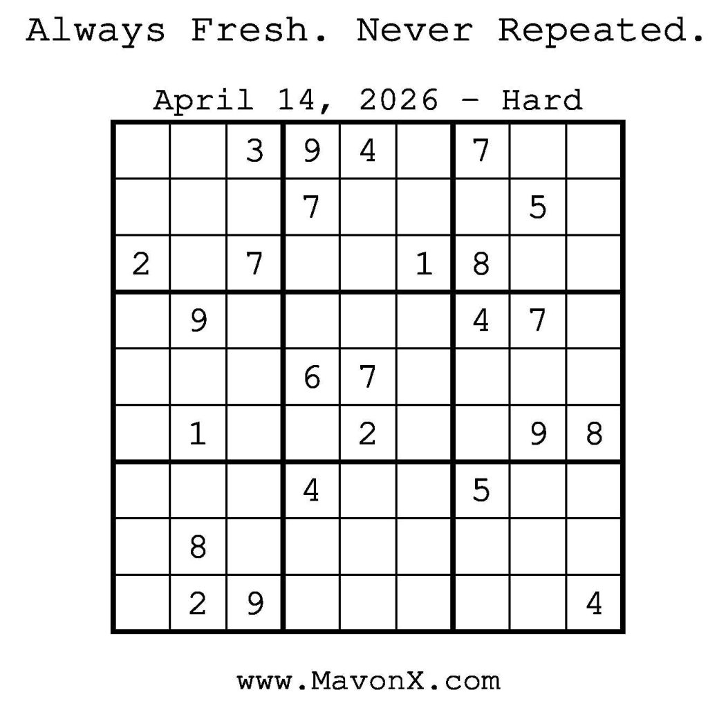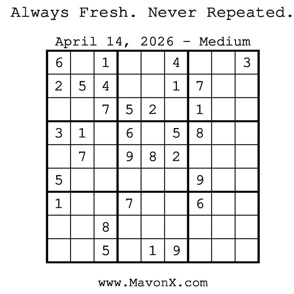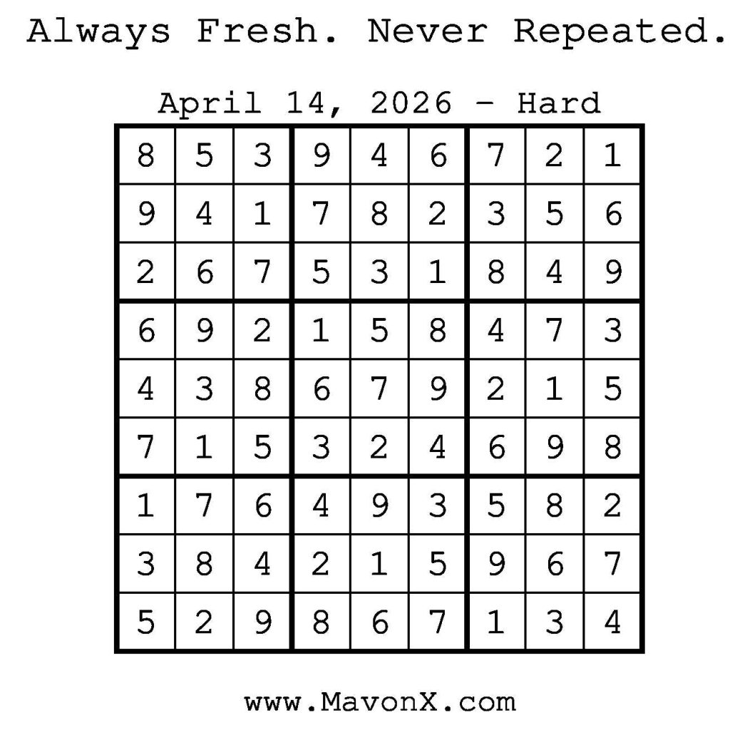 Puzzles of the Day – April 14, 2026 Post author:admin Post published:April 14, 2026 Post category:Free Stuff / Puzzle of the Day / Puzzle of the Day Solutions / Solutions Post comments:0 Comments Check out our books on Amazon! Check out our books on Barnes and Noble! Check out our books on Etsy! Easy Sudoku Coach Link Medium Sudoku Coach Link Hard Sudoku Coach Link Show Solution You Might Also Like Puzzle of the Day – August 9, 2024 August 9, 2024 Puzzles of the Day – September 25, 2025 September 25, 2025 Puzzles of the Day – January 22, 2025 January 22, 2025 Leave a Reply Cancel replyCommentEnter your name or username to comment Enter your email address to comment Enter your website URL (optional) Save my name, email, and website in this browser for the next time I comment.