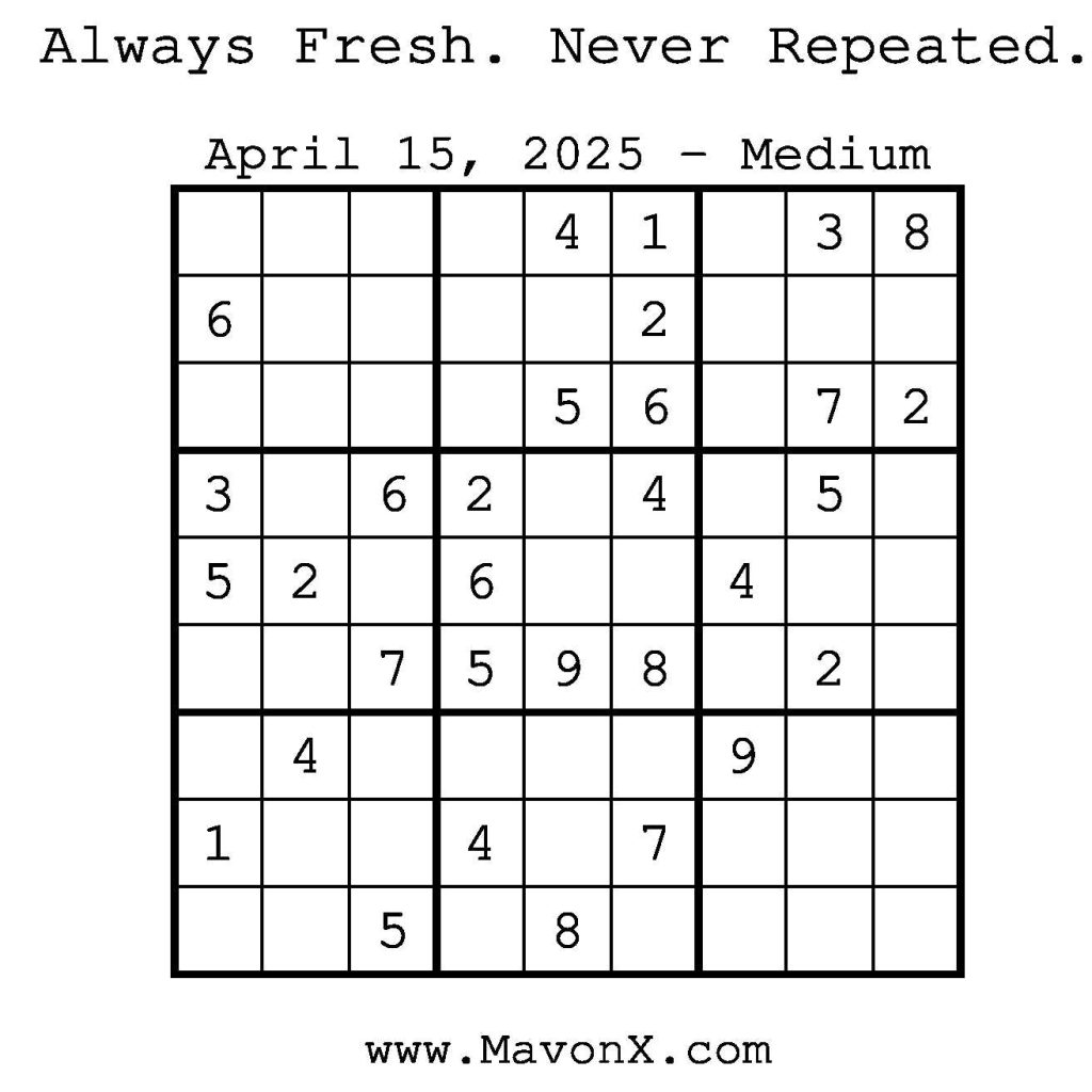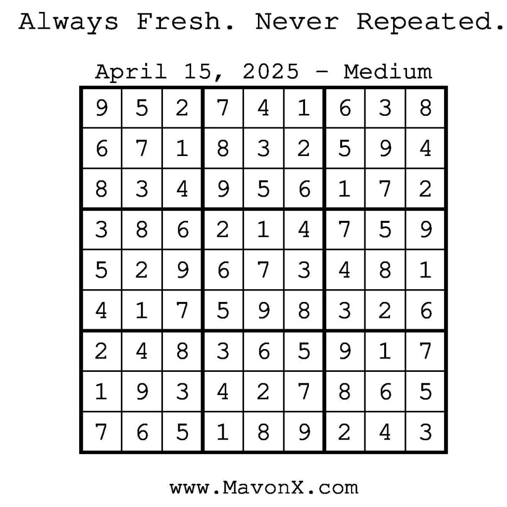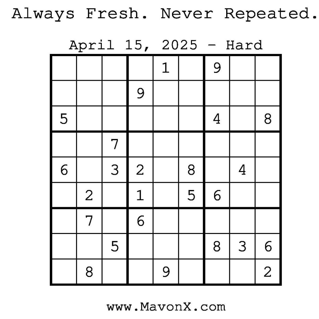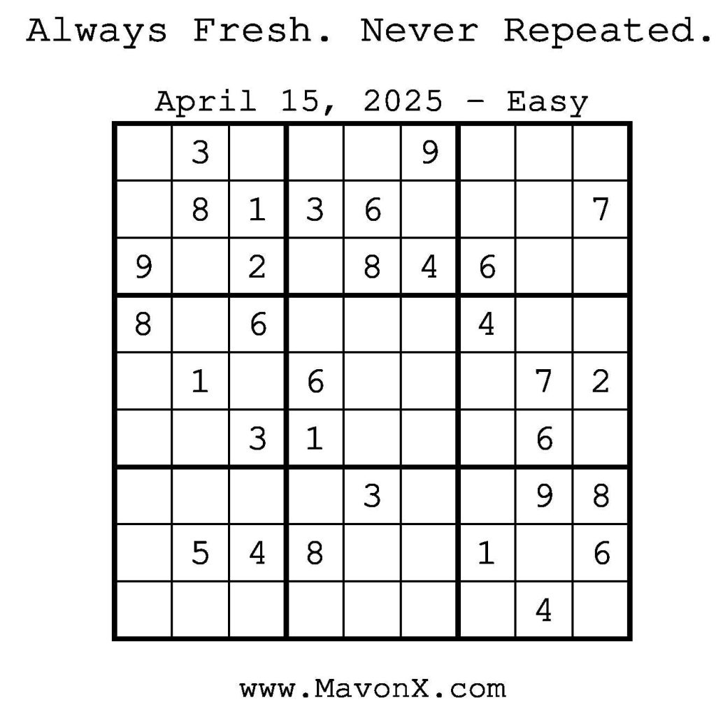 Puzzles of the Day – April 15, 2025 Post author:admin Post published:April 14, 2025 Post category:Free Stuff / Puzzle of the Day / Puzzle of the Day Solutions / Solutions Post comments:0 Comments Check out our books on Amazon! Check out our books on Barnes and Noble! Check out our books on Etsy! Easy Sudoku Coach Link Medium Sudoku Coach Link Hard Sudoku Coach Link Show Solution You Might Also Like Puzzles of the Day – January 5, 2026 January 5, 2026 Puzzles of the Day – March 1, 2026 February 28, 2026 Puzzles of the Day – August 4, 2025 August 3, 2025 Leave a Reply Cancel replyCommentEnter your name or username to comment Enter your email address to comment Enter your website URL (optional) Save my name, email, and website in this browser for the next time I comment.