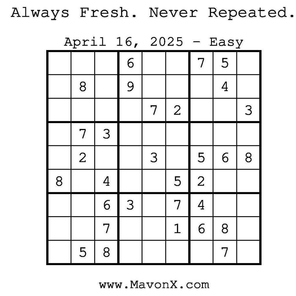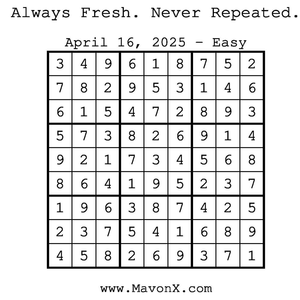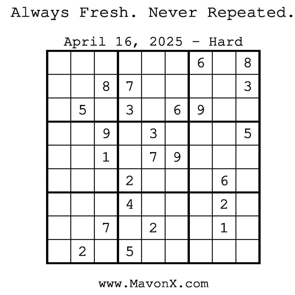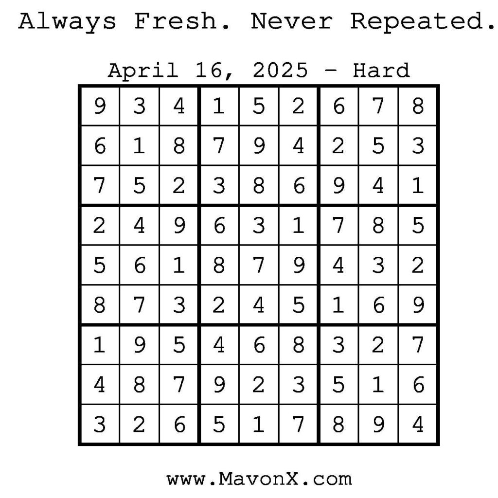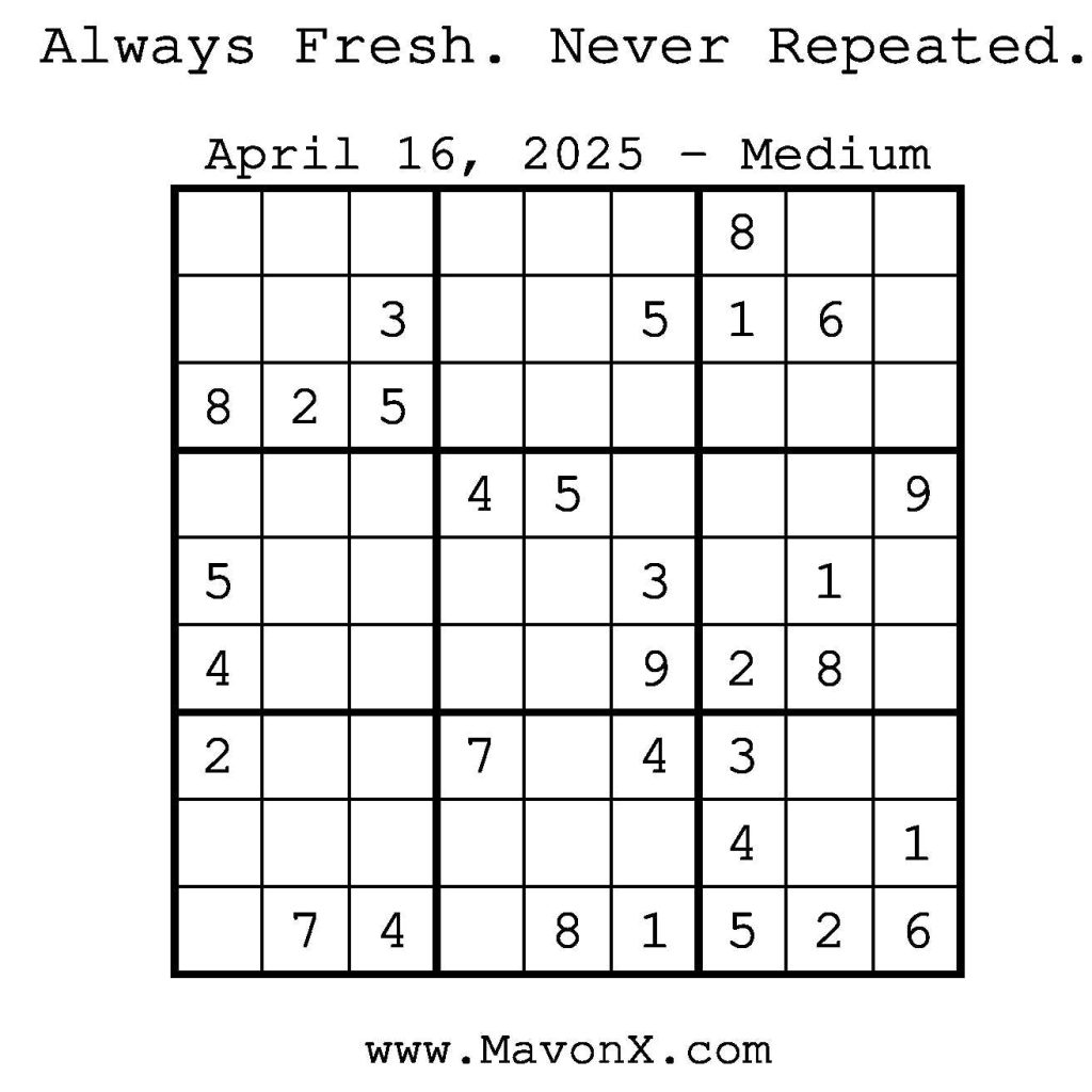 Puzzles of the Day – April 16, 2025 Post author:admin Post published:April 15, 2025 Post category:Free Stuff / Puzzle of the Day / Puzzle of the Day Solutions / Solutions Post comments:0 Comments Check out our books on Amazon! Check out our books on Barnes and Noble! Check out our books on Etsy! Easy Sudoku Coach Link Medium Sudoku Coach Link Hard Sudoku Coach Link Show Solution You Might Also Like Puzzles of the Day – February 15, 2025 February 15, 2025 Puzzles of the Day – July 24, 2025 July 24, 2025 Puzzles of the Day – October 8, 2025 October 8, 2025 Leave a Reply Cancel replyCommentEnter your name or username to comment Enter your email address to comment Enter your website URL (optional) Save my name, email, and website in this browser for the next time I comment.