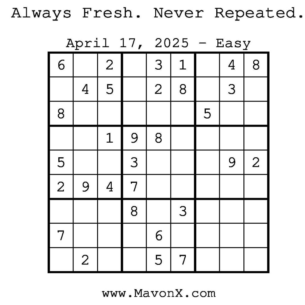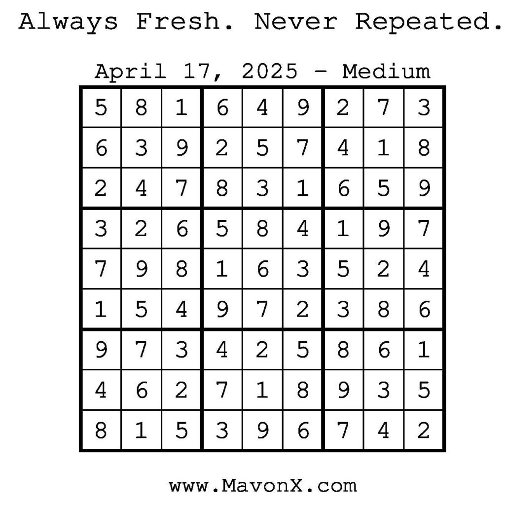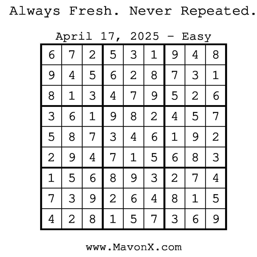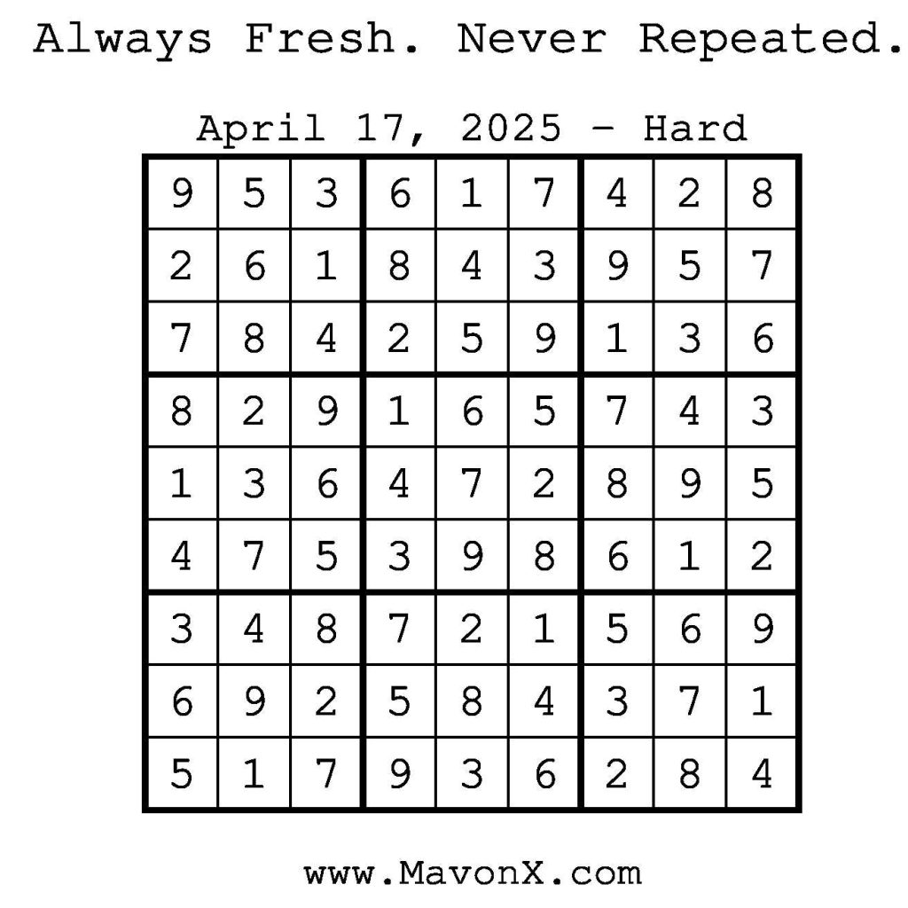 Puzzles of the Day – April 17, 2025 Post author:admin Post published:April 16, 2025 Post category:Free Stuff / Puzzle of the Day / Puzzle of the Day Solutions / Solutions Post comments:0 Comments Check out our books on Amazon! Check out our books on Barnes and Noble! Check out our books on Etsy! Easy Sudoku Coach Link Medium Sudoku Coach Link Hard Sudoku Coach Link Show Solution You Might Also Like Puzzles of the Day – February 5, 2025 February 4, 2025 Puzzles of the Day – November 20, 2024 November 19, 2024 Puzzles of the Day – December 20, 2025 December 19, 2025 Leave a Reply Cancel replyCommentEnter your name or username to comment Enter your email address to comment Enter your website URL (optional) Save my name, email, and website in this browser for the next time I comment.