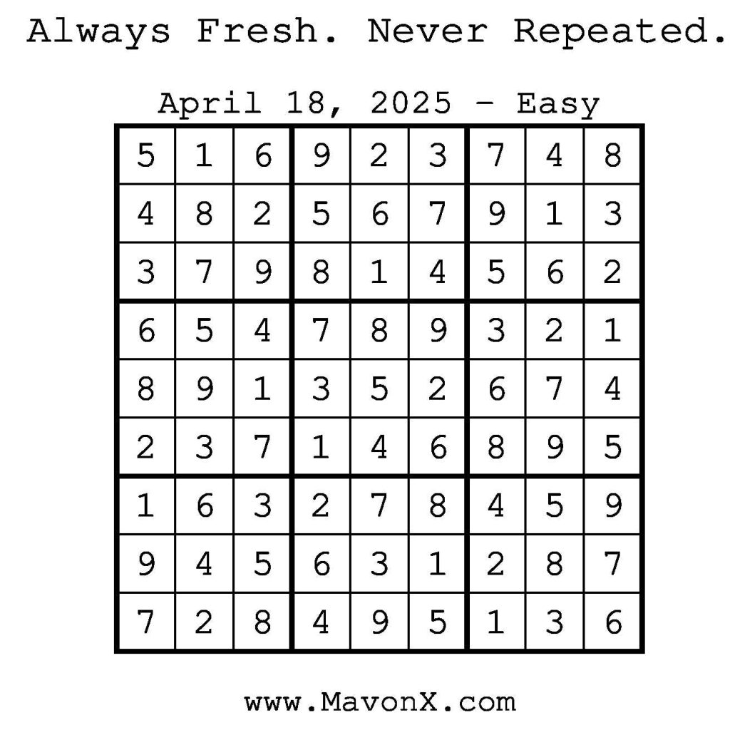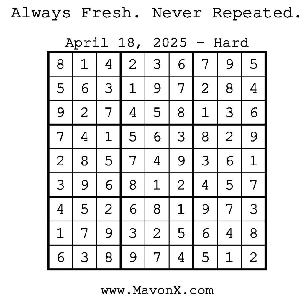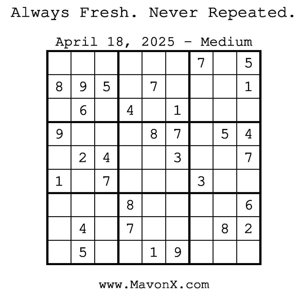 Puzzles of the Day – April 18, 2025 Post author:admin Post published:April 17, 2025 Post category:Free Stuff / Puzzle of the Day / Puzzle of the Day Solutions / Solutions Post comments:0 Comments Check out our books on Amazon! Check out our books on Barnes and Noble! Check out our books on Etsy! Easy Sudoku Coach Link Medium Sudoku Coach Link Hard Sudoku Coach Link Show Solution You Might Also Like Puzzles of the Day – May 12, 2025 May 12, 2025 Puzzles of the Day – September 13, 2024 September 13, 2024 Puzzle of the Day – July 12, 2024 July 12, 2024 Leave a Reply Cancel replyCommentEnter your name or username to comment Enter your email address to comment Enter your website URL (optional) Save my name, email, and website in this browser for the next time I comment.