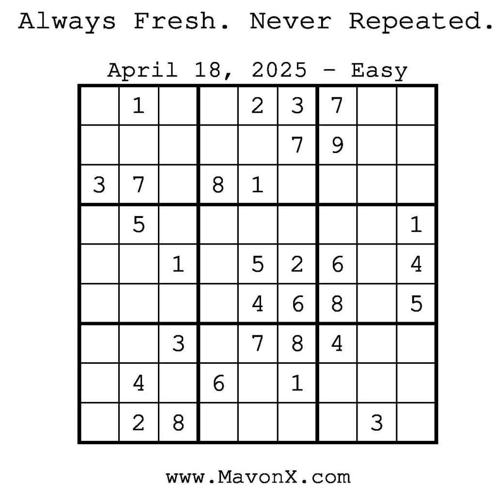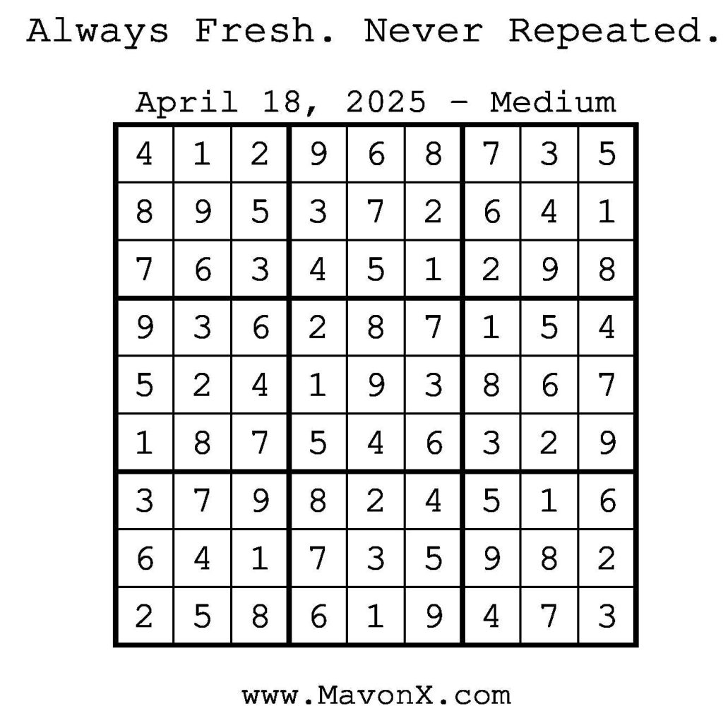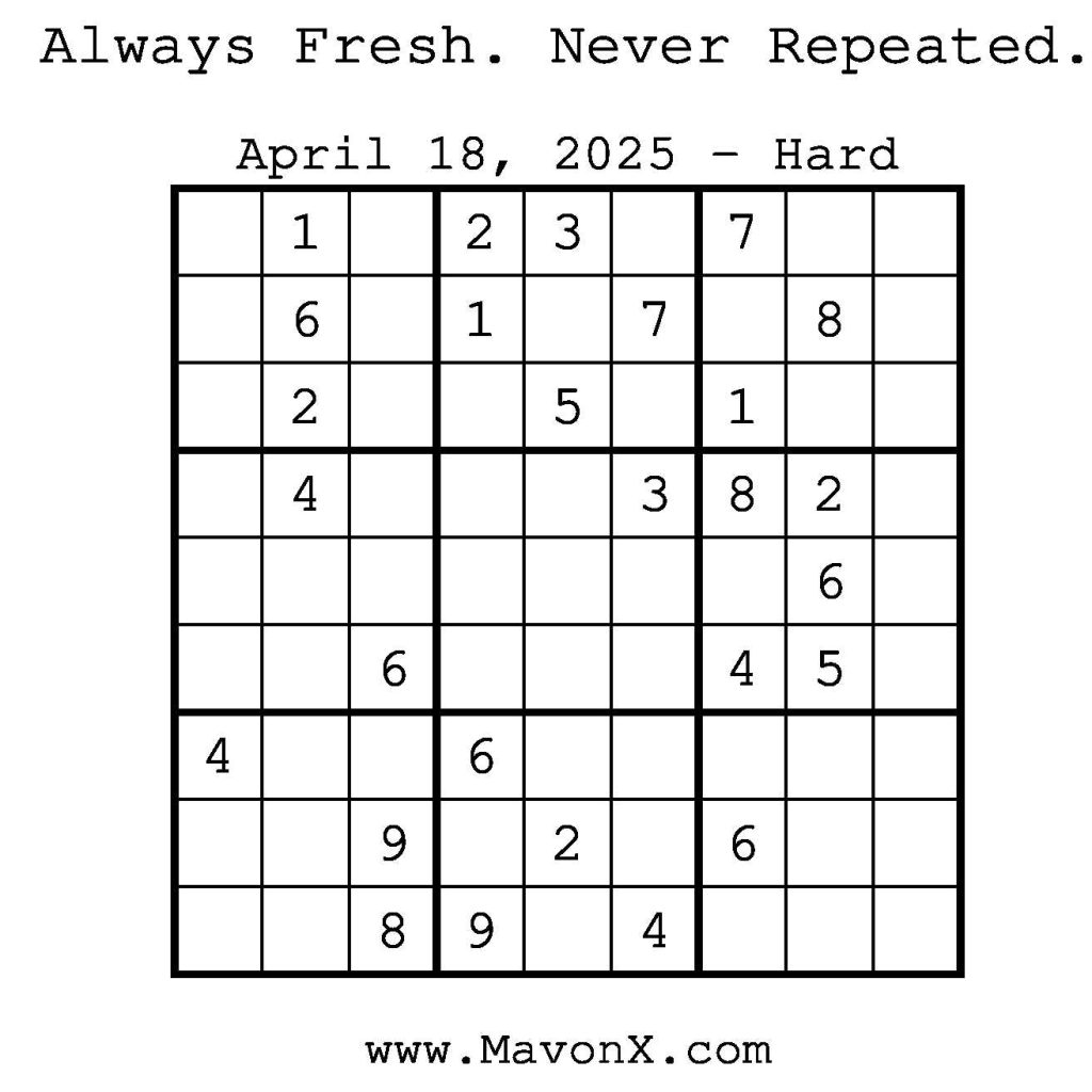 Puzzles of the Day – April 18, 2025 Post author:admin Post published:April 17, 2025 Post category:Free Stuff / Puzzle of the Day / Puzzle of the Day Solutions / Solutions Post comments:0 Comments Check out our books on Amazon! Check out our books on Barnes and Noble! Check out our books on Etsy! Easy Sudoku Coach Link Medium Sudoku Coach Link Hard Sudoku Coach Link Show Solution You Might Also Like Puzzles of the Day – May 12, 2025 May 12, 2025 Puzzles of the Day – September 13, 2024 September 13, 2024 Puzzle of the Day – July 12, 2024 July 12, 2024 Leave a Reply Cancel replyCommentEnter your name or username to comment Enter your email address to comment Enter your website URL (optional) Save my name, email, and website in this browser for the next time I comment.