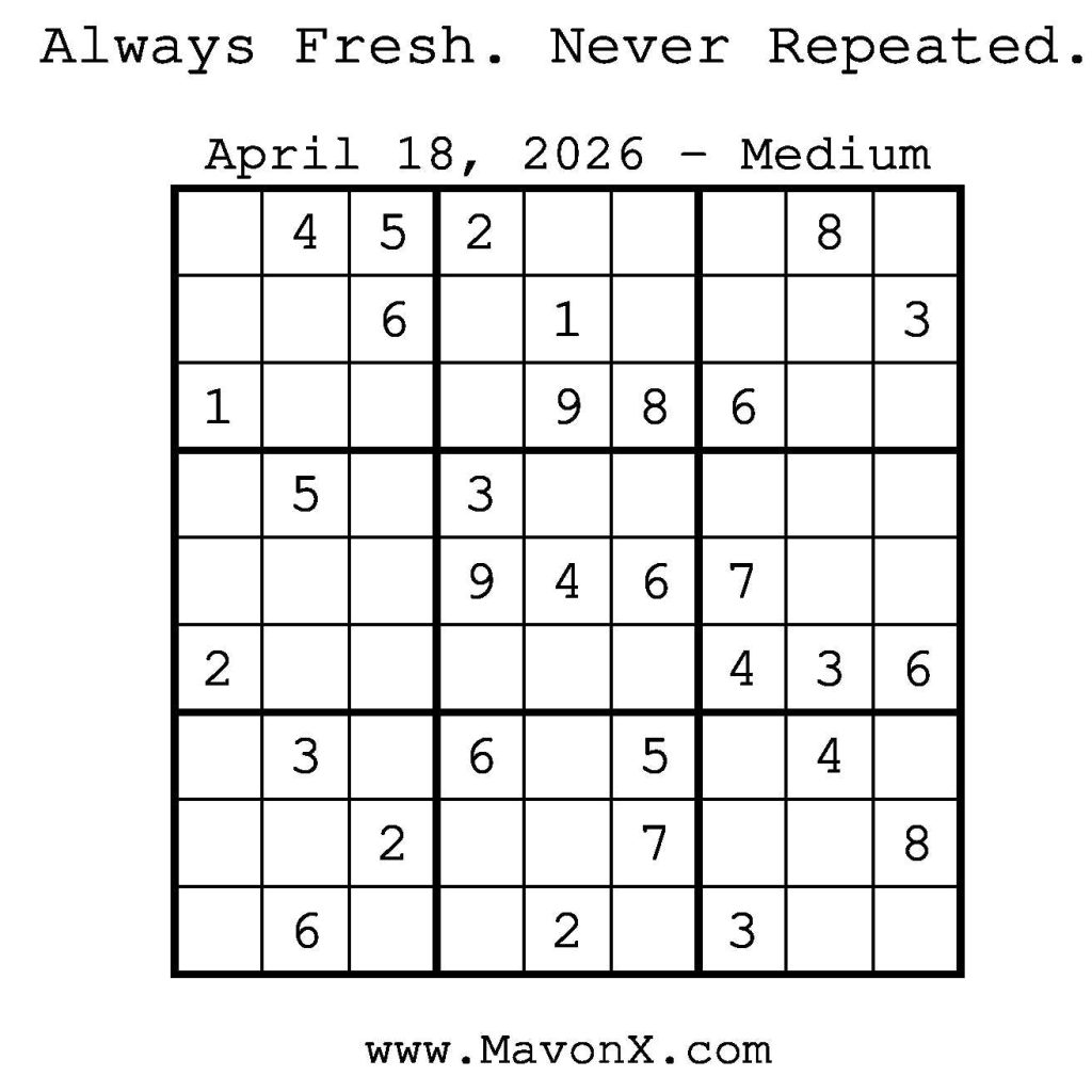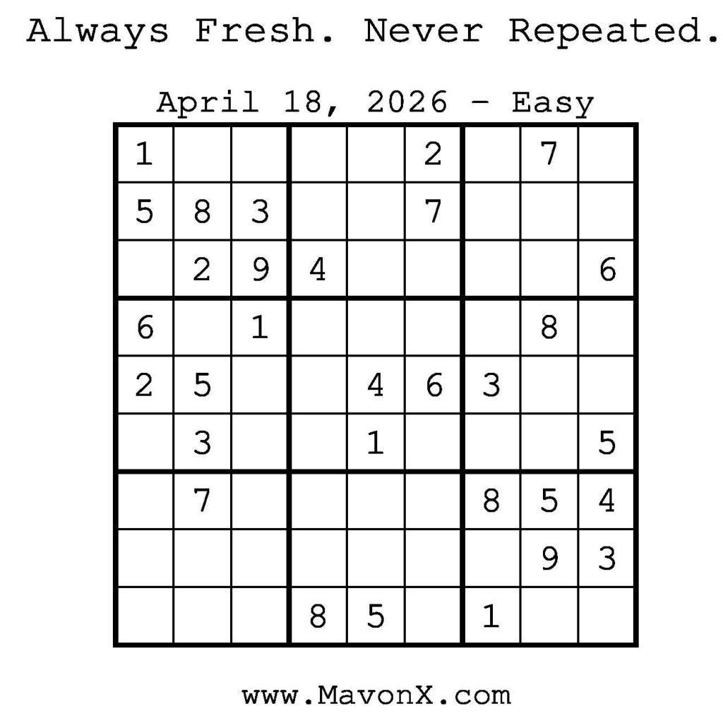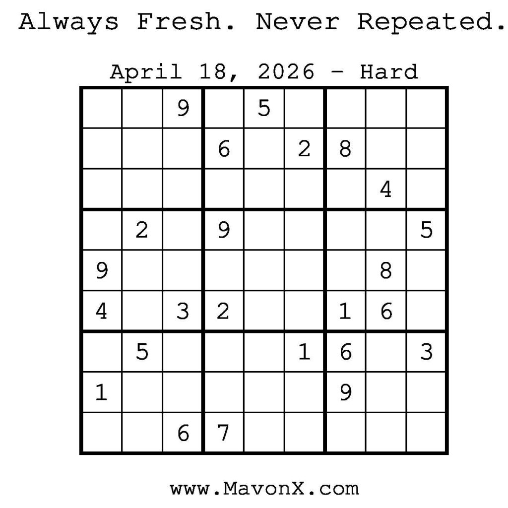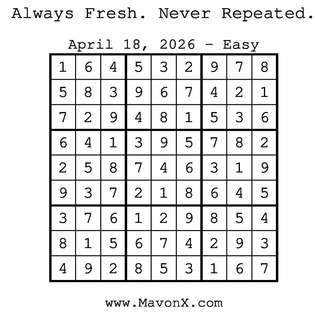 Puzzles of the Day – April 18, 202 Post author:admin Post published:April 17, 2026 Post category:Free Stuff / Puzzle of the Day / Puzzle of the Day Solutions / Solutions Post comments:0 Comments Check out our books on Amazon! Check out our books on Barnes and Noble! Check out our books on Etsy! Easy Sudoku Coach Link Medium Sudoku Coach Link Hard Sudoku Coach Link Show Solution You Might Also Like Puzzles of the Day – May 24, 2025 May 24, 2025 Puzzle of the Day – July 6, 2024 July 6, 2024 Puzzle of the Day – August 2, 2024 August 2, 2024 Leave a Reply Cancel replyCommentEnter your name or username to comment Enter your email address to comment Enter your website URL (optional) Save my name, email, and website in this browser for the next time I comment.