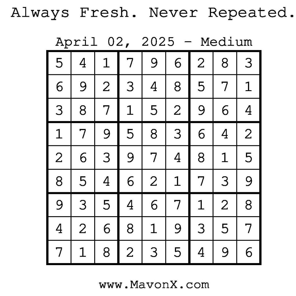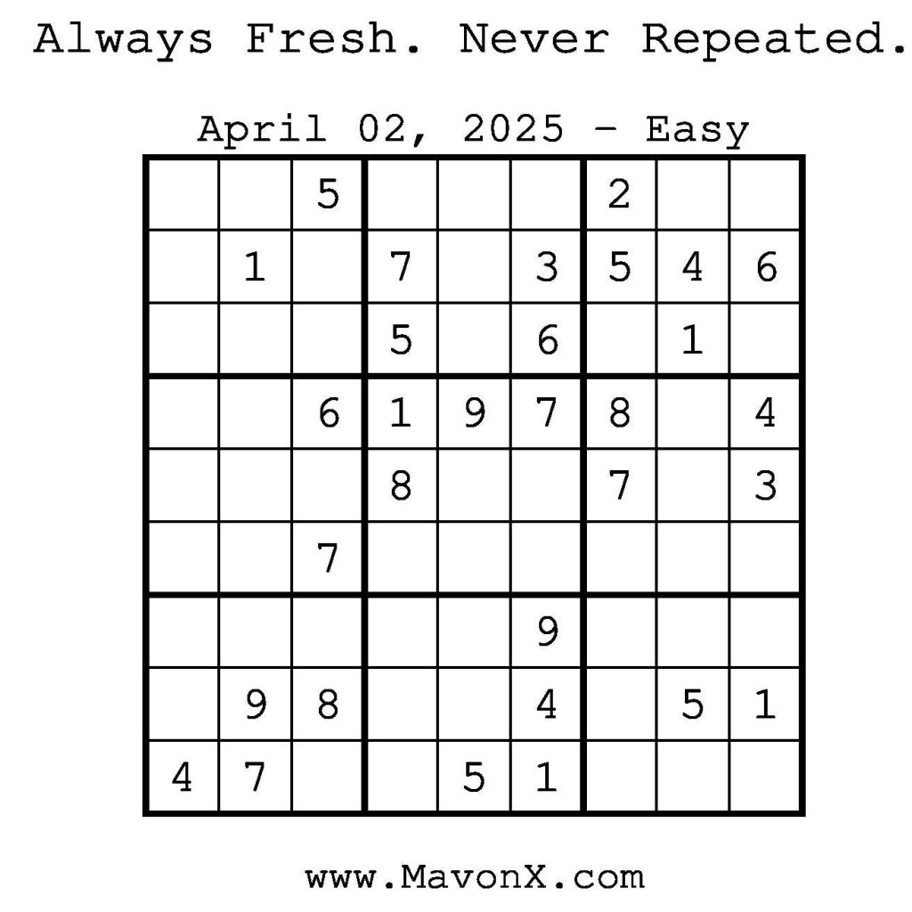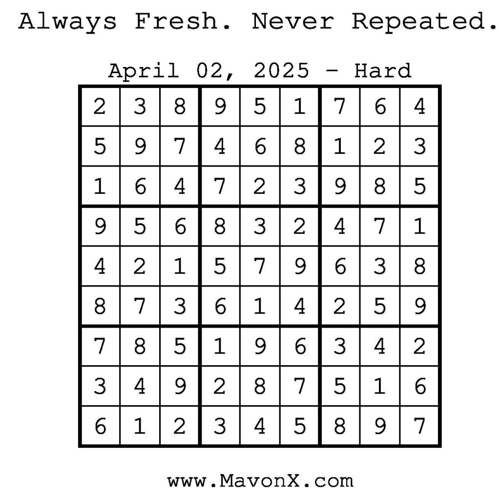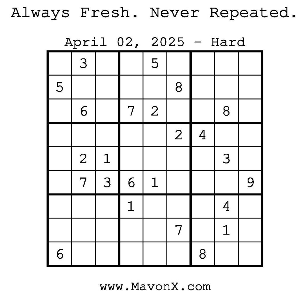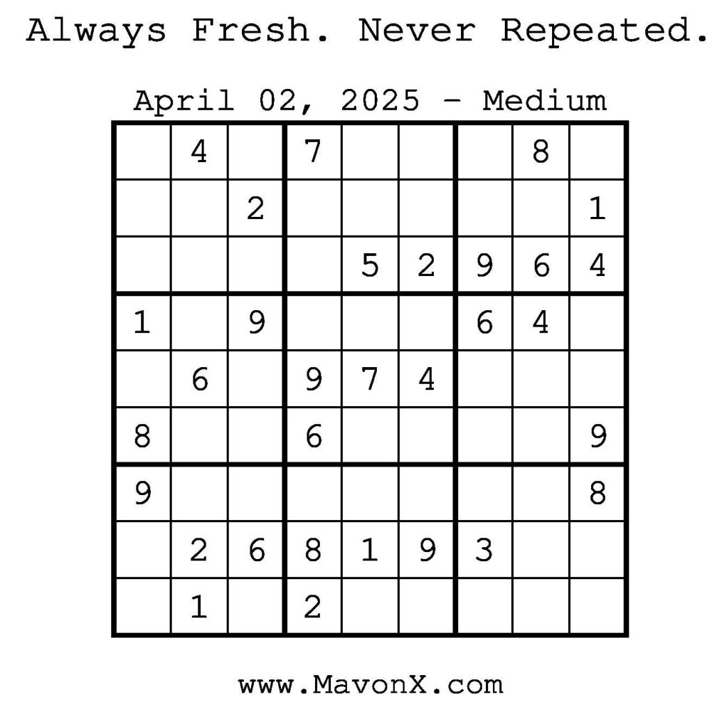 Puzzles of the Day – April 2, 2025 Post author:admin Post published:April 3, 2025 Post category:Free Stuff / Puzzle of the Day / Puzzle of the Day Solutions / Solutions Post comments:0 Comments Check out our books on Amazon! Check out our books on Barnes and Noble! Check out our books on Etsy! Easy Sudoku Coach Link Medium Sudoku Coach Link Hard Sudoku Coach Link Show Solution You Might Also Like Puzzles of the Day – November 18, 2025 November 17, 2025 Puzzles of the Day – November 18, 2024 November 19, 2024 Puzzles of the Day – January 24, 2026 January 24, 2026 Leave a Reply Cancel replyCommentEnter your name or username to comment Enter your email address to comment Enter your website URL (optional) Save my name, email, and website in this browser for the next time I comment.