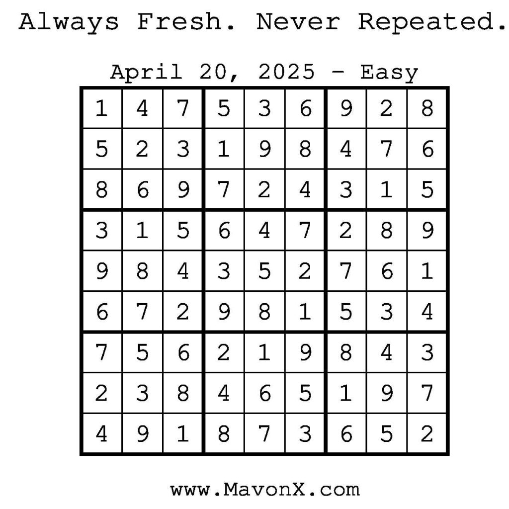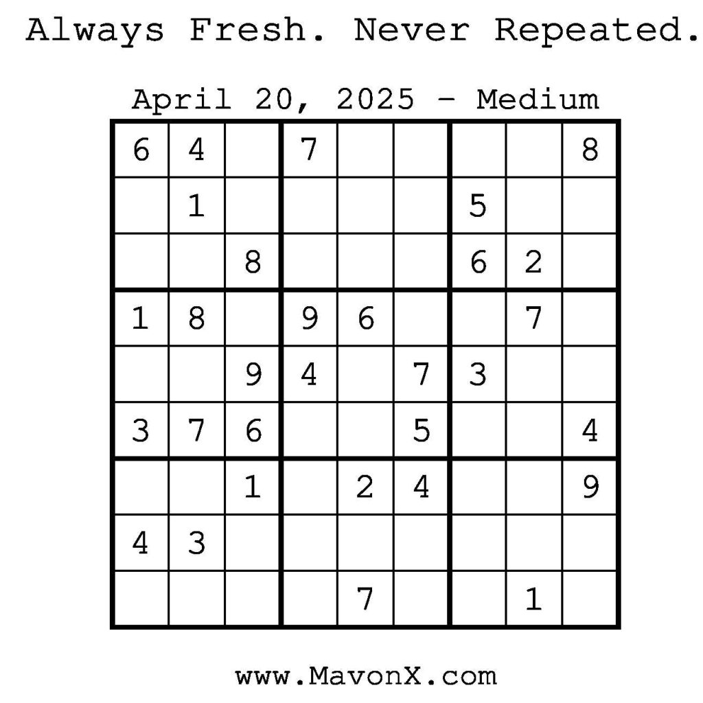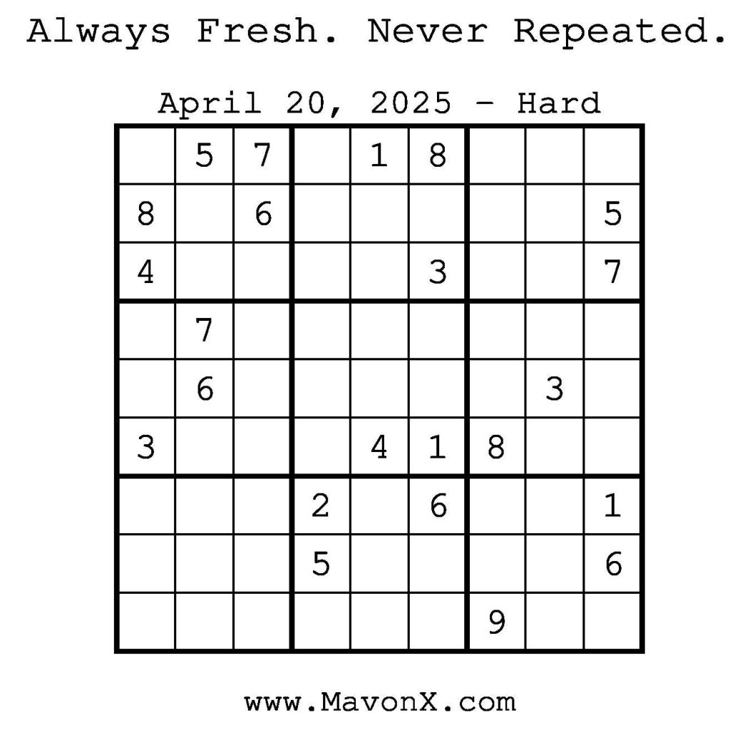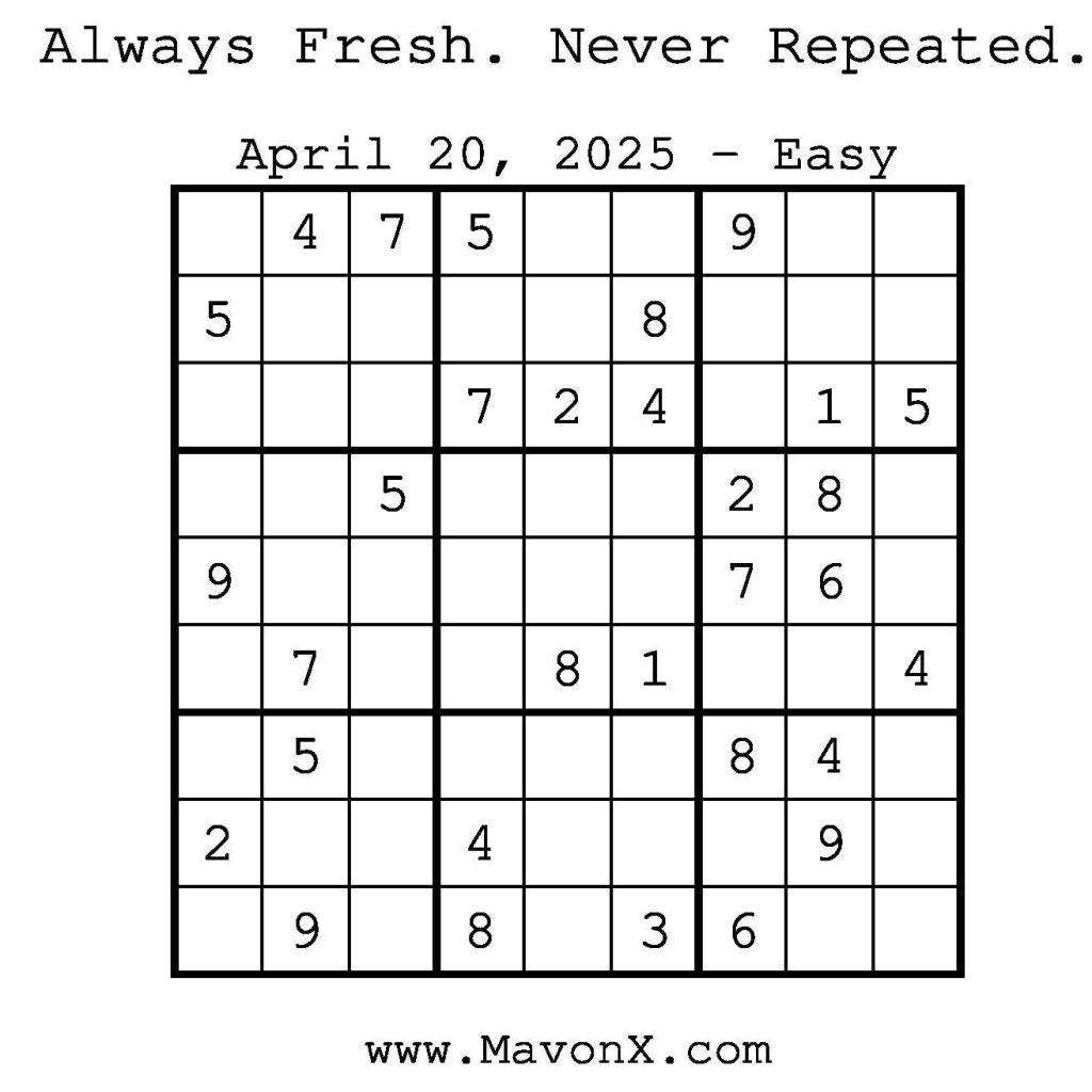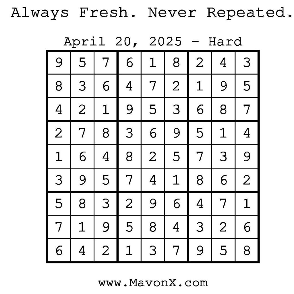 Puzzles of the Day – April 20, 2025 Post author:admin Post published:April 19, 2025 Post category:Free Stuff / Puzzle of the Day / Puzzle of the Day Solutions / Solutions Post comments:0 Comments Check out our books on Amazon! Check out our books on Barnes and Noble! Check out our books on Etsy! Easy Sudoku Coach Link Medium Sudoku Coach Link Hard Sudoku Coach Link Show Solution You Might Also Like Puzzles of the Day – October 24, 2025 October 23, 2025 Puzzles of the Day – October 30, 2025 October 29, 2025 Puzzles of the Day – November 22, 2025 November 21, 2025 Leave a Reply Cancel replyCommentEnter your name or username to comment Enter your email address to comment Enter your website URL (optional) Save my name, email, and website in this browser for the next time I comment.