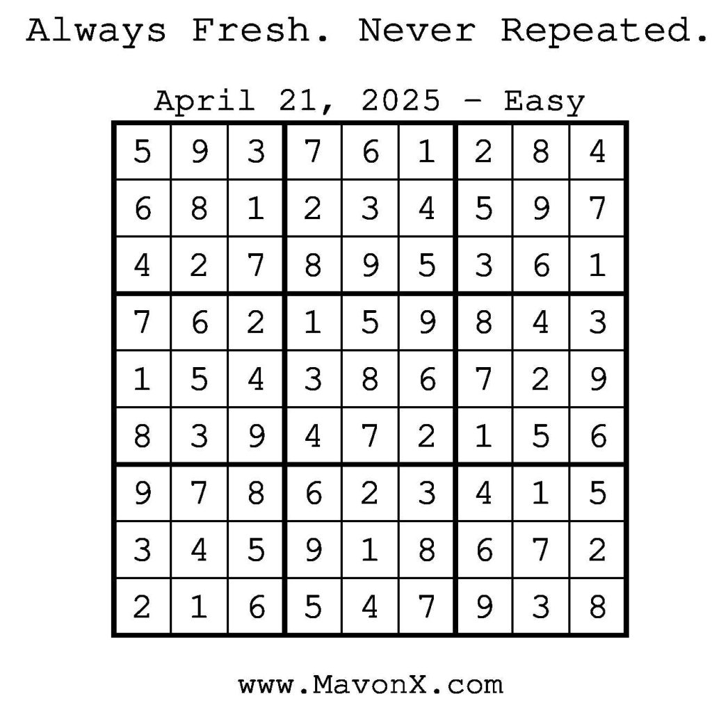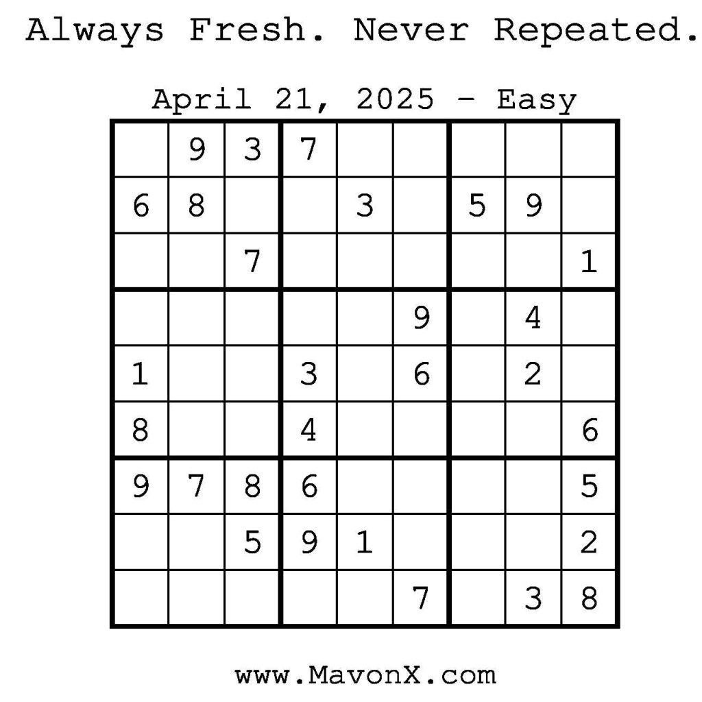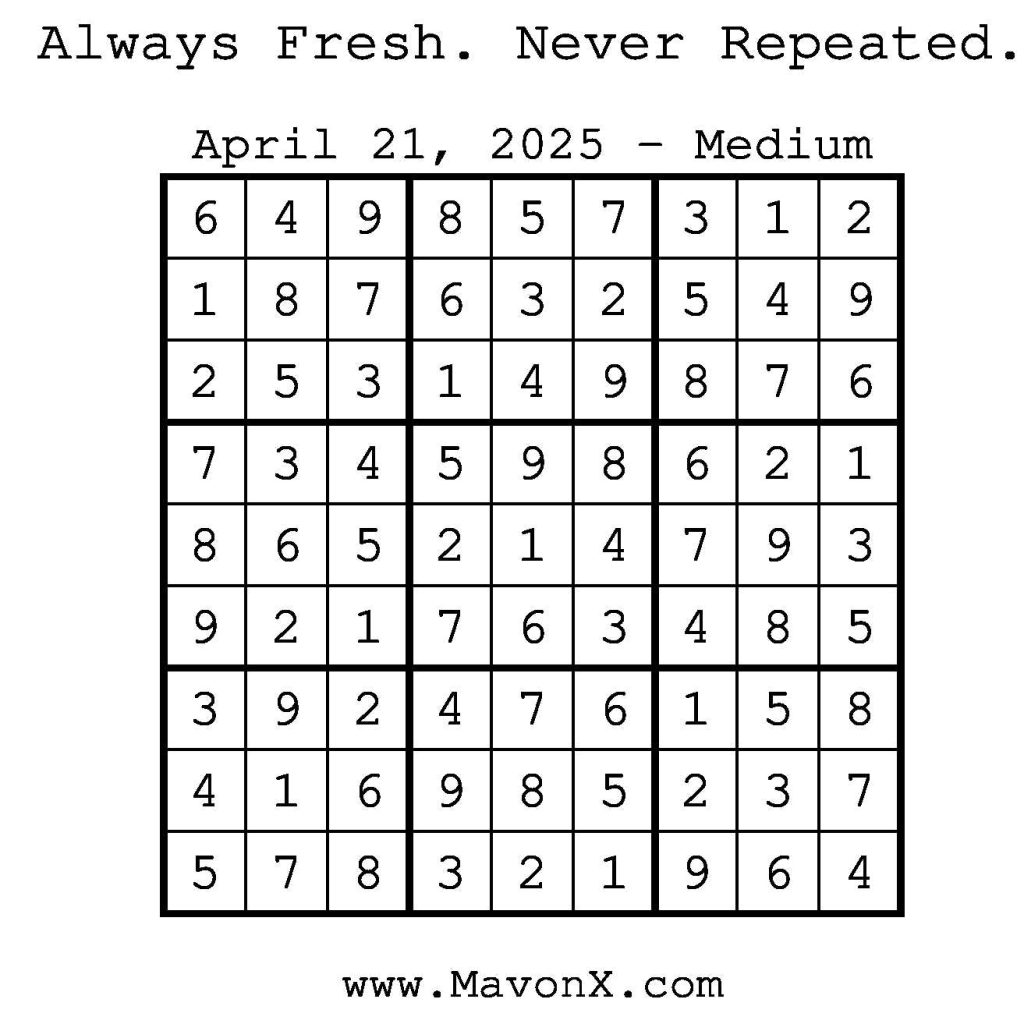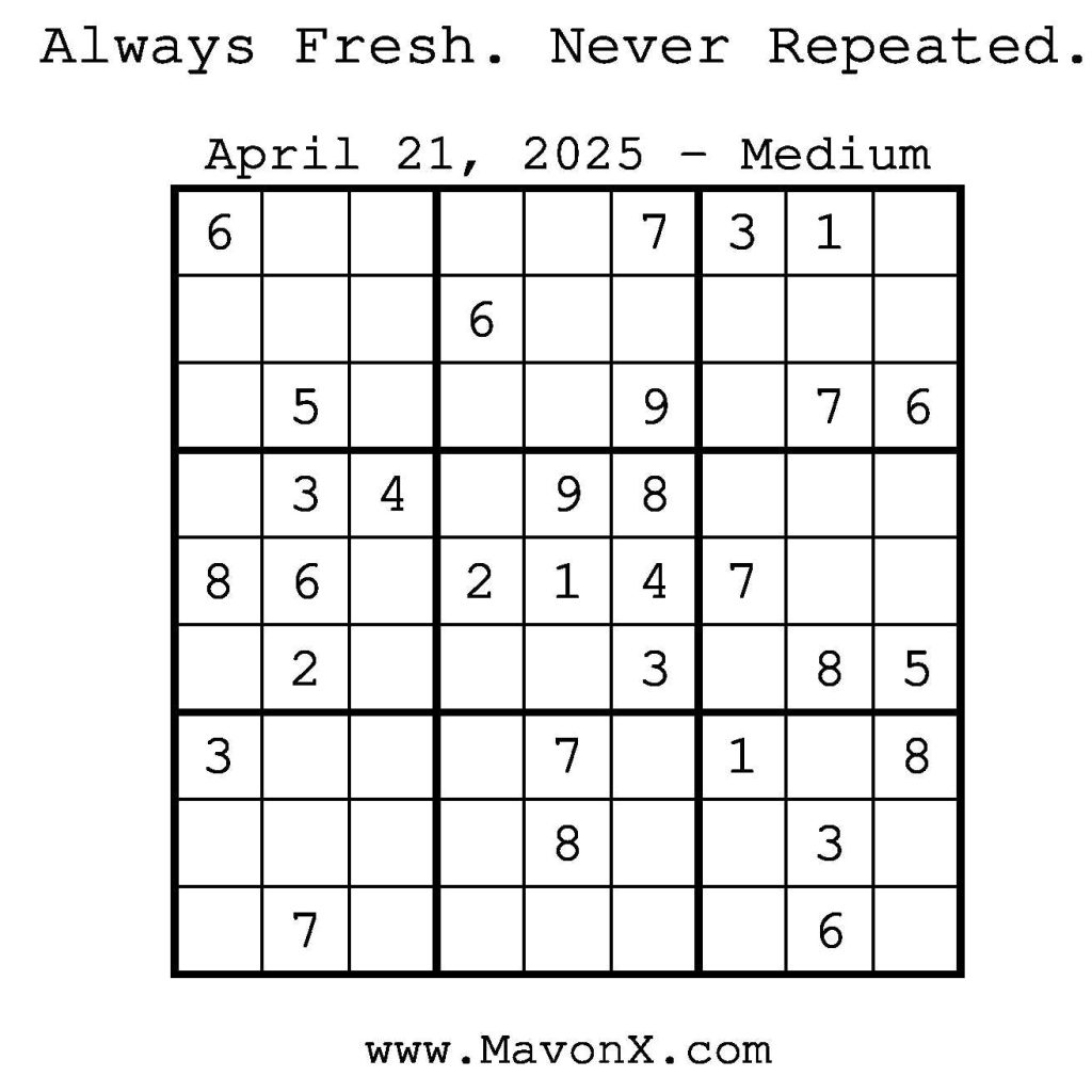 Puzzles of the Day – April 21, 2025 Post author:admin Post published:April 21, 2025 Post category:Free Stuff / Puzzle of the Day / Puzzle of the Day Solutions / Solutions Post comments:0 Comments Check out our books on Amazon! Check out our books on Barnes and Noble! Check out our books on Etsy! Easy Sudoku Coach Link Medium Sudoku Coach Link Hard Sudoku Coach Link Show Solution You Might Also Like Puzzles of the Day – September 8, 2024 September 8, 2024 Puzzle of the Day – July 6, 2024 July 6, 2024 Puzzles of the Day – May 24, 2025 May 24, 2025 Leave a Reply Cancel replyCommentEnter your name or username to comment Enter your email address to comment Enter your website URL (optional) Save my name, email, and website in this browser for the next time I comment.
