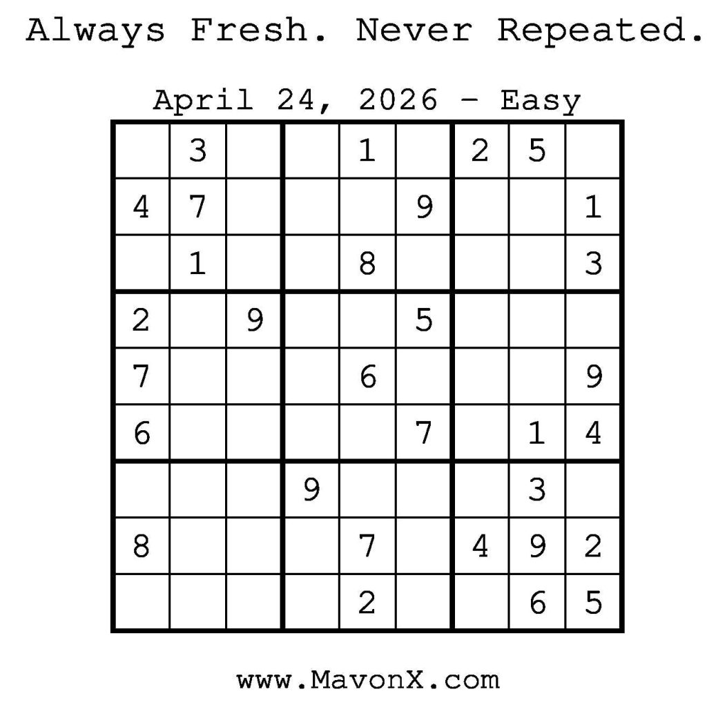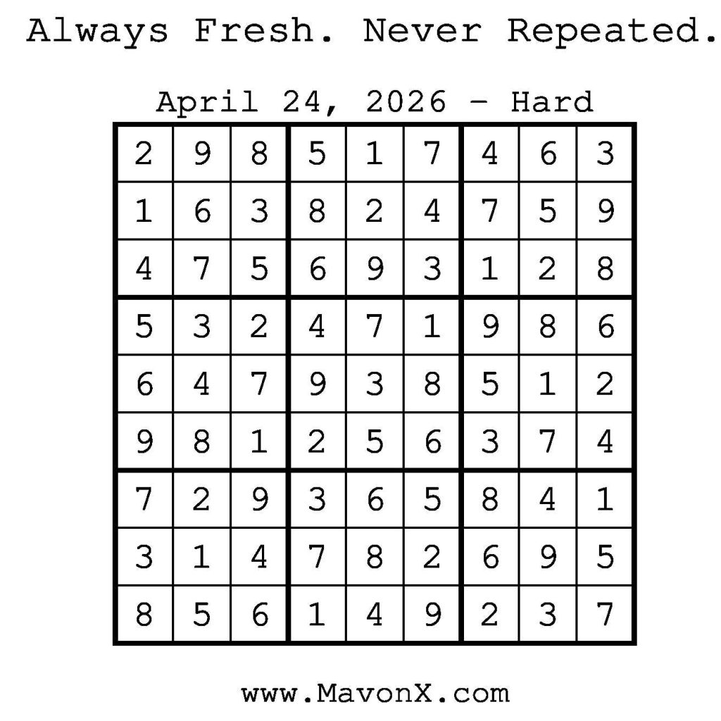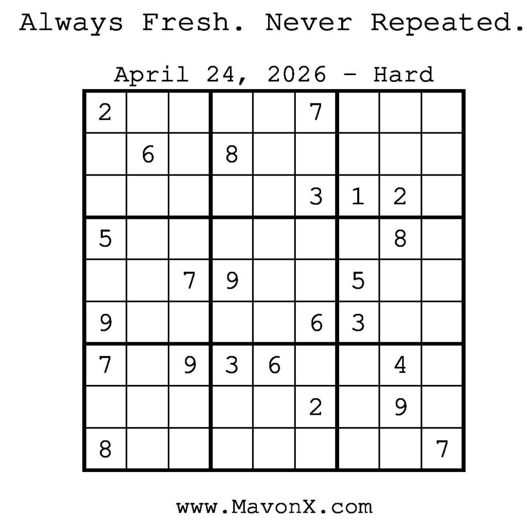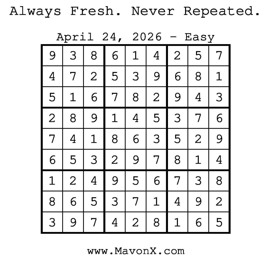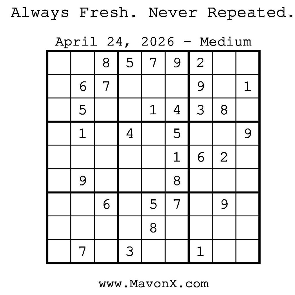 Puzzles of the Day – April 24, 2026 Post author:admin Post published:April 23, 2026 Post category:Free Stuff / Puzzle of the Day / Puzzle of the Day Solutions / Solutions Post comments:0 Comments Check out our books on Amazon! Check out our books on Barnes and Noble! Check out our books on Etsy! Easy Sudoku Coach Link Medium Sudoku Coach Link Hard Sudoku Coach Link Show Solution You Might Also Like Puzzles of the Day – April 12, 2026 April 12, 2026 Puzzles of the Day – May 31, 2025 May 30, 2025 Puzzle of the Day – July 30, 2024 July 30, 2024 Leave a Reply Cancel replyCommentEnter your name or username to comment Enter your email address to comment Enter your website URL (optional) Save my name, email, and website in this browser for the next time I comment.