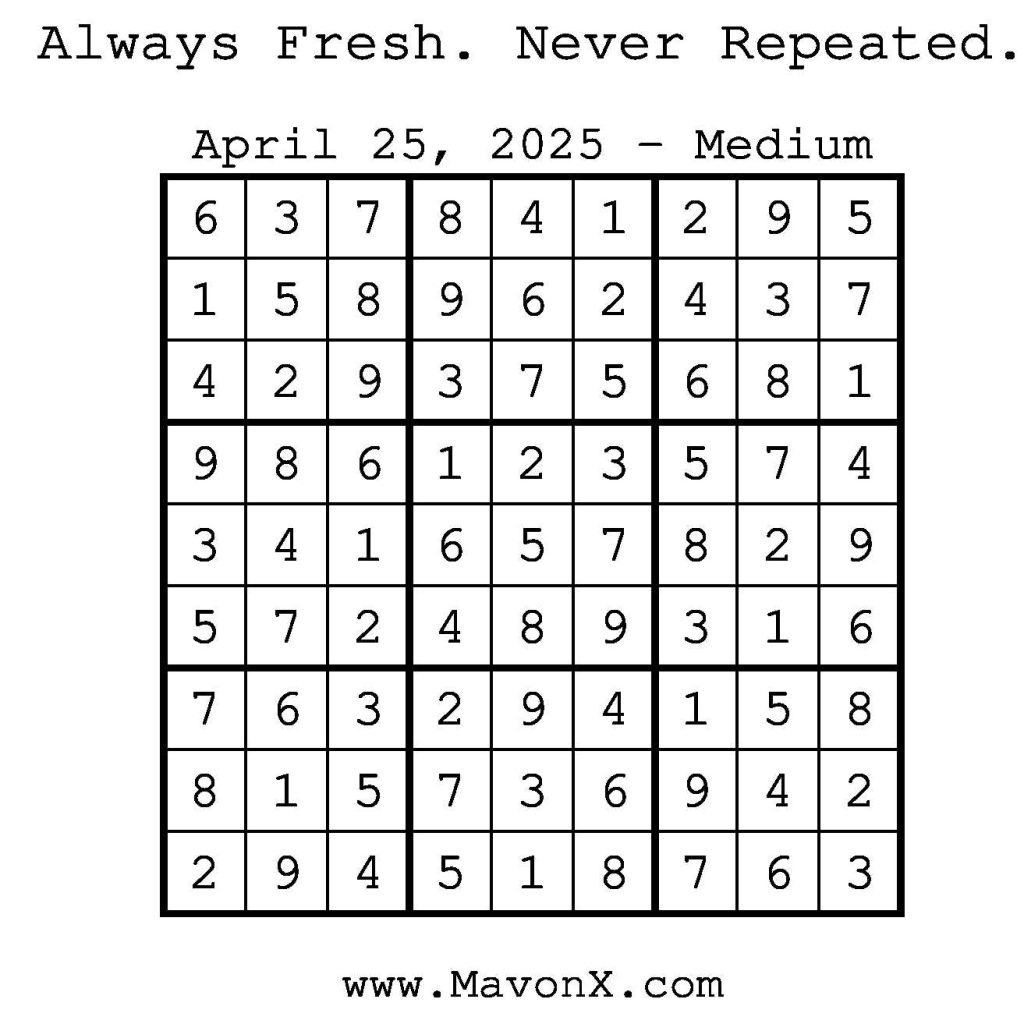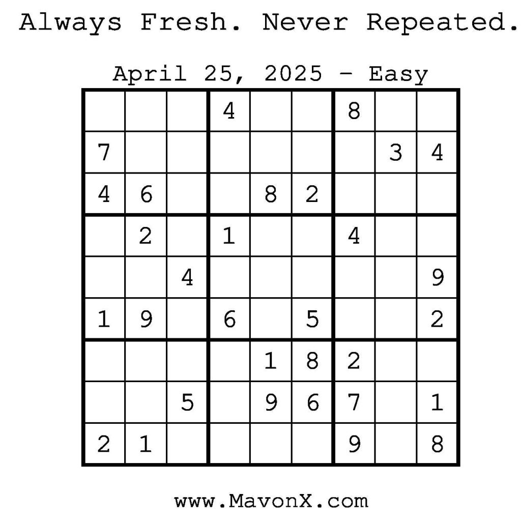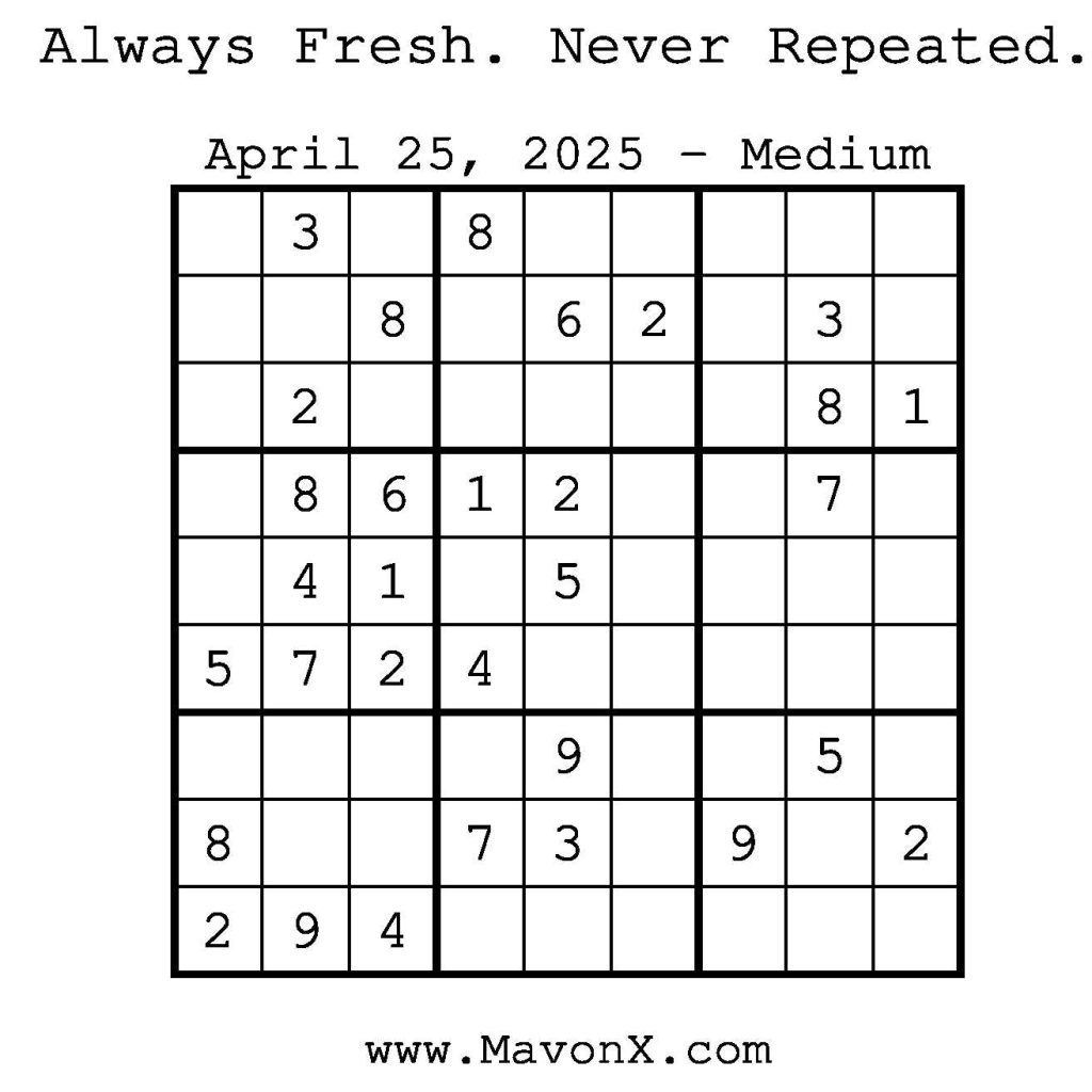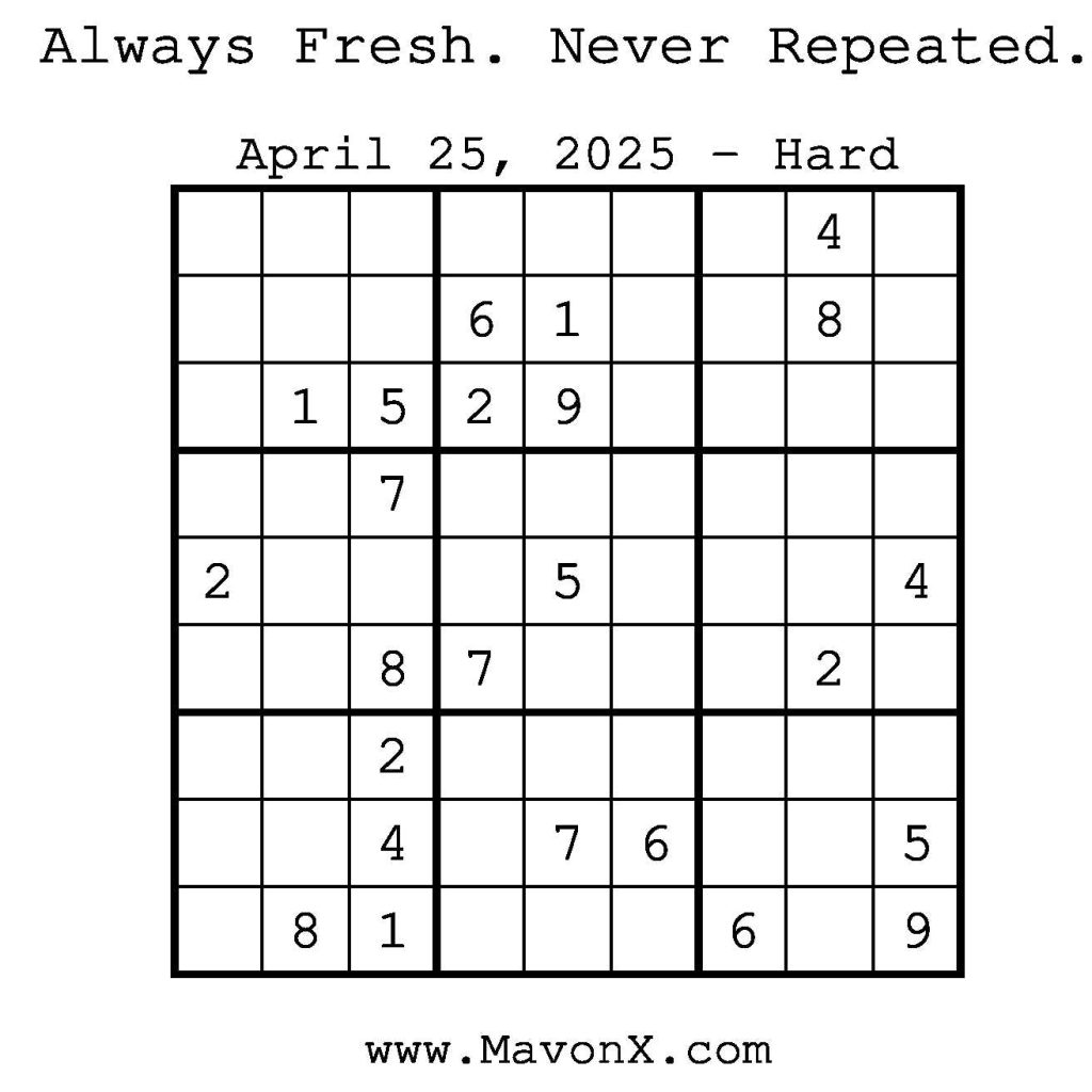 Puzzles of the Day – April 25, 2025 Post author:admin Post published:April 24, 2025 Post category:Free Stuff / Puzzle of the Day / Puzzle of the Day Solutions / Solutions Post comments:0 Comments Check out our books on Amazon! Check out our books on Barnes and Noble! Check out our books on Etsy! Easy Sudoku Coach Link Medium Sudoku Coach Link Hard Sudoku Coach Link Show Solution You Might Also Like Puzzles of the Day – April 21, 2025 April 21, 2025 Puzzles of the Day – March 31, 2025 March 31, 2025 Puzzles of the Day – January 14, 2025 January 14, 2025 Leave a Reply Cancel replyCommentEnter your name or username to comment Enter your email address to comment Enter your website URL (optional) Save my name, email, and website in this browser for the next time I comment.