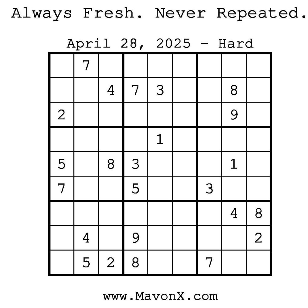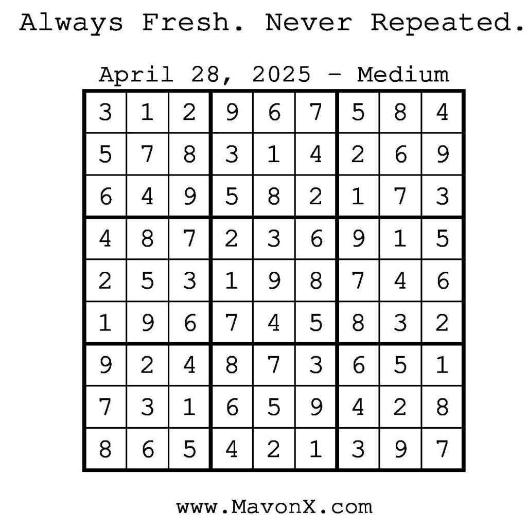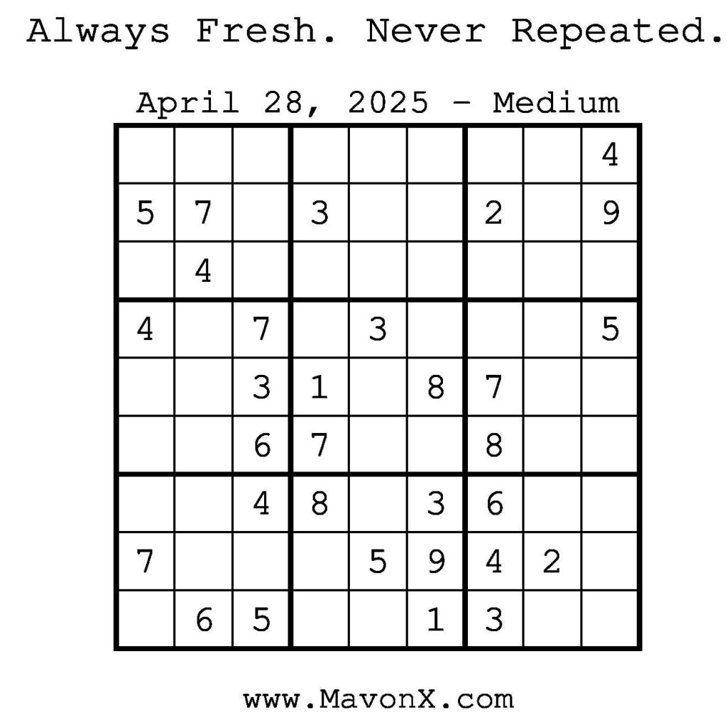 Puzzles of the Day – April 28, 2025 Post author:admin Post published:April 28, 2025 Post category:Free Stuff / Puzzle of the Day / Puzzle of the Day Solutions / Solutions Post comments:0 Comments Check out our books on Amazon! Check out our books on Barnes and Noble! Check out our books on Etsy! Easy Sudoku Coach Link Medium Sudoku Coach Link Hard Sudoku Coach Link Show Solution You Might Also Like Puzzles of the Day – November 21, 2025 November 20, 2025 Puzzles of the Day – May 24, 2025 May 24, 2025 Puzzles of the Day – February 16, 2025 February 16, 2025 Leave a Reply Cancel replyCommentEnter your name or username to comment Enter your email address to comment Enter your website URL (optional) Save my name, email, and website in this browser for the next time I comment.