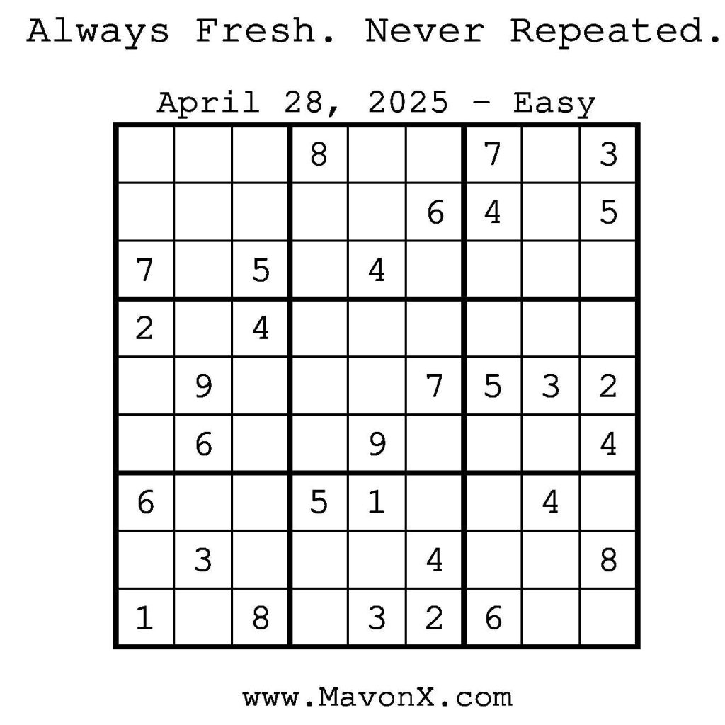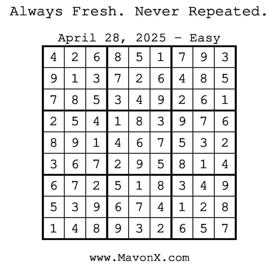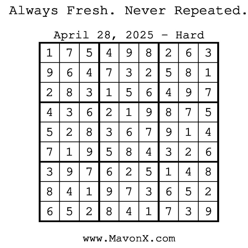 Puzzles of the Day – April 28, 2025 Post author:admin Post published:April 28, 2025 Post category:Free Stuff / Puzzle of the Day / Puzzle of the Day Solutions / Solutions Post comments:0 Comments Check out our books on Amazon! Check out our books on Barnes and Noble! Check out our books on Etsy! Easy Sudoku Coach Link Medium Sudoku Coach Link Hard Sudoku Coach Link Show Solution You Might Also Like Puzzles of the Day – November 21, 2025 November 20, 2025 Puzzles of the Day – May 24, 2025 May 24, 2025 Puzzles of the Day – February 16, 2025 February 16, 2025 Leave a Reply Cancel replyCommentEnter your name or username to comment Enter your email address to comment Enter your website URL (optional) Save my name, email, and website in this browser for the next time I comment.