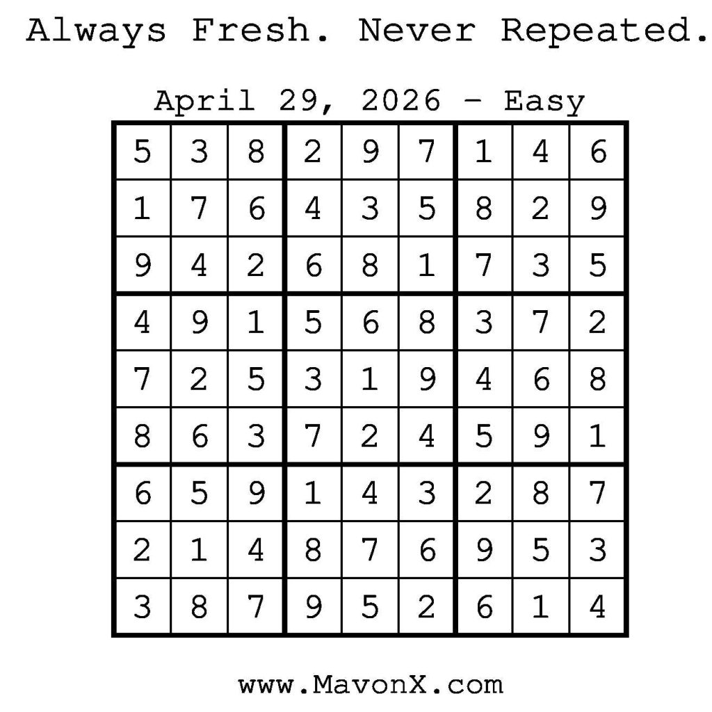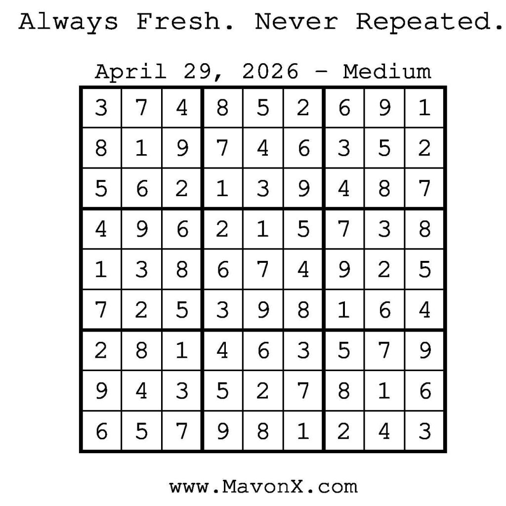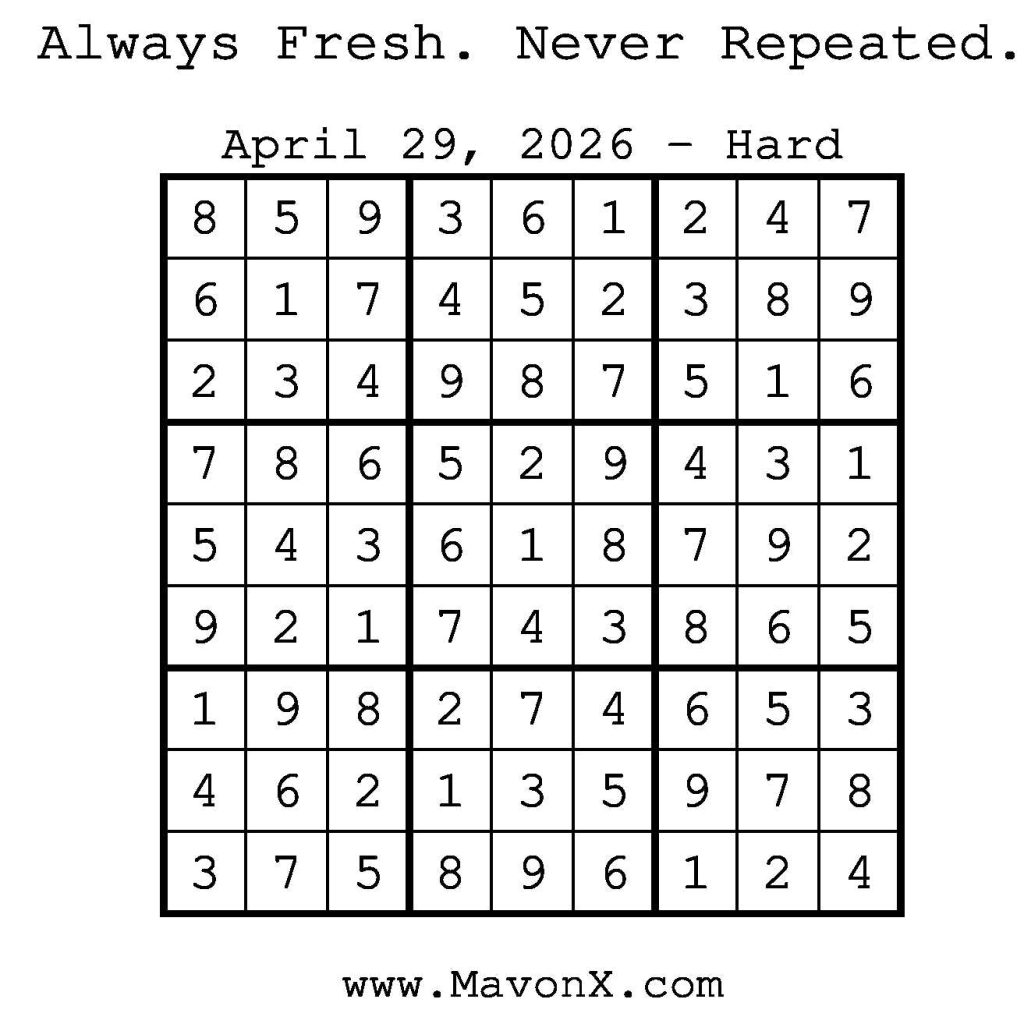 Puzzles of the Day – April 29, 2026 Post author:admin Post published:April 28, 2026 Post category:Free Stuff / Puzzle of the Day / Puzzle of the Day Solutions / Solutions Post comments:0 Comments Check out our books on Amazon! Check out our books on Barnes and Noble! Check out our books on Etsy! Easy Sudoku Coach Link Medium Sudoku Coach Link Hard Sudoku Coach Link Show Solution You Might Also Like Puzzles of the Day – July 29, 2025 July 29, 2025 Puzzles of the Day – September 5, 2024 September 5, 2024 Puzzles of the Day – February 27, 2025 February 26, 2025 Leave a Reply Cancel replyCommentEnter your name or username to comment Enter your email address to comment Enter your website URL (optional) Save my name, email, and website in this browser for the next time I comment.