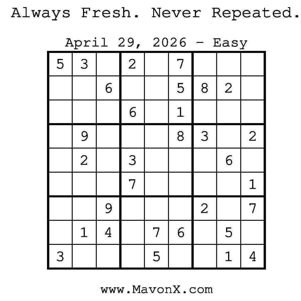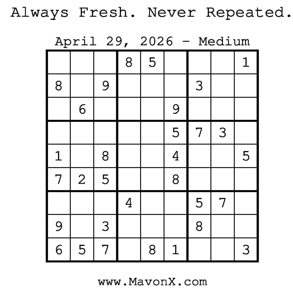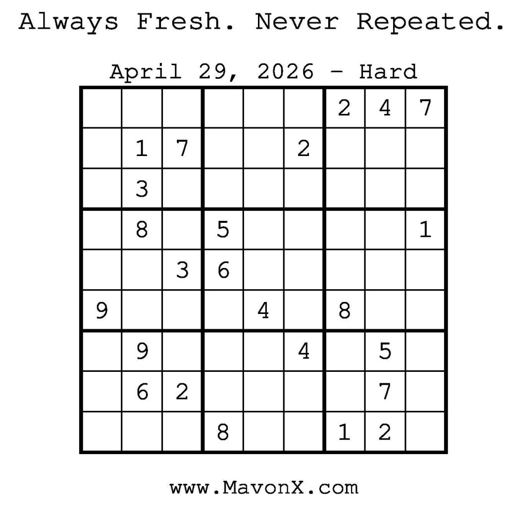 Puzzles of the Day – April 29, 2026 Post author:admin Post published:April 28, 2026 Post category:Free Stuff / Puzzle of the Day / Puzzle of the Day Solutions / Solutions Post comments:0 Comments Check out our books on Amazon! Check out our books on Barnes and Noble! Check out our books on Etsy! Easy Sudoku Coach Link Medium Sudoku Coach Link Hard Sudoku Coach Link Show Solution You Might Also Like Puzzles of the Day – July 29, 2025 July 29, 2025 Puzzles of the Day – September 5, 2024 September 5, 2024 Puzzles of the Day – February 27, 2025 February 26, 2025 Leave a Reply Cancel replyCommentEnter your name or username to comment Enter your email address to comment Enter your website URL (optional) Save my name, email, and website in this browser for the next time I comment.