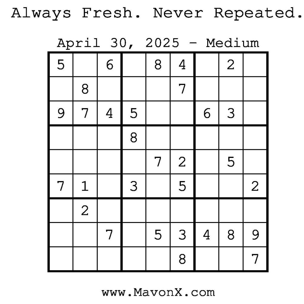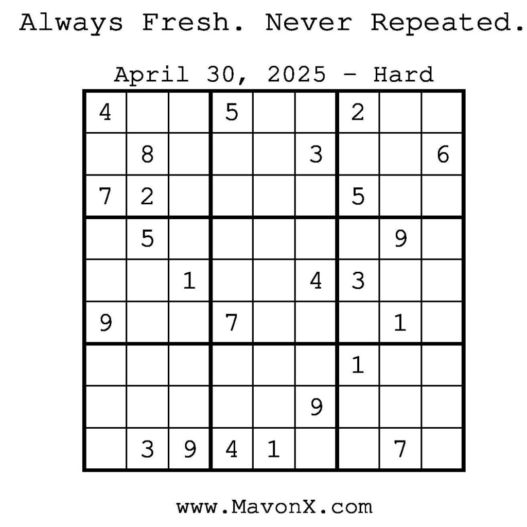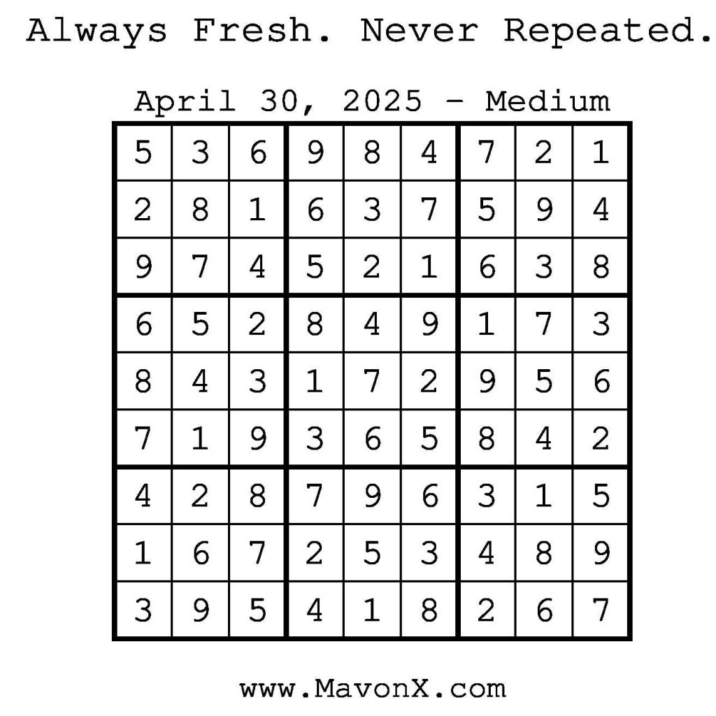 Puzzles of the Day – April 30, 2025 Post author:admin Post published:April 29, 2025 Post category:Free Stuff / Puzzle of the Day / Puzzle of the Day Solutions / Solutions Post comments:0 Comments Check out our books on Amazon! Check out our books on Barnes and Noble! Check out our books on Etsy! Easy Sudoku Coach Link Medium Sudoku Coach Link Hard Sudoku Coach Link Show Solution You Might Also Like Puzzles of the Day – November 29, 2025 November 29, 2025 Puzzles of the Day – December 13, 2024 December 12, 2024 Puzzles of the Day – June 20, 2025 June 20, 2025 Leave a Reply Cancel replyCommentEnter your name or username to comment Enter your email address to comment Enter your website URL (optional) Save my name, email, and website in this browser for the next time I comment.