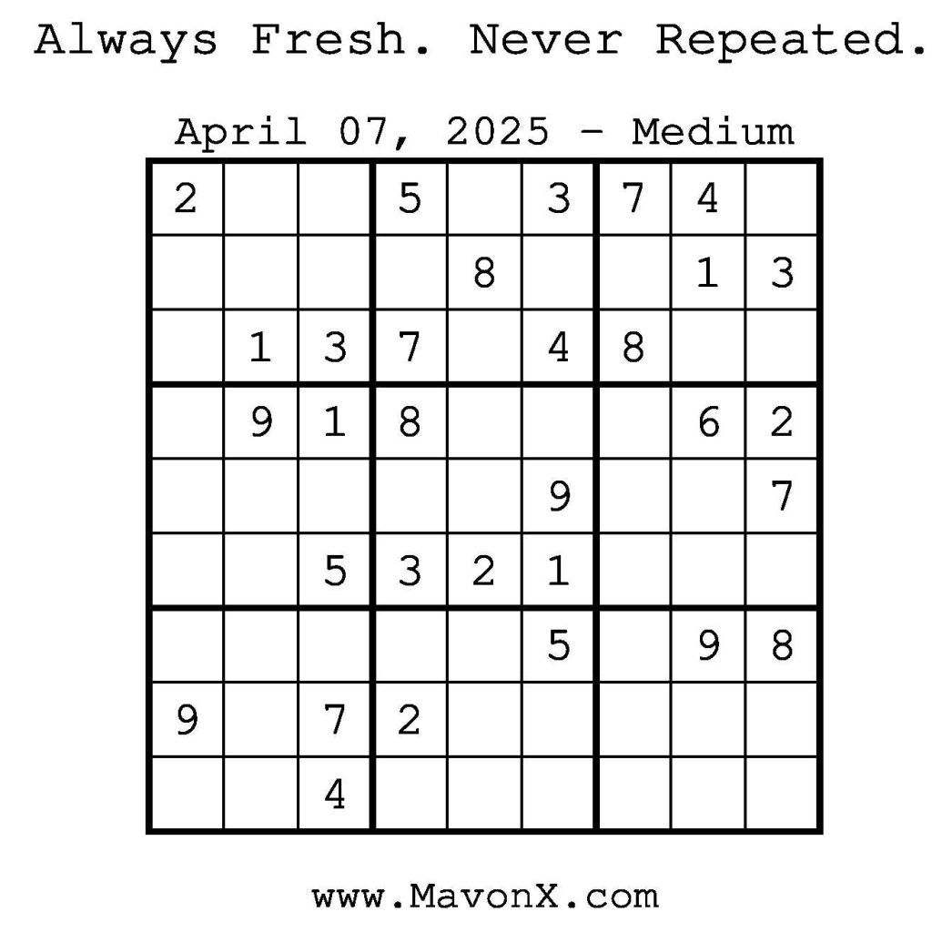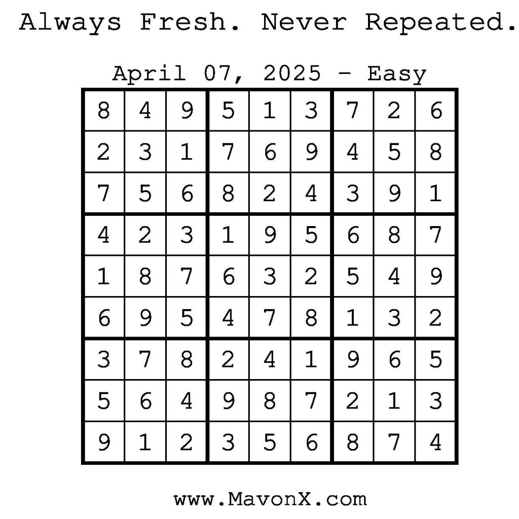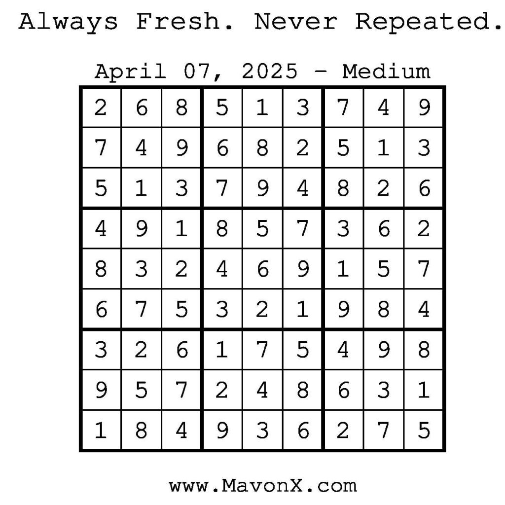 Puzzles of the Day – April 7, 2025 Post author:admin Post published:April 7, 2025 Post category:Free Stuff / Puzzle of the Day / Puzzle of the Day Solutions / Solutions Post comments:0 Comments Check out our books on Amazon! Check out our books on Barnes and Noble! Check out our books on Etsy! Easy Sudoku Coach Link Medium Sudoku Coach Link Hard Sudoku Coach Link Show Solution You Might Also Like Puzzles of the Day – August 30, 2025 August 29, 2025 Puzzles of the Day – October 1, 2024 October 1, 2024 Puzzles of the Day – October 22, 2025 October 22, 2025 Leave a Reply Cancel replyCommentEnter your name or username to comment Enter your email address to comment Enter your website URL (optional) Save my name, email, and website in this browser for the next time I comment.