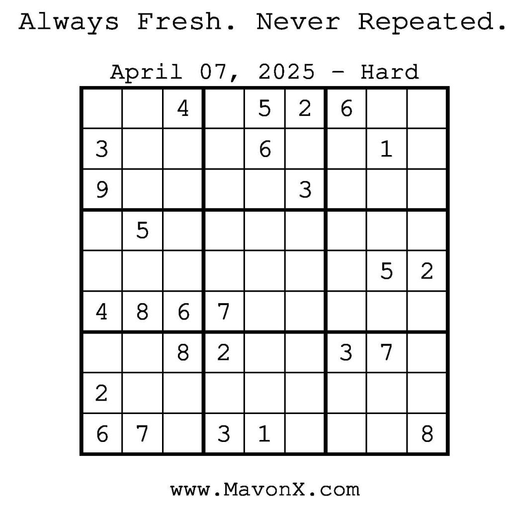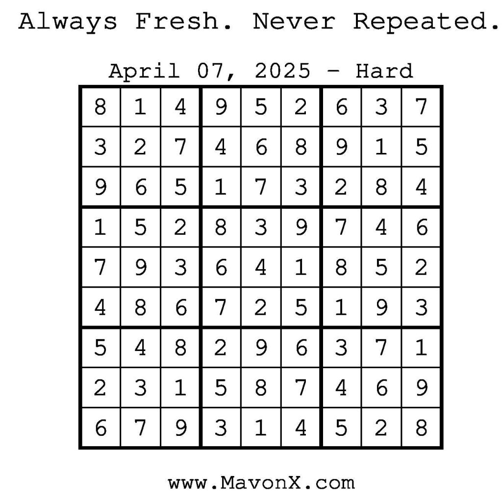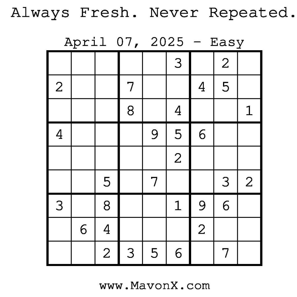 Puzzles of the Day – April 7, 2025 Post author:admin Post published:April 7, 2025 Post category:Free Stuff / Puzzle of the Day / Puzzle of the Day Solutions / Solutions Post comments:0 Comments Check out our books on Amazon! Check out our books on Barnes and Noble! Check out our books on Etsy! Easy Sudoku Coach Link Medium Sudoku Coach Link Hard Sudoku Coach Link Show Solution You Might Also Like Puzzles of the Day – August 30, 2025 August 29, 2025 Puzzles of the Day – October 1, 2024 October 1, 2024 Puzzles of the Day – October 22, 2025 October 22, 2025 Leave a Reply Cancel replyCommentEnter your name or username to comment Enter your email address to comment Enter your website URL (optional) Save my name, email, and website in this browser for the next time I comment.