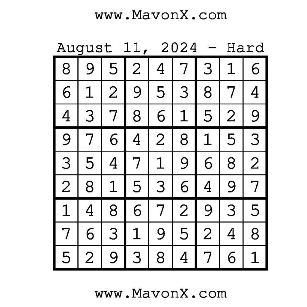 Puzzle of the Day – August 11, 2024 Post author:admin Post published:August 11, 2024 Post category:Free Stuff / Puzzle of the Day / Puzzle of the Day Solutions / Solutions Post comments:0 Comments Puzzle Puzzle Sudoku Coach Link Show Solution You Might Also Like Puzzles of the Day – November 14, 2025 November 14, 2025 Puzzles of the Day – September 5, 2024 September 5, 2024 Puzzles of the Day – October 1, 2025 September 30, 2025 Leave a Reply Cancel replyCommentEnter your name or username to comment Enter your email address to comment Enter your website URL (optional) Save my name, email, and website in this browser for the next time I comment.