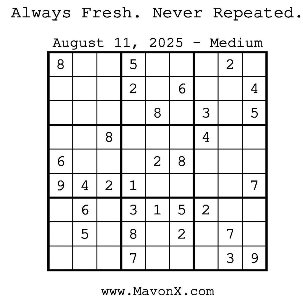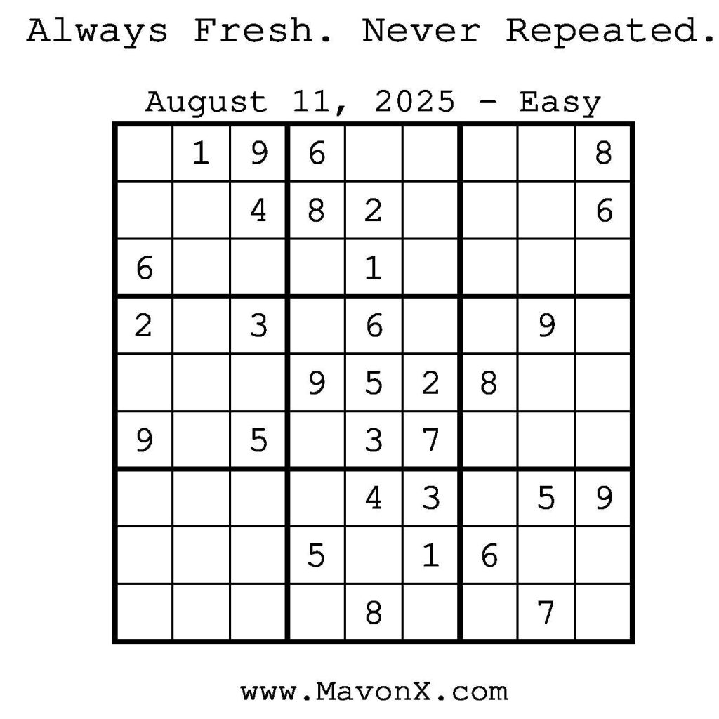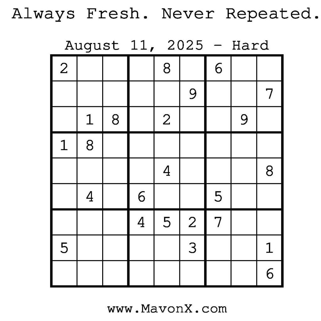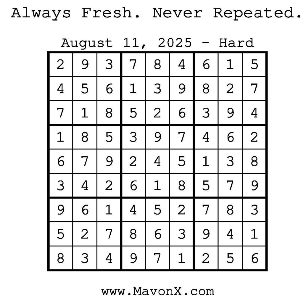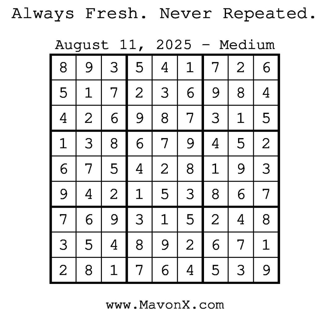 Puzzles of the Day – August 11, 2025 Post author:admin Post published:August 10, 2025 Post category:Free Stuff / Puzzle of the Day / Puzzle of the Day Solutions / Solutions Post comments:0 Comments Check out our books on Amazon! Check out our books on Barnes and Noble! Check out our books on Etsy! Easy Sudoku Coach Link Medium Sudoku Coach Link Hard Sudoku Coach Link Show Solution You Might Also Like Puzzles of the Day – January 5, 2025 January 5, 2025 Puzzles of the Day – April 4, 2025 April 5, 2025 Puzzles of the Day – September 7, 2024 September 7, 2024 Leave a Reply Cancel replyCommentEnter your name or username to comment Enter your email address to comment Enter your website URL (optional) Save my name, email, and website in this browser for the next time I comment.