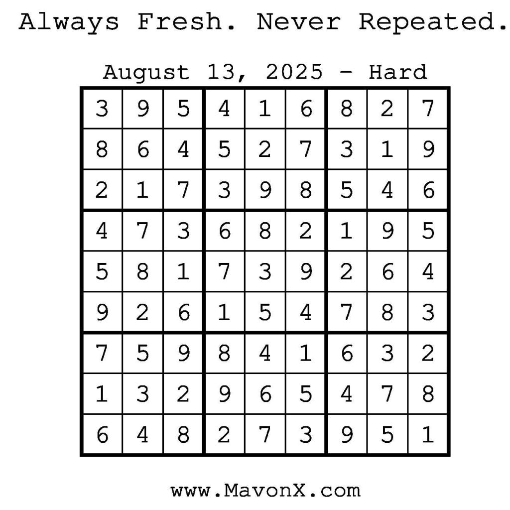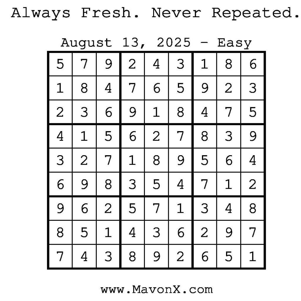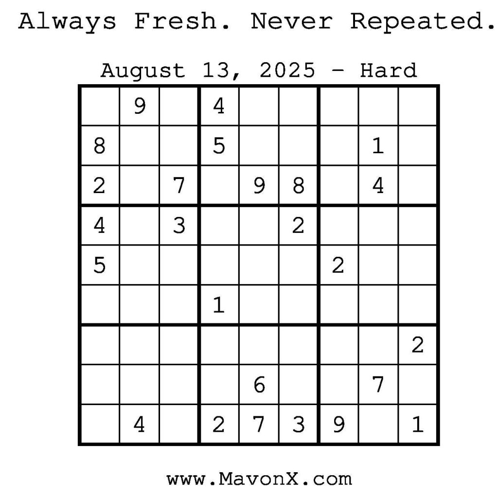 Puzzles of the Day – August 13, 2025 Post author:admin Post published:August 14, 2025 Post category:Free Stuff / Puzzle of the Day / Puzzle of the Day Solutions / Solutions Post comments:0 Comments Check out our books on Amazon! Check out our books on Barnes and Noble! Check out our books on Etsy! Easy Sudoku Coach Link Medium Sudoku Coach Link Hard Sudoku Coach Link Show Solution You Might Also Like Puzzles of the Day – April 18, 2025 April 17, 2025 Puzzles of the Day – February 25, 2025 February 25, 2025 Puzzles of the Day – March 31, 2026 March 29, 2026 Leave a Reply Cancel replyCommentEnter your name or username to comment Enter your email address to comment Enter your website URL (optional) Save my name, email, and website in this browser for the next time I comment.