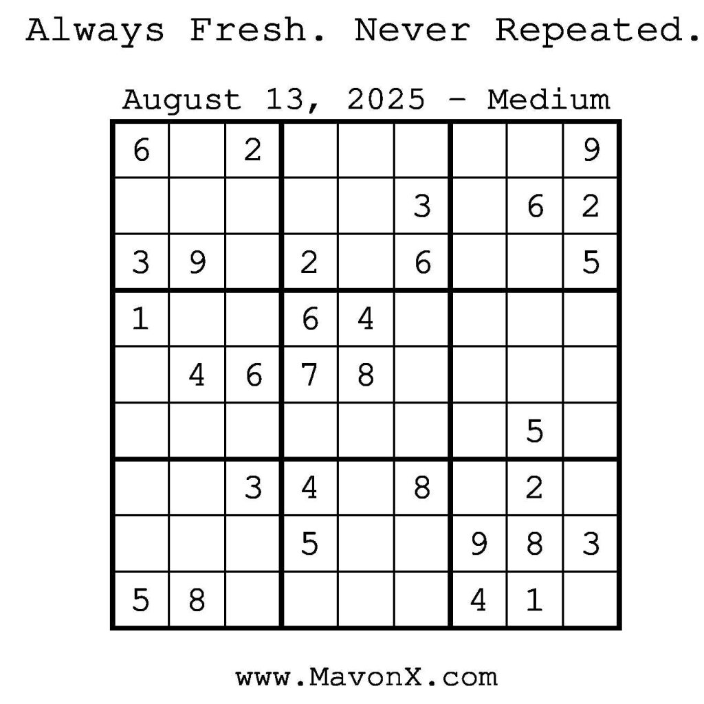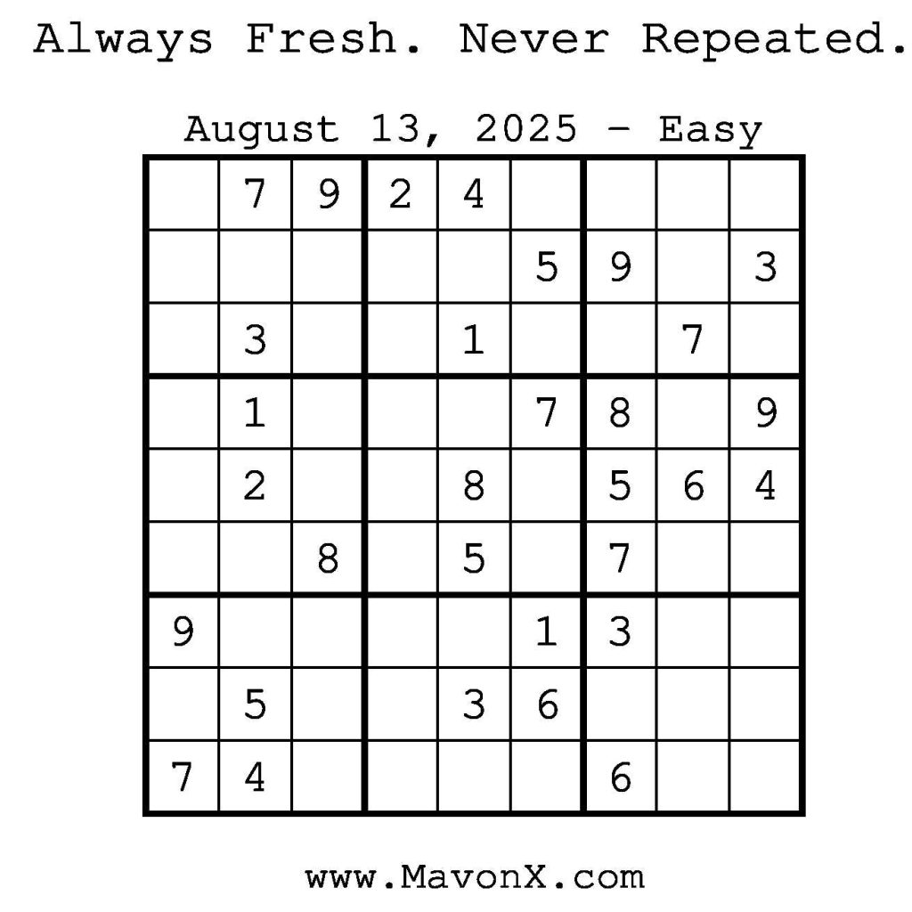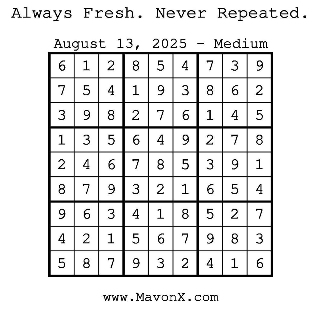 Puzzles of the Day – August 13, 2025 Post author:admin Post published:August 14, 2025 Post category:Free Stuff / Puzzle of the Day / Puzzle of the Day Solutions / Solutions Post comments:0 Comments Check out our books on Amazon! Check out our books on Barnes and Noble! Check out our books on Etsy! Easy Sudoku Coach Link Medium Sudoku Coach Link Hard Sudoku Coach Link Show Solution You Might Also Like Puzzles of the Day – April 18, 2025 April 17, 2025 Puzzles of the Day – February 25, 2025 February 25, 2025 Puzzles of the Day – March 31, 2026 March 29, 2026 Leave a Reply Cancel replyCommentEnter your name or username to comment Enter your email address to comment Enter your website URL (optional) Save my name, email, and website in this browser for the next time I comment.