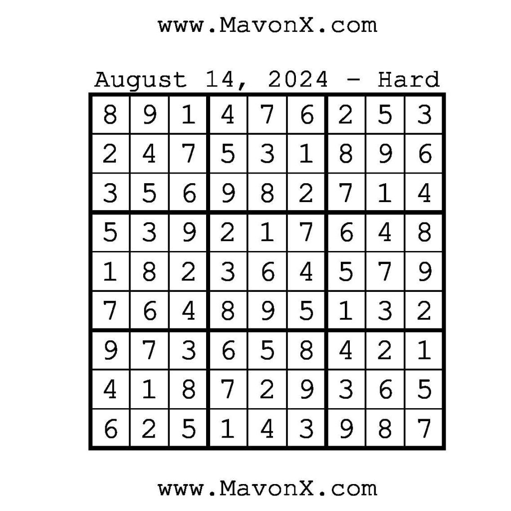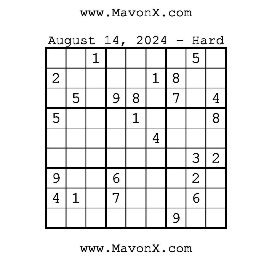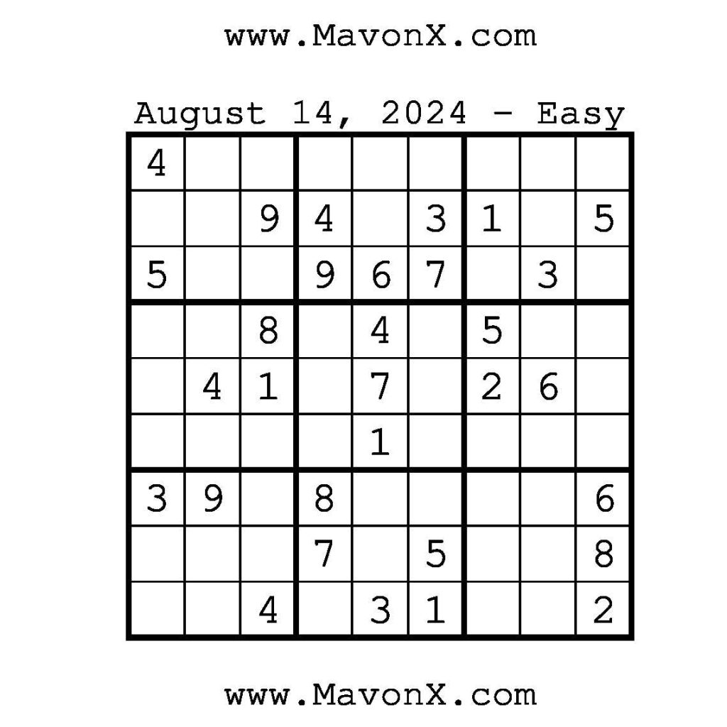 Puzzles of the Day – August 14, 2024 Post author:admin Post published:August 14, 2024 Post category:Free Stuff / Puzzle of the Day / Puzzle of the Day Solutions / Solutions Post comments:0 Comments Check out our books on Amazon!!!!! Easy Sudoku Coach Link Medium Sudoku Coach Link Hard Sudoku Coach Link Show Solution You Might Also Like Puzzles of the Day – October 22, 2025 October 22, 2025 Puzzles of the Day – June 11, 2025 June 11, 2025 Puzzles of the Day – January 4, 2026 January 3, 2026 Leave a Reply Cancel replyCommentEnter your name or username to comment Enter your email address to comment Enter your website URL (optional) Save my name, email, and website in this browser for the next time I comment.