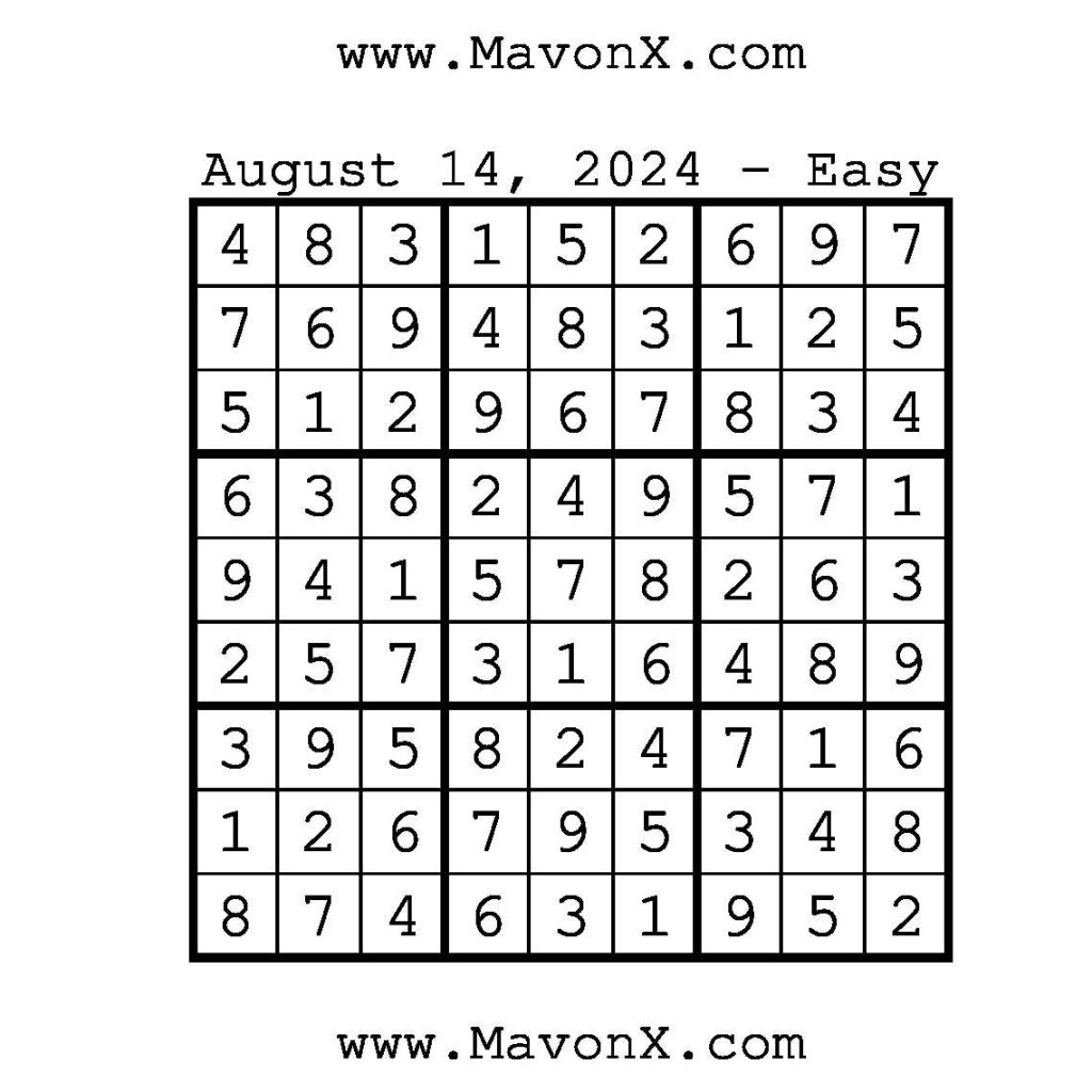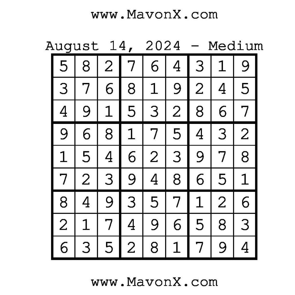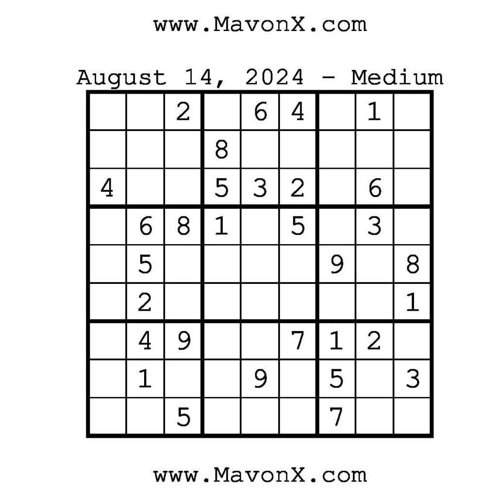 Puzzles of the Day – August 14, 2024 Post author:admin Post published:August 14, 2024 Post category:Free Stuff / Puzzle of the Day / Puzzle of the Day Solutions / Solutions Post comments:0 Comments Check out our books on Amazon!!!!! Easy Sudoku Coach Link Medium Sudoku Coach Link Hard Sudoku Coach Link Show Solution You Might Also Like Puzzles of the Day – October 22, 2025 October 22, 2025 Puzzles of the Day – June 11, 2025 June 11, 2025 Puzzles of the Day – January 4, 2026 January 3, 2026 Leave a Reply Cancel replyCommentEnter your name or username to comment Enter your email address to comment Enter your website URL (optional) Save my name, email, and website in this browser for the next time I comment.