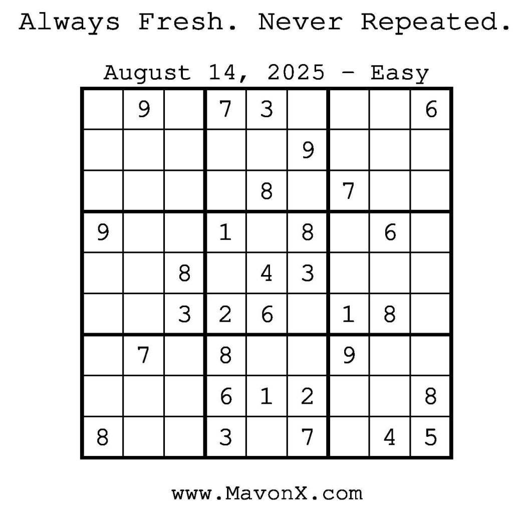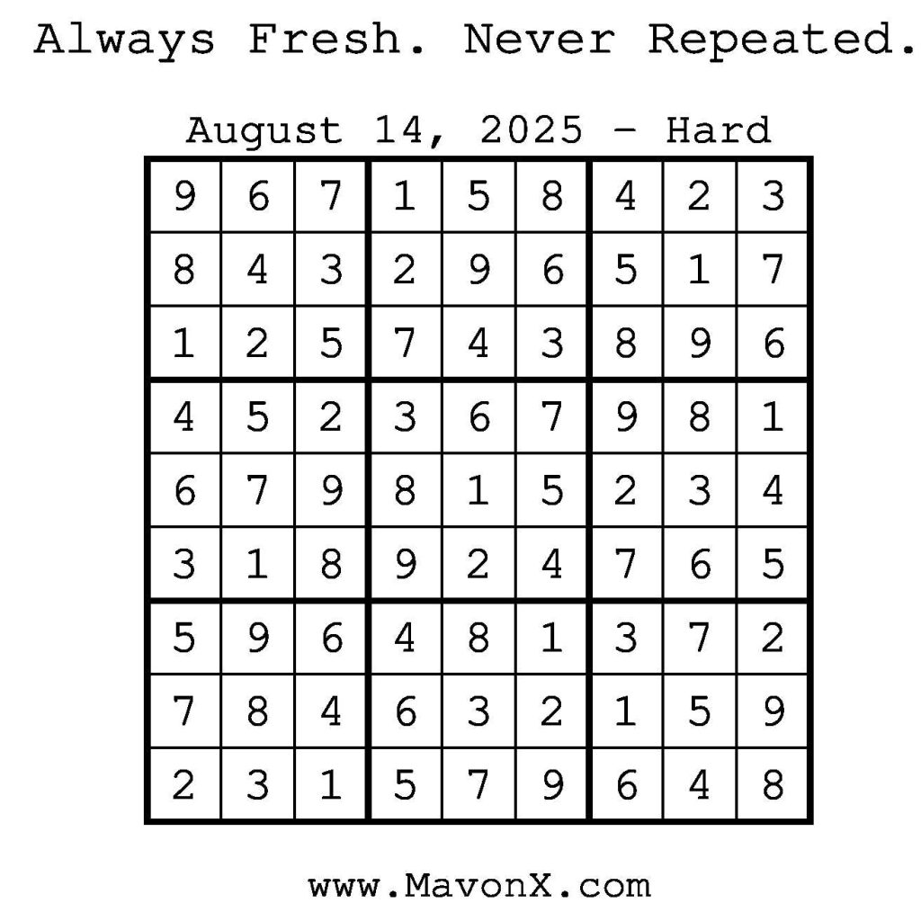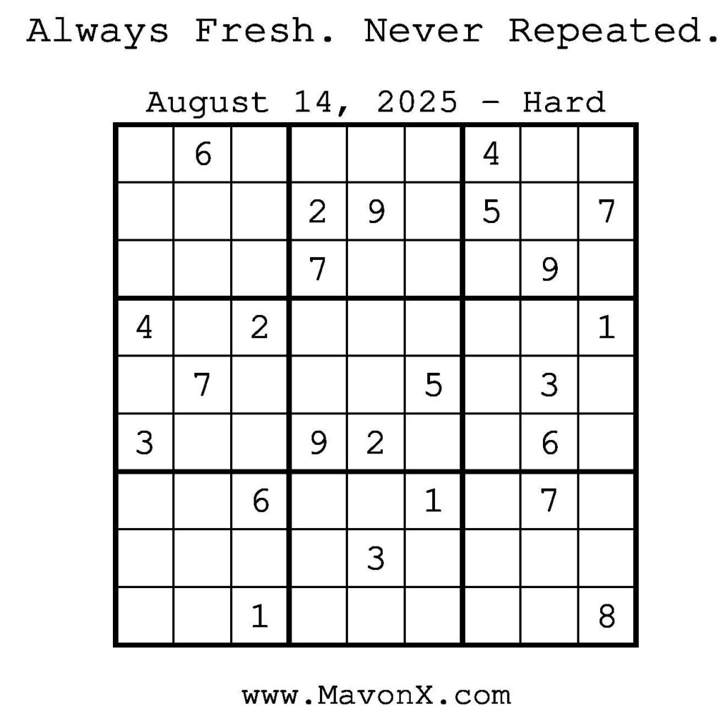 Puzzles of the Day – August 14, 2025 Post author:admin Post published:August 14, 2025 Post category:Free Stuff / Puzzle of the Day / Puzzle of the Day Solutions / Solutions Post comments:0 Comments Check out our books on Amazon! Check out our books on Barnes and Noble! Check out our books on Etsy! Easy Sudoku Coach Link Medium Sudoku Coach Link Hard Sudoku Coach Link Show Solution You Might Also Like Puzzles of the Day – September 5, 2025 September 4, 2025 Puzzles of the Day – September 9, 2025 September 8, 2025 Puzzles of the Day – October 22, 2024 October 21, 2024 Leave a Reply Cancel replyCommentEnter your name or username to comment Enter your email address to comment Enter your website URL (optional) Save my name, email, and website in this browser for the next time I comment.
