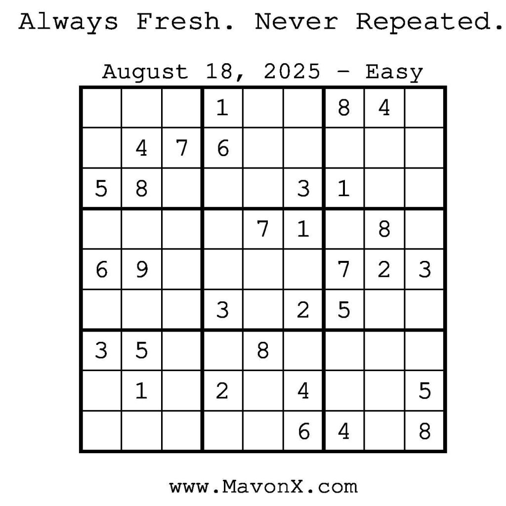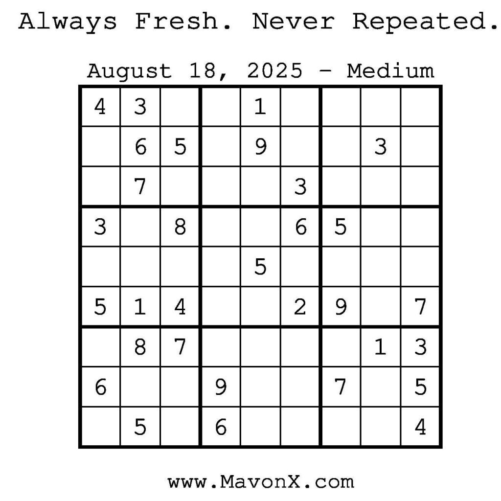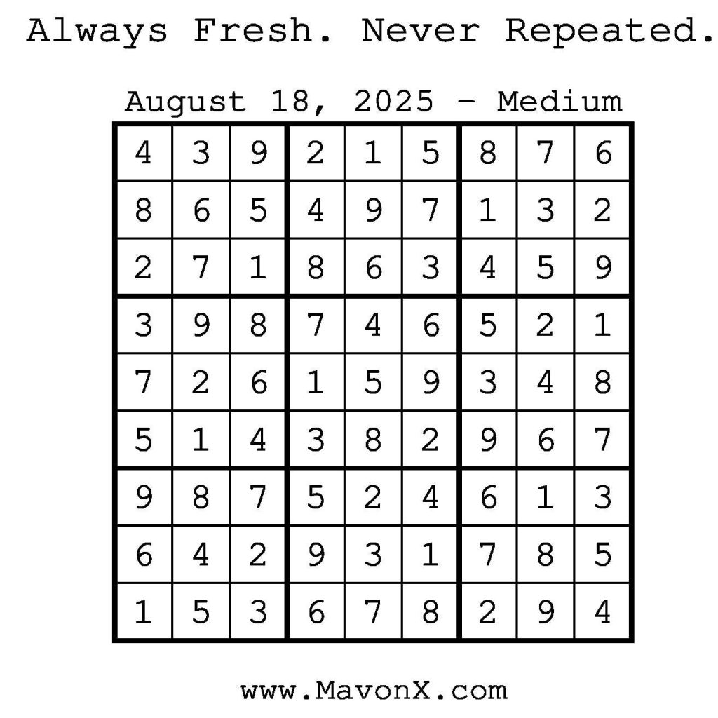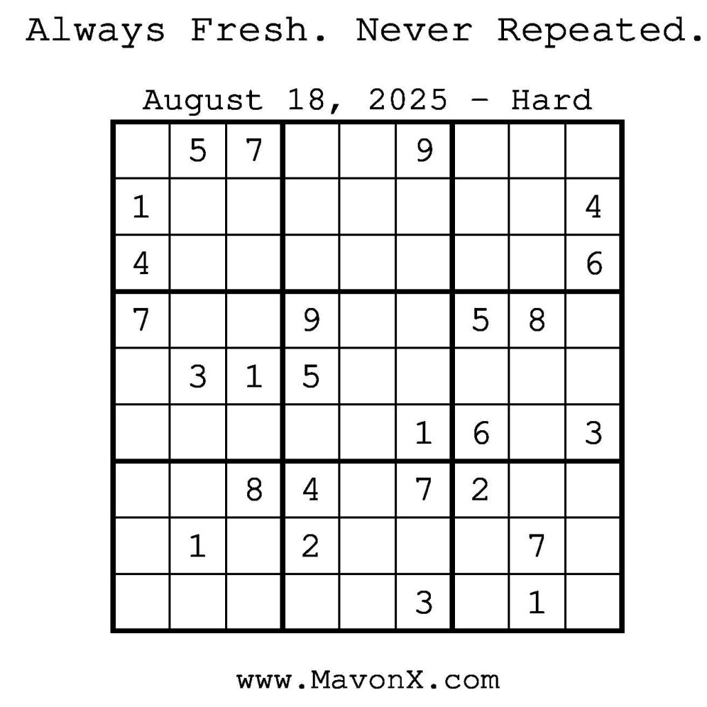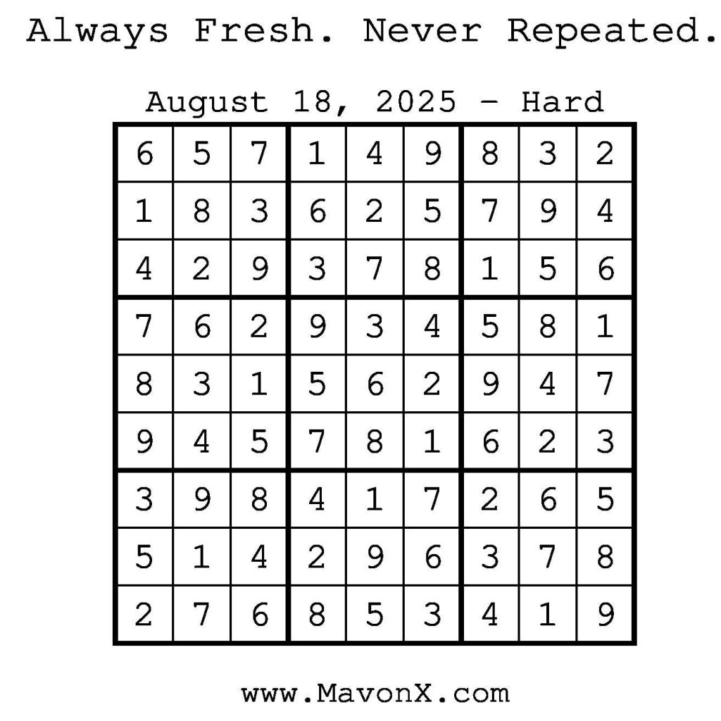 Puzzles of the Day – August 18, 2025 Post author:admin Post published:August 18, 2025 Post category:Free Stuff / Puzzle of the Day / Puzzle of the Day Solutions / Solutions Post comments:0 Comments Check out our books on Amazon! Check out our books on Barnes and Noble! Check out our books on Etsy! Easy Sudoku Coach Link Medium Sudoku Coach Link Hard Sudoku Coach Link Show Solution You Might Also Like Puzzles of the Day – November 5, 2025 November 4, 2025 Puzzles of the Day – July 22, 2025 July 22, 2025 Puzzles of the Day – April 7, 2026 April 7, 2026 Leave a Reply Cancel replyCommentEnter your name or username to comment Enter your email address to comment Enter your website URL (optional) Save my name, email, and website in this browser for the next time I comment.