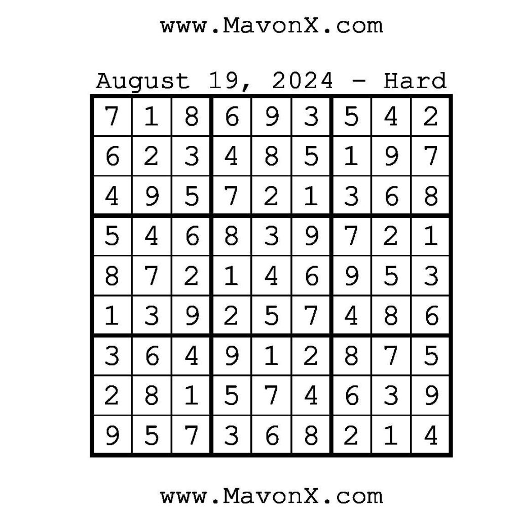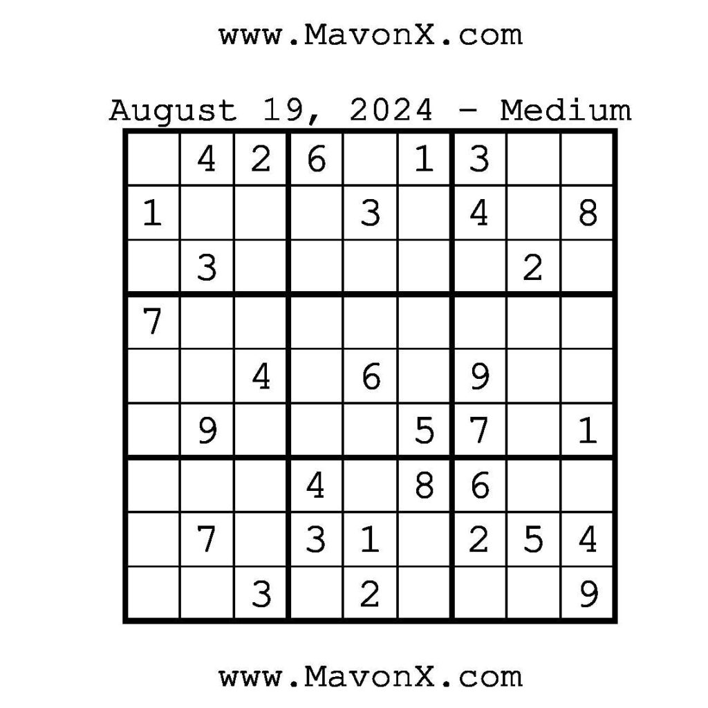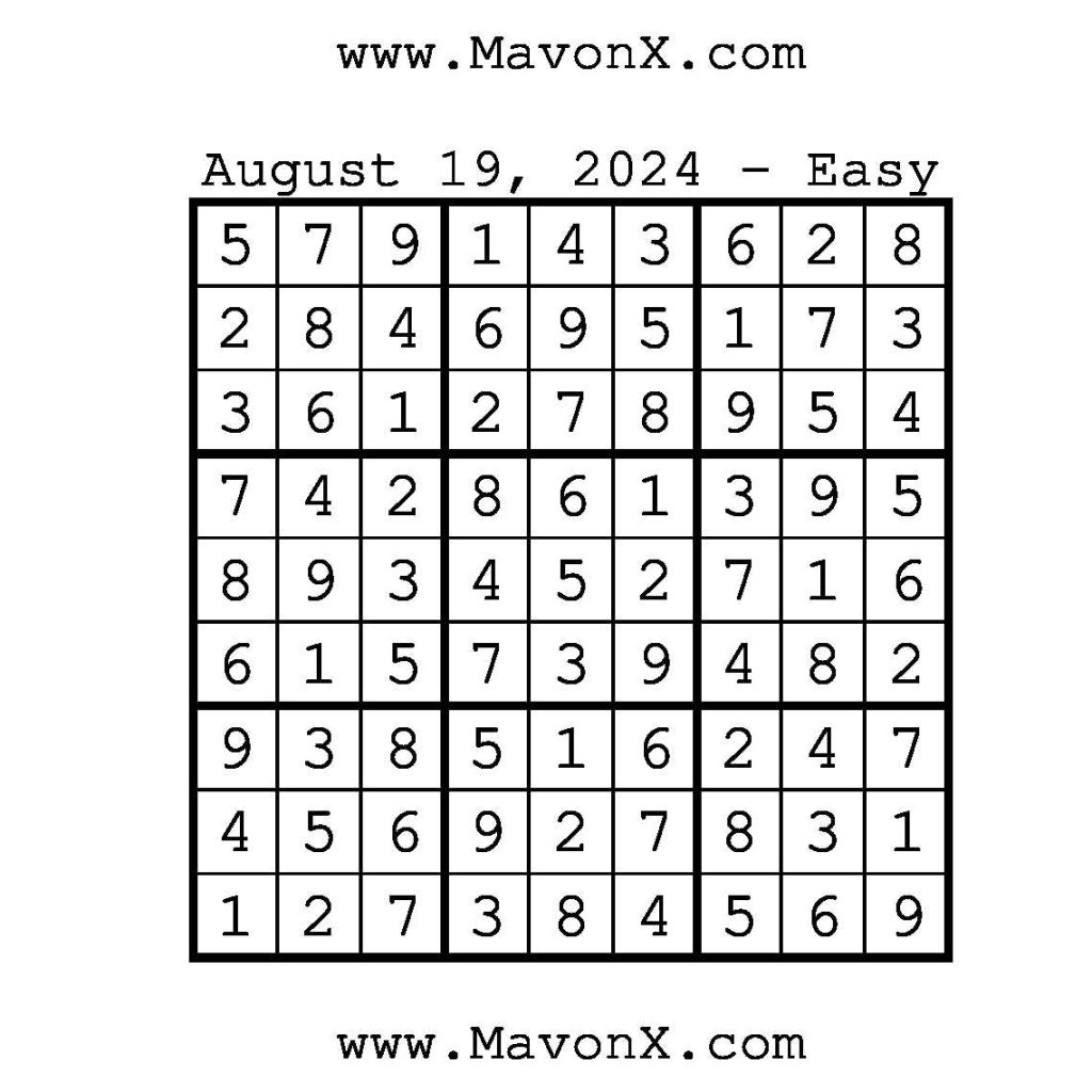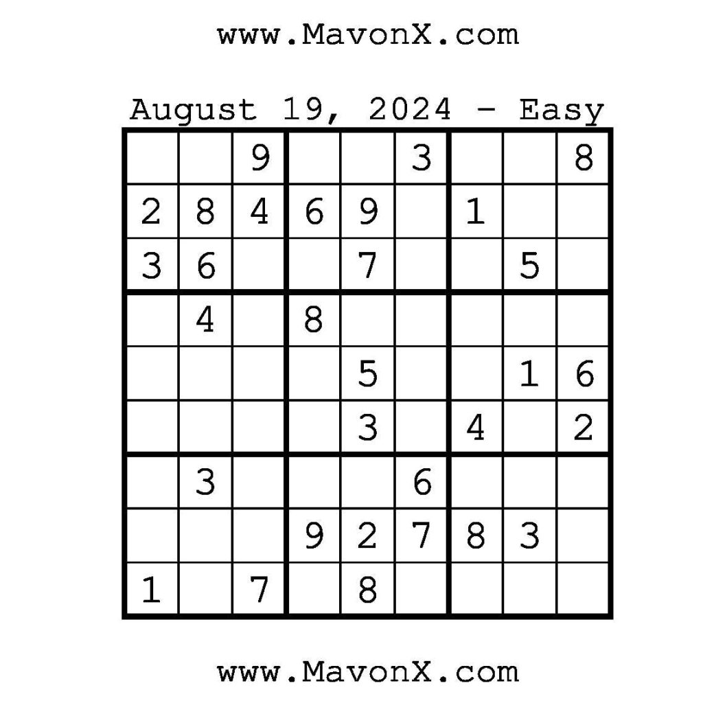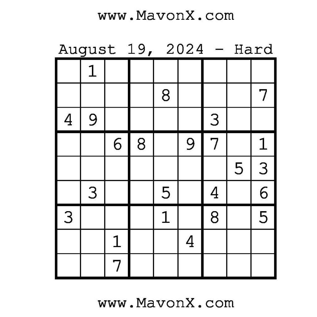 Puzzles of the Day – August 19, 2024 Post author:admin Post published:August 19, 2024 Post category:Free Stuff / Puzzle of the Day / Puzzle of the Day Solutions / Solutions Post comments:0 Comments Check out our books on Amazon!!!!! Easy Sudoku Coach Link Medium Sudoku Coach Link Hard Sudoku Coach Link Show Solution You Might Also Like Puzzles of the Day – March 22, 2026 March 22, 2026 Puzzles of the Day – January 28, 2025 January 28, 2025 Puzzles of the Day – January 14, 2025 January 14, 2025 Leave a Reply Cancel replyCommentEnter your name or username to comment Enter your email address to comment Enter your website URL (optional) Save my name, email, and website in this browser for the next time I comment.