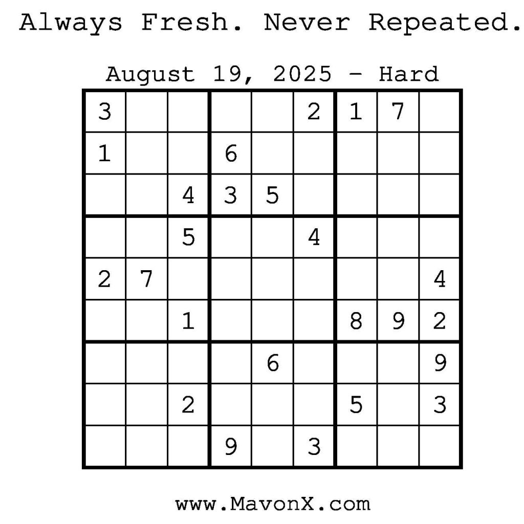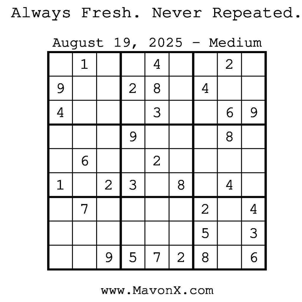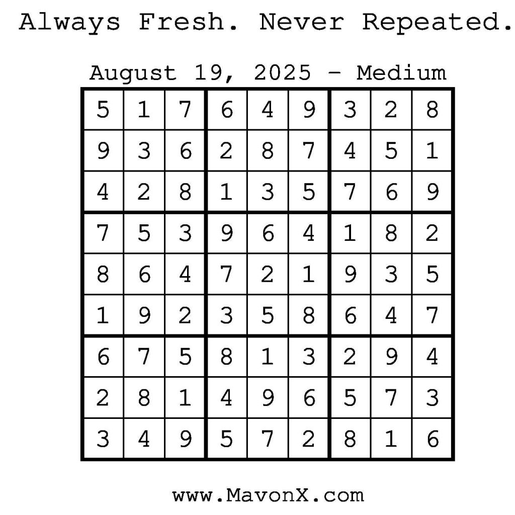Puzzles of the Day – August 19, 2025 Post author:admin Post published:August 18, 2025 Post category:Free Stuff / Puzzle of the Day / Puzzle of the Day Solutions / Solutions Post comments:0 Comments Check out our books on Amazon! Check out our books on Barnes and Noble! Check out our books on Etsy! Easy Sudoku Coach Link Medium Sudoku Coach Link Hard Sudoku Coach Link Show Solution You Might Also Like Puzzles of the Day – August 17, 2025 August 17, 2025 Puzzles of the Day – April 13, 2025 April 12, 2025 Puzzles of the Day – March 5, 2026 March 4, 2026 Leave a Reply Cancel replyCommentEnter your name or username to comment Enter your email address to comment Enter your website URL (optional) Save my name, email, and website in this browser for the next time I comment.