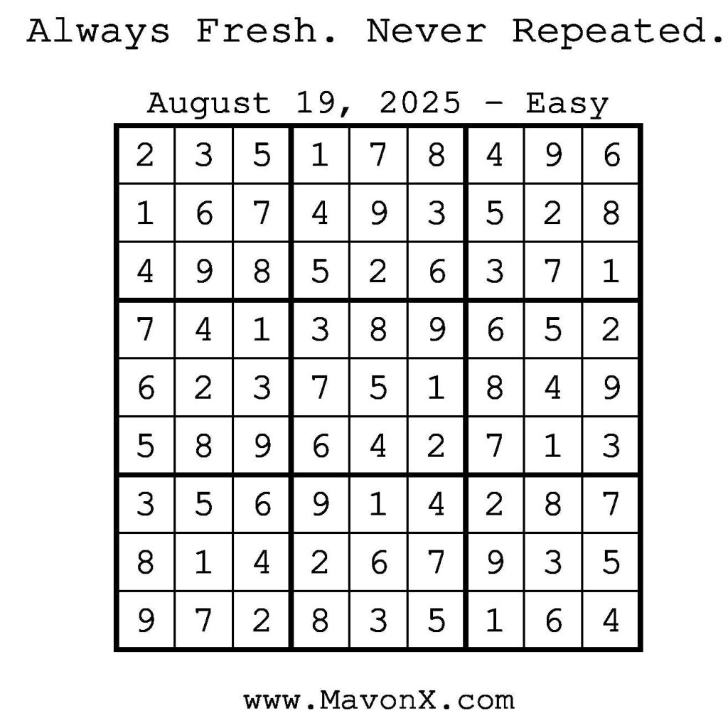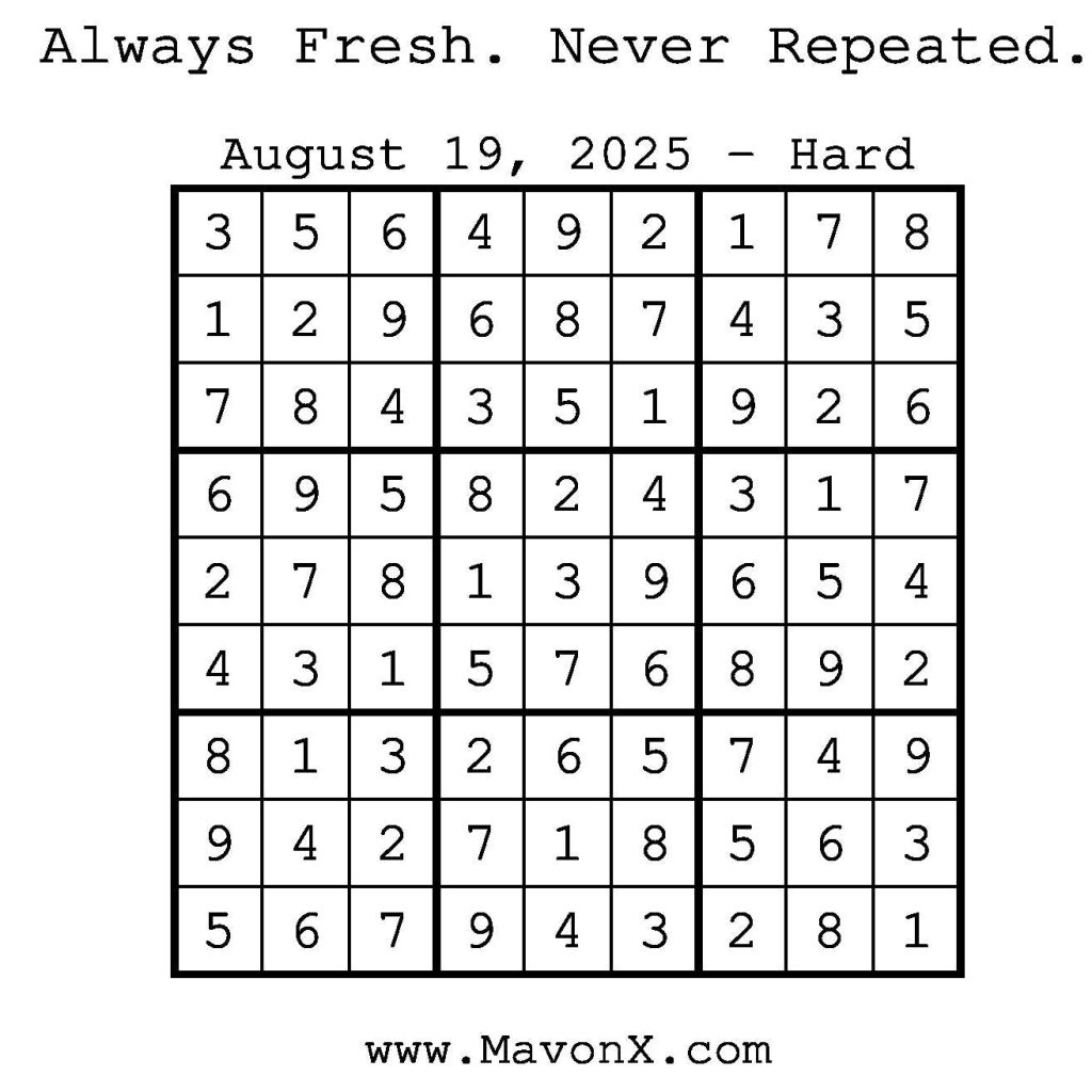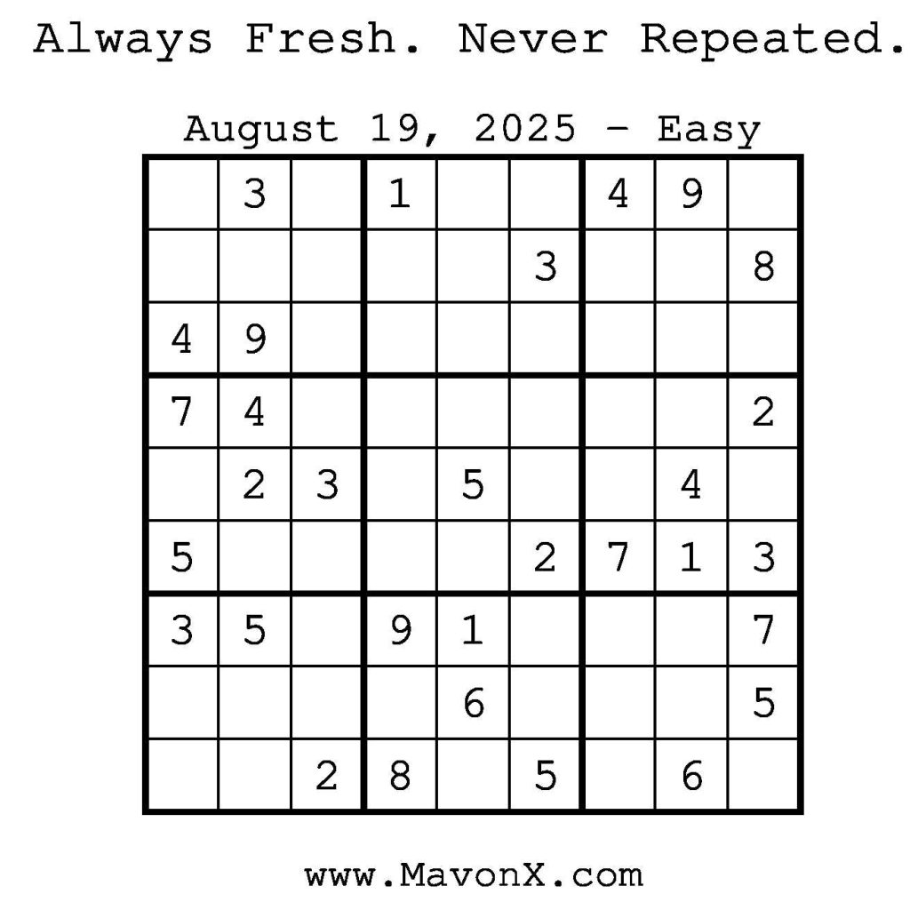 Puzzles of the Day – August 19, 2025 Post author:admin Post published:August 18, 2025 Post category:Free Stuff / Puzzle of the Day / Puzzle of the Day Solutions / Solutions Post comments:0 Comments Check out our books on Amazon! Check out our books on Barnes and Noble! Check out our books on Etsy! Easy Sudoku Coach Link Medium Sudoku Coach Link Hard Sudoku Coach Link Show Solution You Might Also Like Puzzles of the Day – August 17, 2025 August 17, 2025 Puzzles of the Day – April 13, 2025 April 12, 2025 Puzzles of the Day – March 5, 2026 March 4, 2026 Leave a Reply Cancel replyCommentEnter your name or username to comment Enter your email address to comment Enter your website URL (optional) Save my name, email, and website in this browser for the next time I comment.
