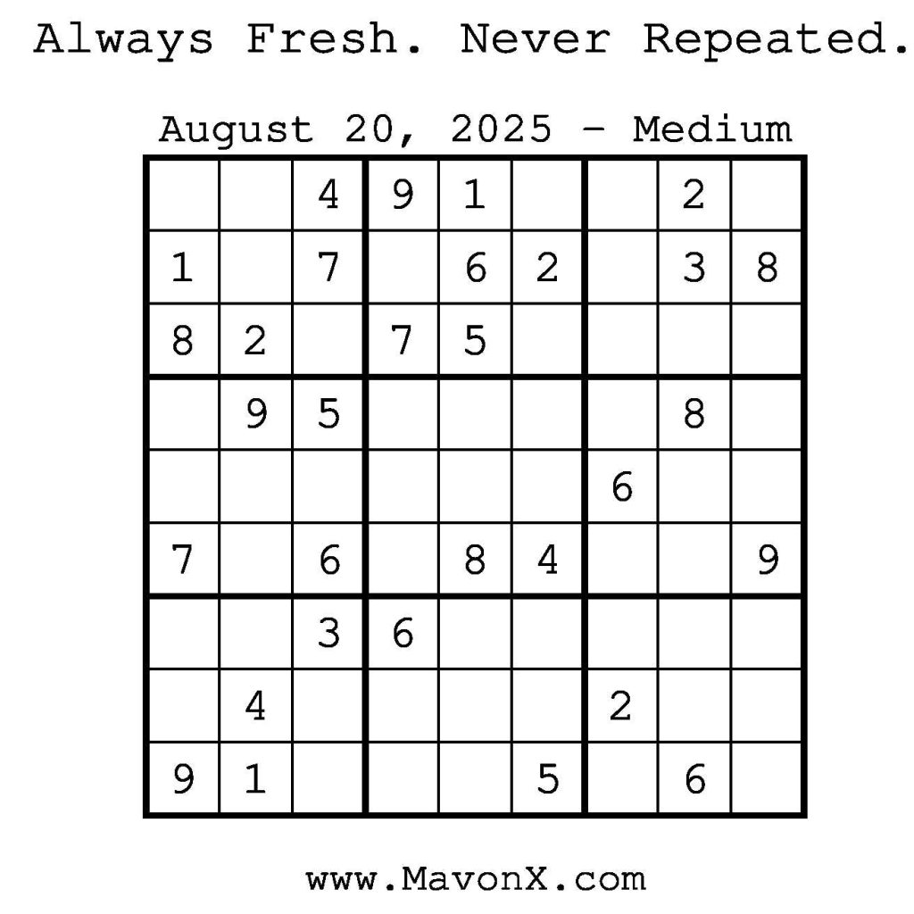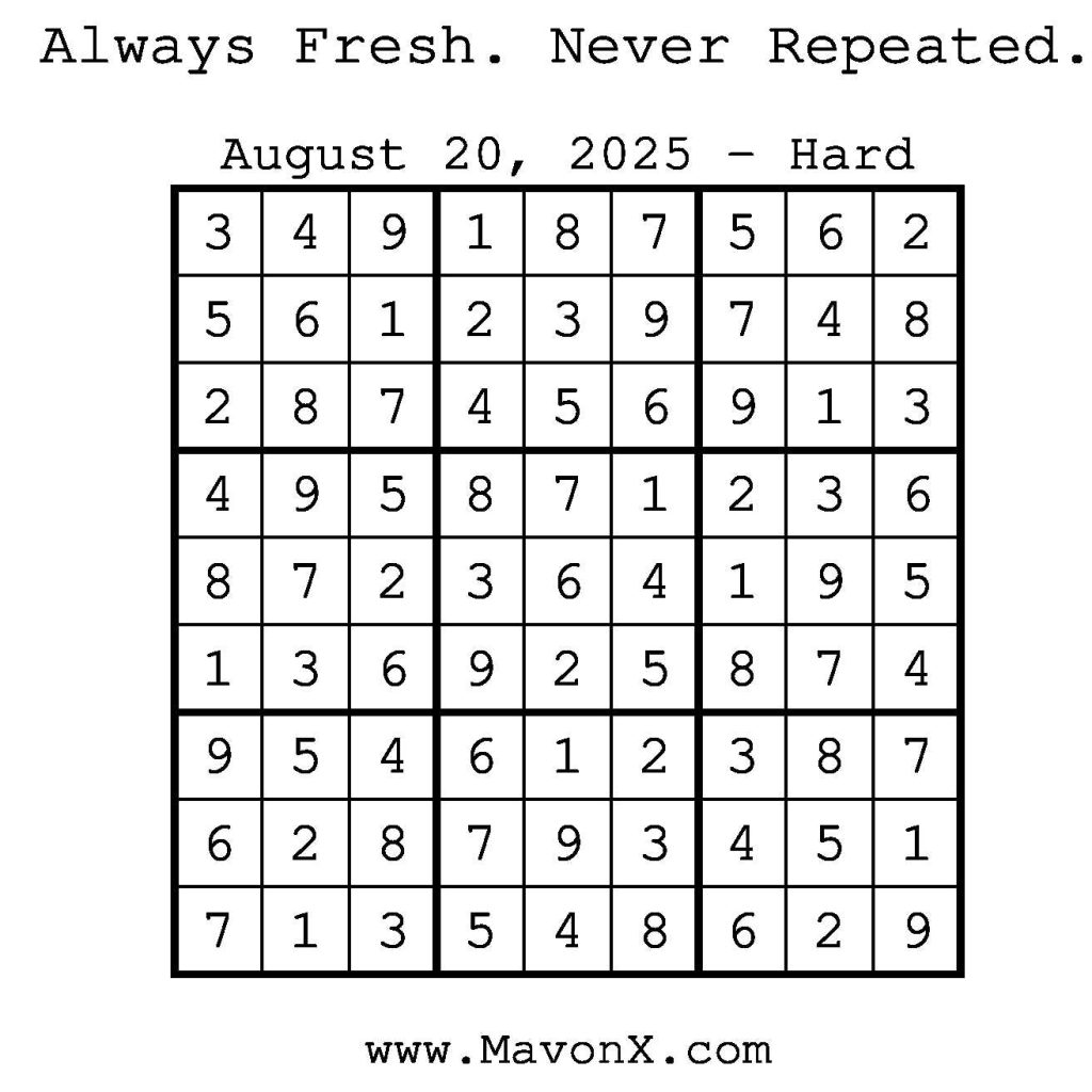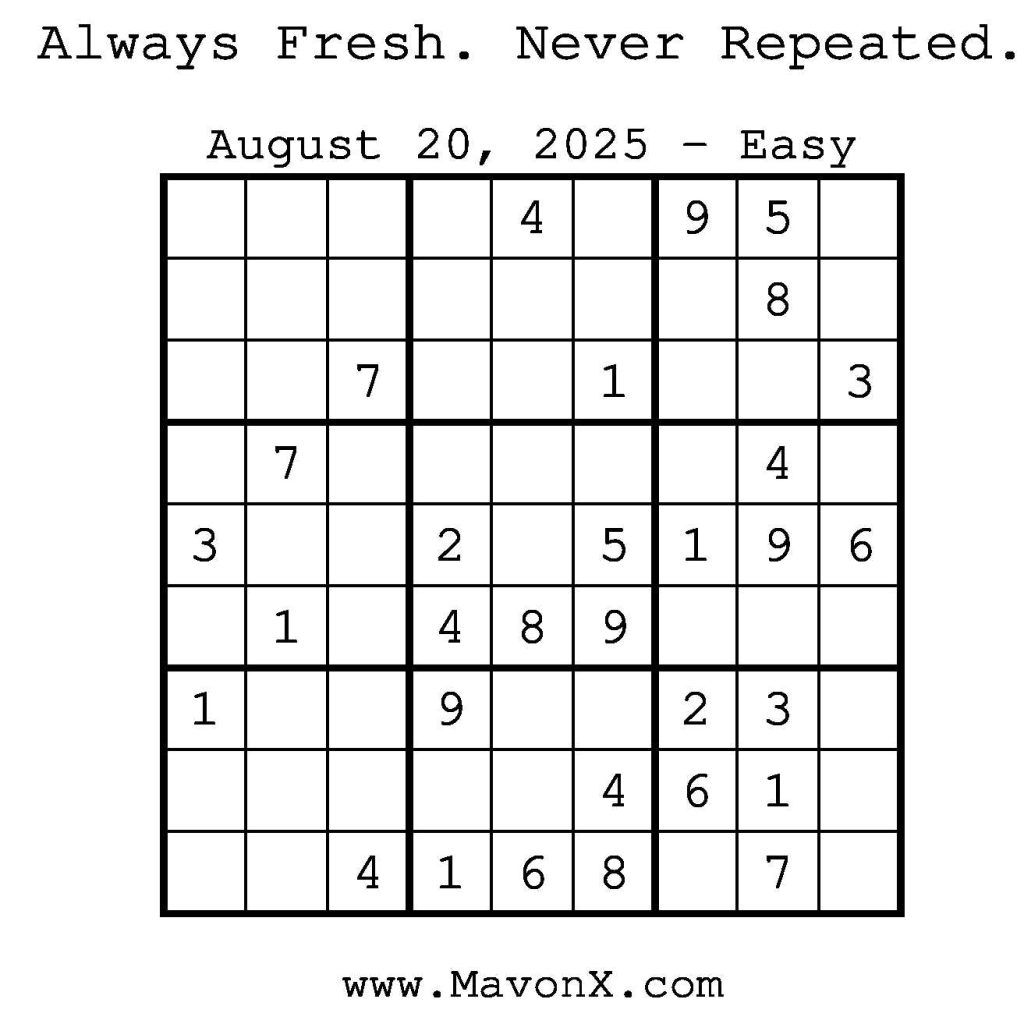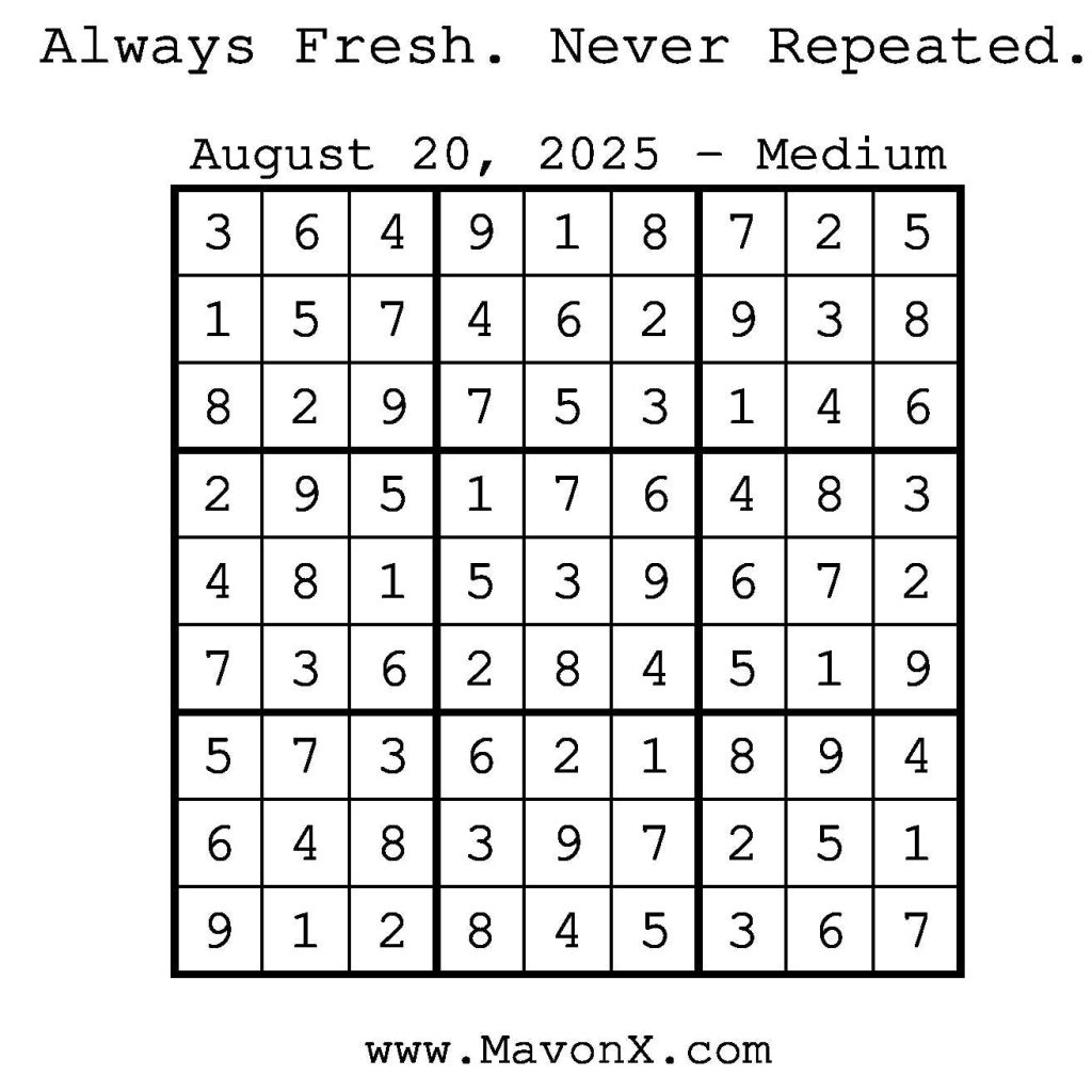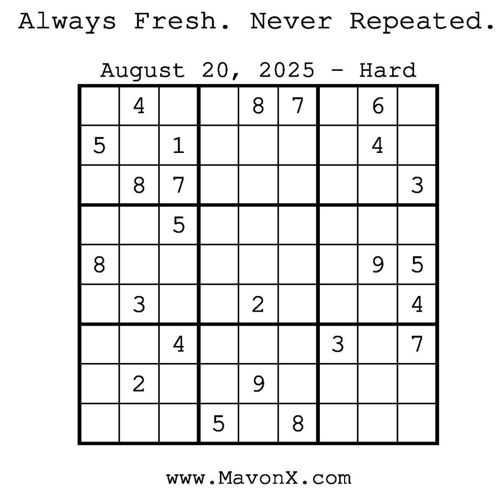 Puzzles of the Day – August 20, 2025 Post author:admin Post published:August 20, 2025 Post category:Free Stuff / Puzzle of the Day / Puzzle of the Day Solutions / Solutions Post comments:0 Comments Check out our books on Amazon! Check out our books on Barnes and Noble! Check out our books on Etsy! Easy Sudoku Coach Link Medium Sudoku Coach Link Hard Sudoku Coach Link Show Solution You Might Also Like Puzzles of the Day – December 29, 2025 December 29, 2025 Puzzles of the Day – January 13, 2026 January 12, 2026 Puzzles of the Day – December 08, 2025 December 7, 2025 Leave a Reply Cancel replyCommentEnter your name or username to comment Enter your email address to comment Enter your website URL (optional) Save my name, email, and website in this browser for the next time I comment.
