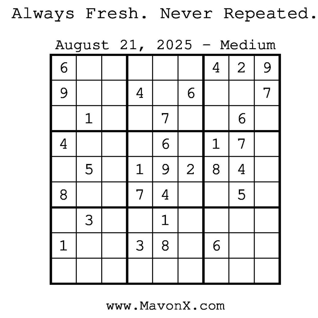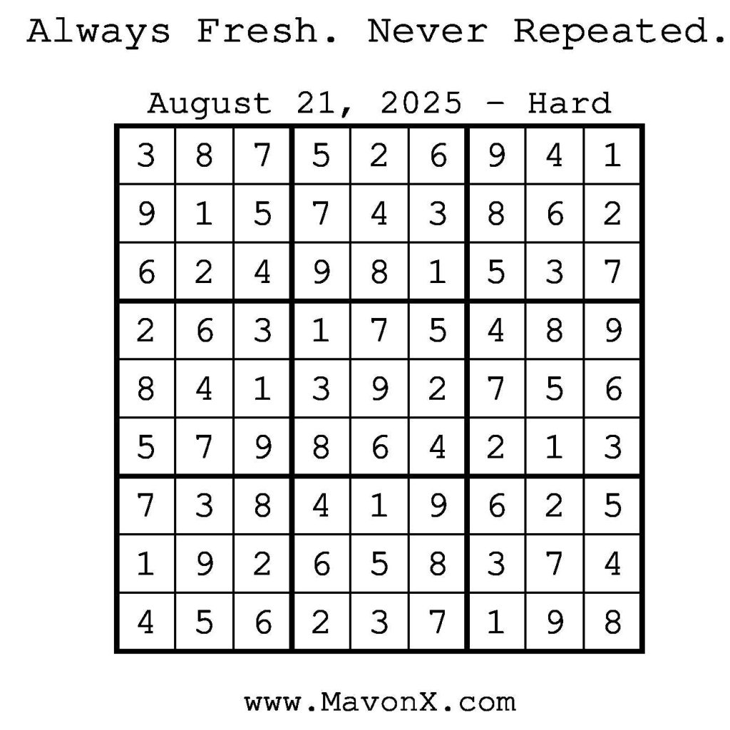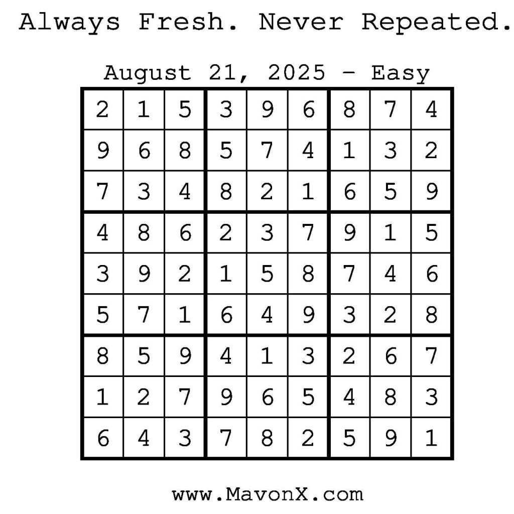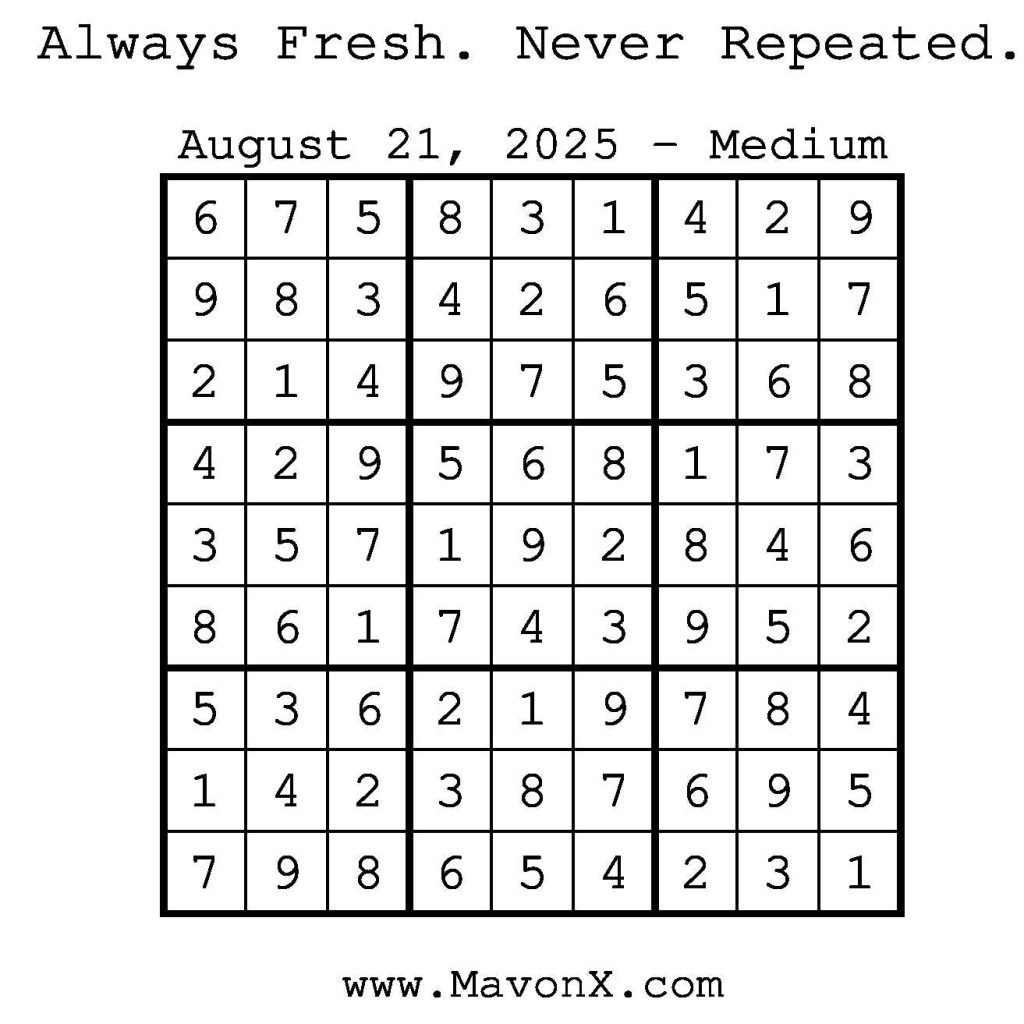 Puzzles of the Day – August 21, 2025 Post author:admin Post published:August 20, 2025 Post category:Free Stuff / Puzzle of the Day / Puzzle of the Day Solutions / Solutions Post comments:0 Comments Check out our books on Amazon! Check out our books on Barnes and Noble! Check out our books on Etsy! Easy Sudoku Coach Link Medium Sudoku Coach Link Hard Sudoku Coach Link Show Solution You Might Also Like Puzzles of the Day – November 2, 2024 November 1, 2024 Puzzles of the Day – November 20, 2024 November 19, 2024 Puzzles of the Day – November 13, 2024 November 12, 2024 Leave a Reply Cancel replyCommentEnter your name or username to comment Enter your email address to comment Enter your website URL (optional) Save my name, email, and website in this browser for the next time I comment.