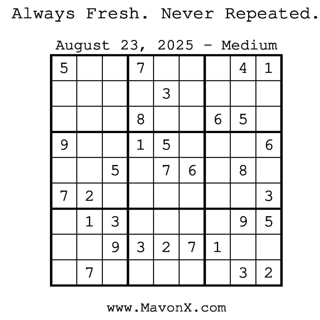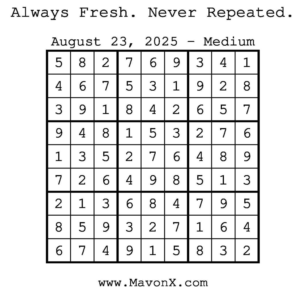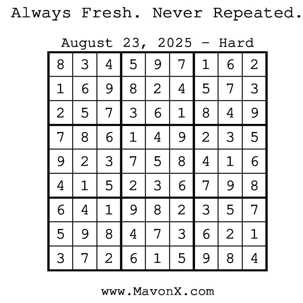 Puzzles of the Day – August 23, 2025 Post author:admin Post published:August 22, 2025 Post category:Free Stuff / Puzzle of the Day / Puzzle of the Day Solutions / Solutions Post comments:0 Comments Check out our books on Amazon! Check out our books on Barnes and Noble! Check out our books on Etsy! Easy Sudoku Coach Link Medium Sudoku Coach Link Hard Sudoku Coach Link Show Solution You Might Also Like Puzzles of the Day – November 22, 2024 November 21, 2024 Puzzles of the Day – February 11, 2025 February 12, 2025 Puzzles of the Day – January 24, 2026 January 24, 2026 Leave a Reply Cancel replyCommentEnter your name or username to comment Enter your email address to comment Enter your website URL (optional) Save my name, email, and website in this browser for the next time I comment.