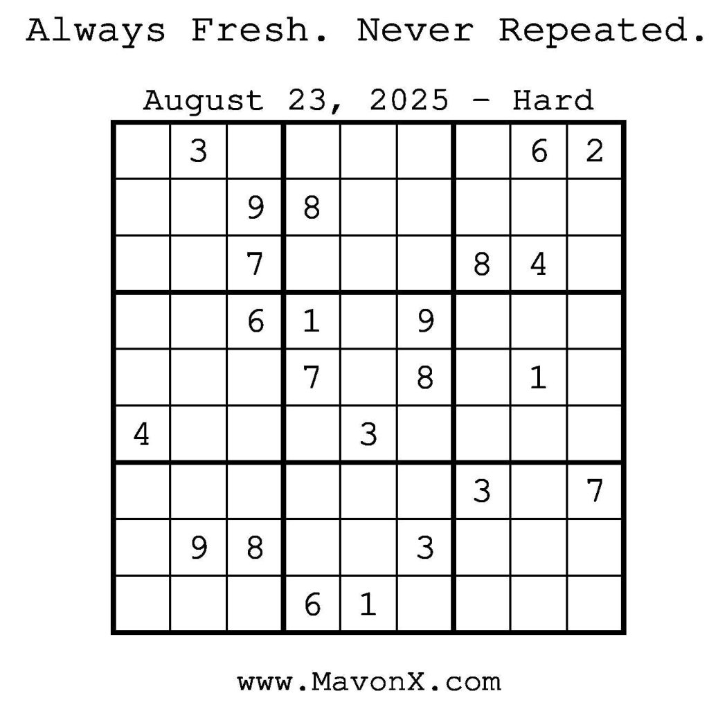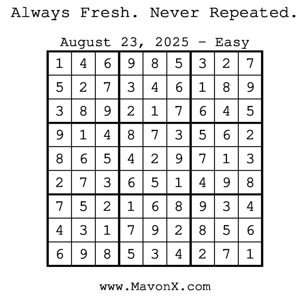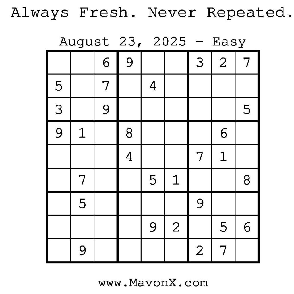 Puzzles of the Day – August 23, 2025 Post author:admin Post published:August 22, 2025 Post category:Free Stuff / Puzzle of the Day / Puzzle of the Day Solutions / Solutions Post comments:0 Comments Check out our books on Amazon! Check out our books on Barnes and Noble! Check out our books on Etsy! Easy Sudoku Coach Link Medium Sudoku Coach Link Hard Sudoku Coach Link Show Solution You Might Also Like Puzzles of the Day – November 22, 2024 November 21, 2024 Puzzles of the Day – February 11, 2025 February 12, 2025 Puzzles of the Day – January 24, 2026 January 24, 2026 Leave a Reply Cancel replyCommentEnter your name or username to comment Enter your email address to comment Enter your website URL (optional) Save my name, email, and website in this browser for the next time I comment.