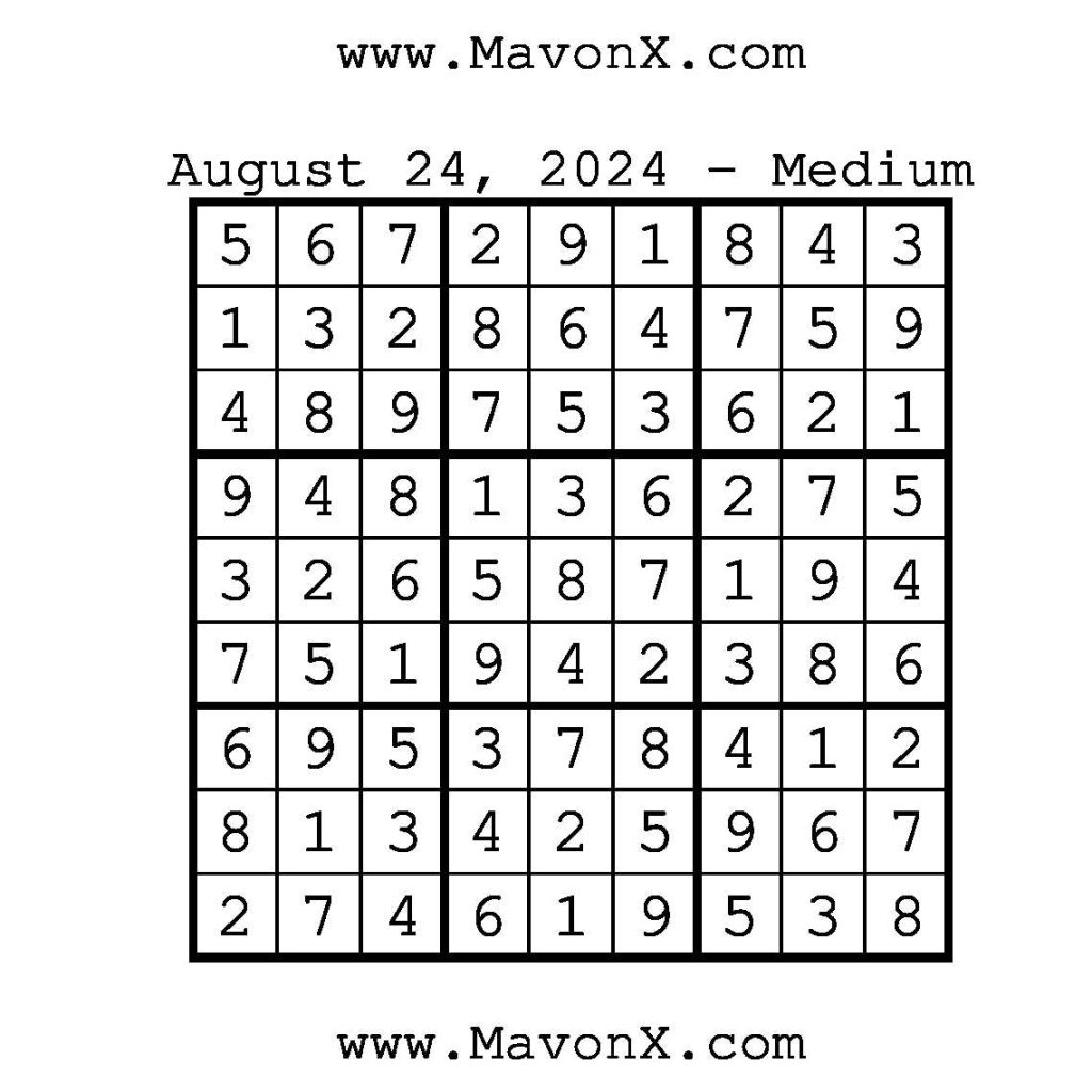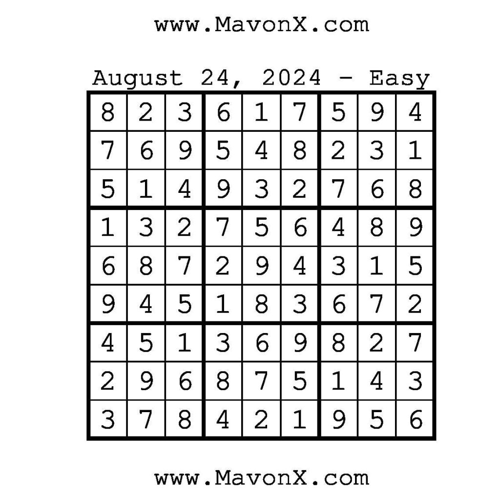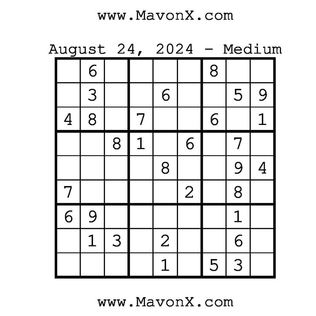 Puzzles of the Day – August 24, 2024 Post author:admin Post published:August 24, 2024 Post category:Free Stuff / Puzzle of the Day / Puzzle of the Day Solutions / Solutions Post comments:0 Comments Check out our books on Amazon!!!!! Easy Sudoku Coach Link Medium Sudoku Coach Link Hard Sudoku Coach Link Show Solution You Might Also Like Puzzles of the Day – October 13, 2024 October 13, 2024 Puzzles of the Day – April 1, 2025 April 2, 2025 Puzzles of the Day – June 14, 2025 June 16, 2025 Leave a Reply Cancel replyCommentEnter your name or username to comment Enter your email address to comment Enter your website URL (optional) Save my name, email, and website in this browser for the next time I comment.