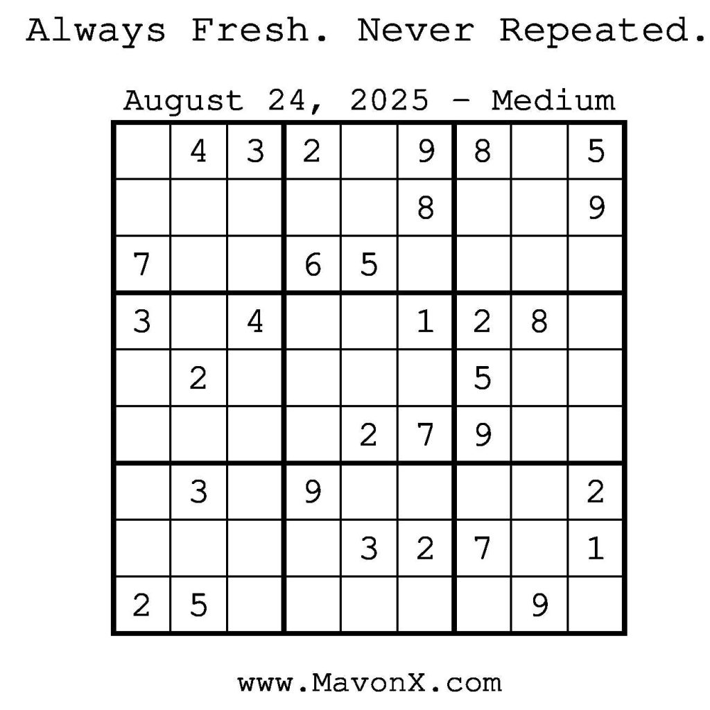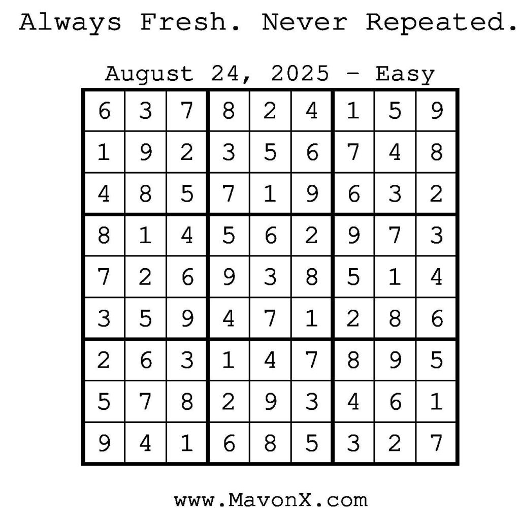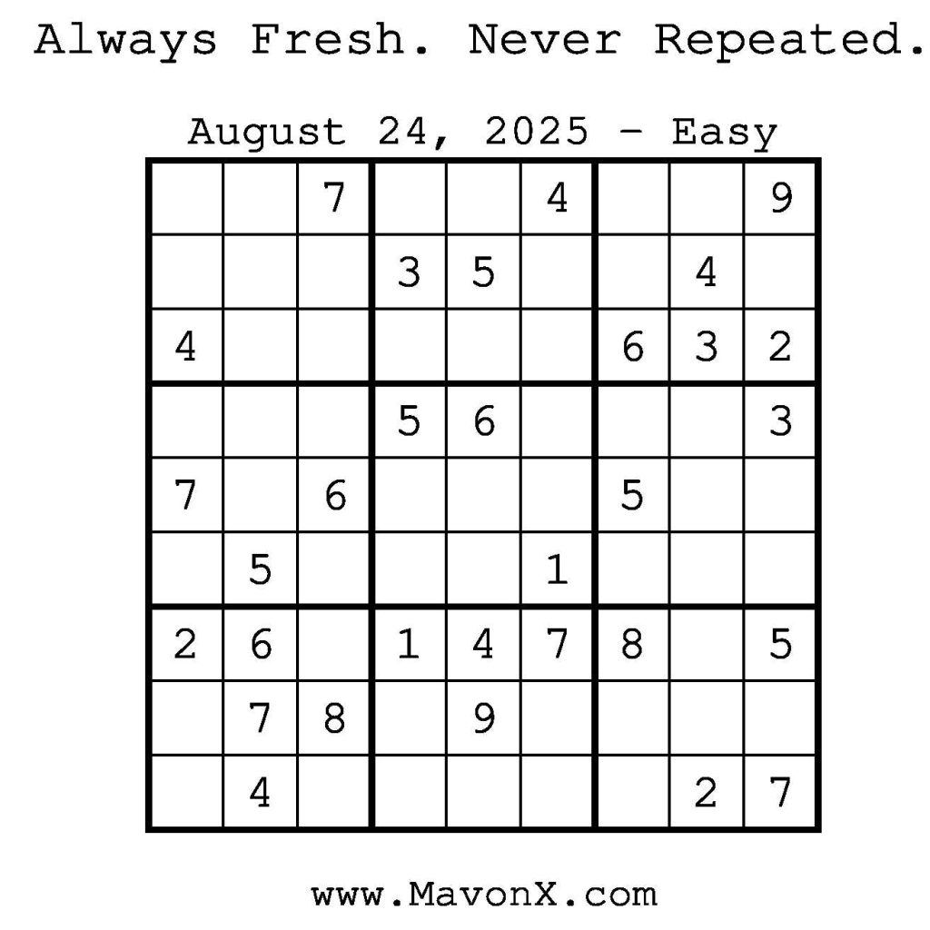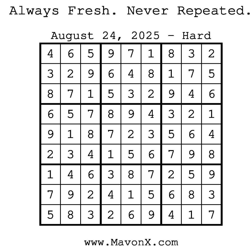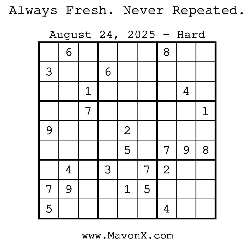 Puzzles of the Day – August 24, 2025 Post author:admin Post published:August 24, 2025 Post category:Free Stuff / Puzzle of the Day / Puzzle of the Day Solutions / Solutions Post comments:0 Comments Check out our books on Amazon! Check out our books on Barnes and Noble! Check out our books on Etsy! Easy Sudoku Coach Link Medium Sudoku Coach Link Hard Sudoku Coach Link Show Solution You Might Also Like Puzzles of the Day – August 2, 2025 August 2, 2025 Puzzles of the Day – January 16, 2025 January 16, 2025 Puzzles of the Day – April 14, 2025 April 14, 2025 Leave a Reply Cancel replyCommentEnter your name or username to comment Enter your email address to comment Enter your website URL (optional) Save my name, email, and website in this browser for the next time I comment.