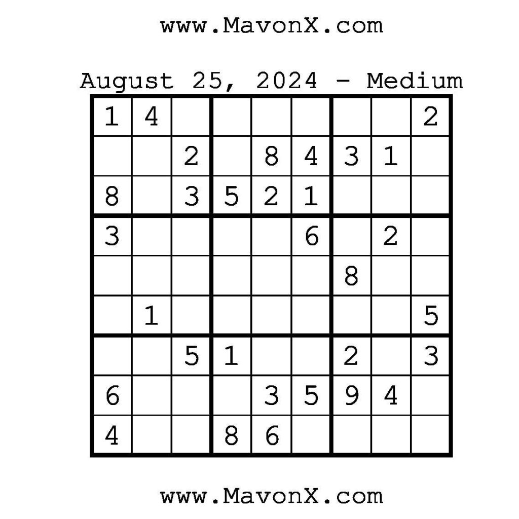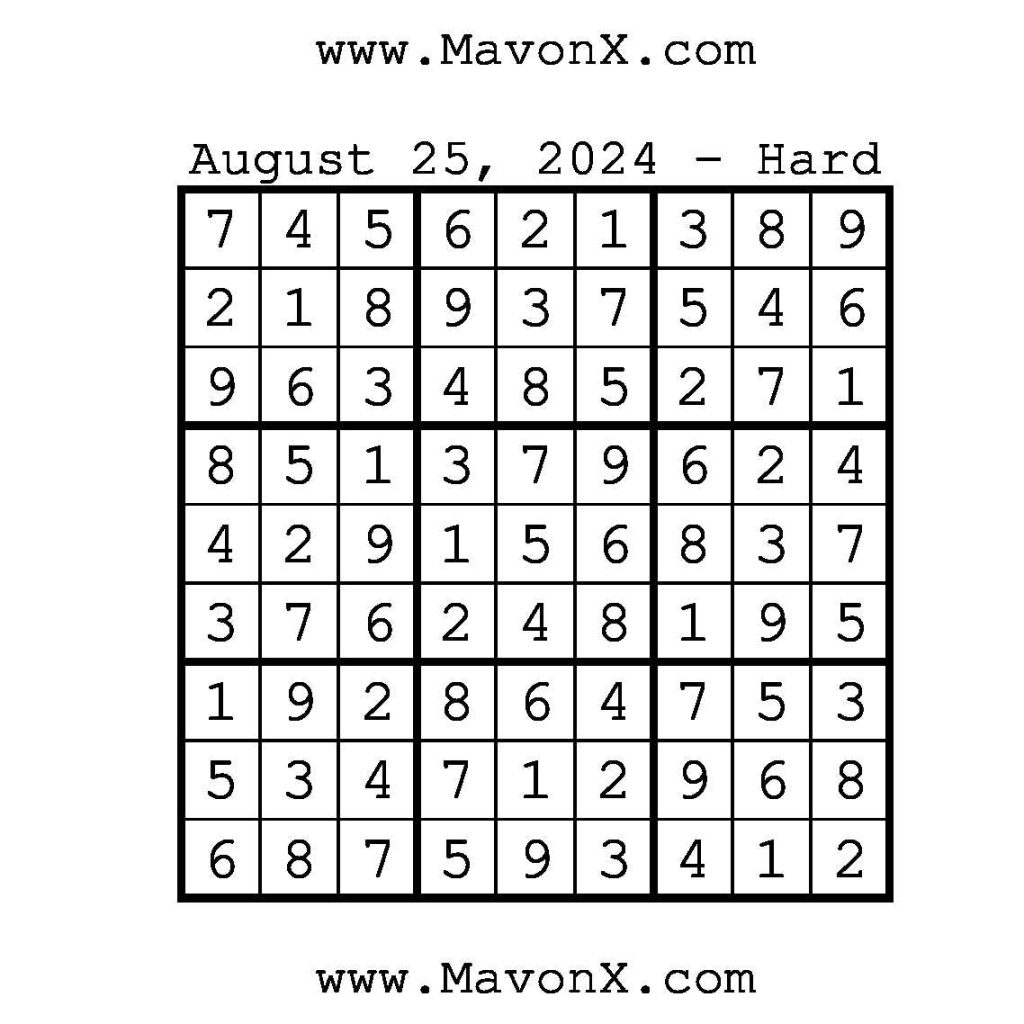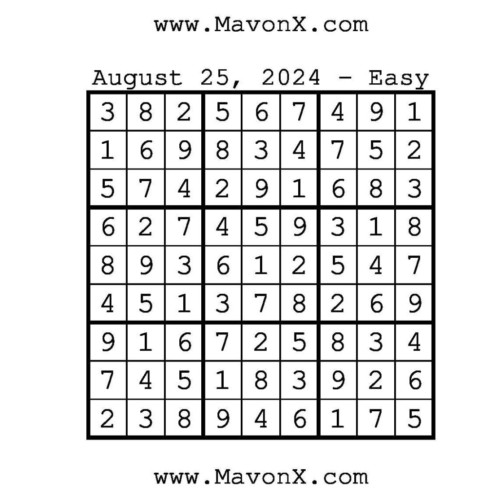 Puzzles of the Day – August 25, 2024 Post author:admin Post published:August 25, 2024 Post category:Free Stuff / Puzzle of the Day / Puzzle of the Day Solutions / Solutions Post comments:0 Comments Check out our books on Amazon!!!!! Easy Sudoku Coach Link Medium Sudoku Coach Link Hard Sudoku Coach Link Show Solution You Might Also Like Puzzles of the Day – January 1, 2025 January 1, 2025 Puzzles of the Day – May 1, 2025 April 30, 2025 Puzzles of the Day – November 19, 2025 November 19, 2025 Leave a Reply Cancel replyCommentEnter your name or username to comment Enter your email address to comment Enter your website URL (optional) Save my name, email, and website in this browser for the next time I comment.