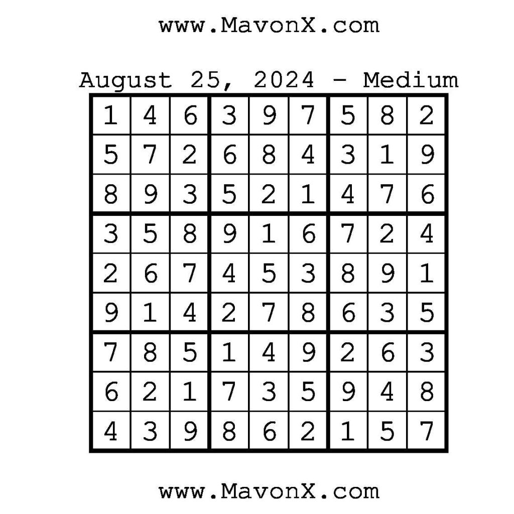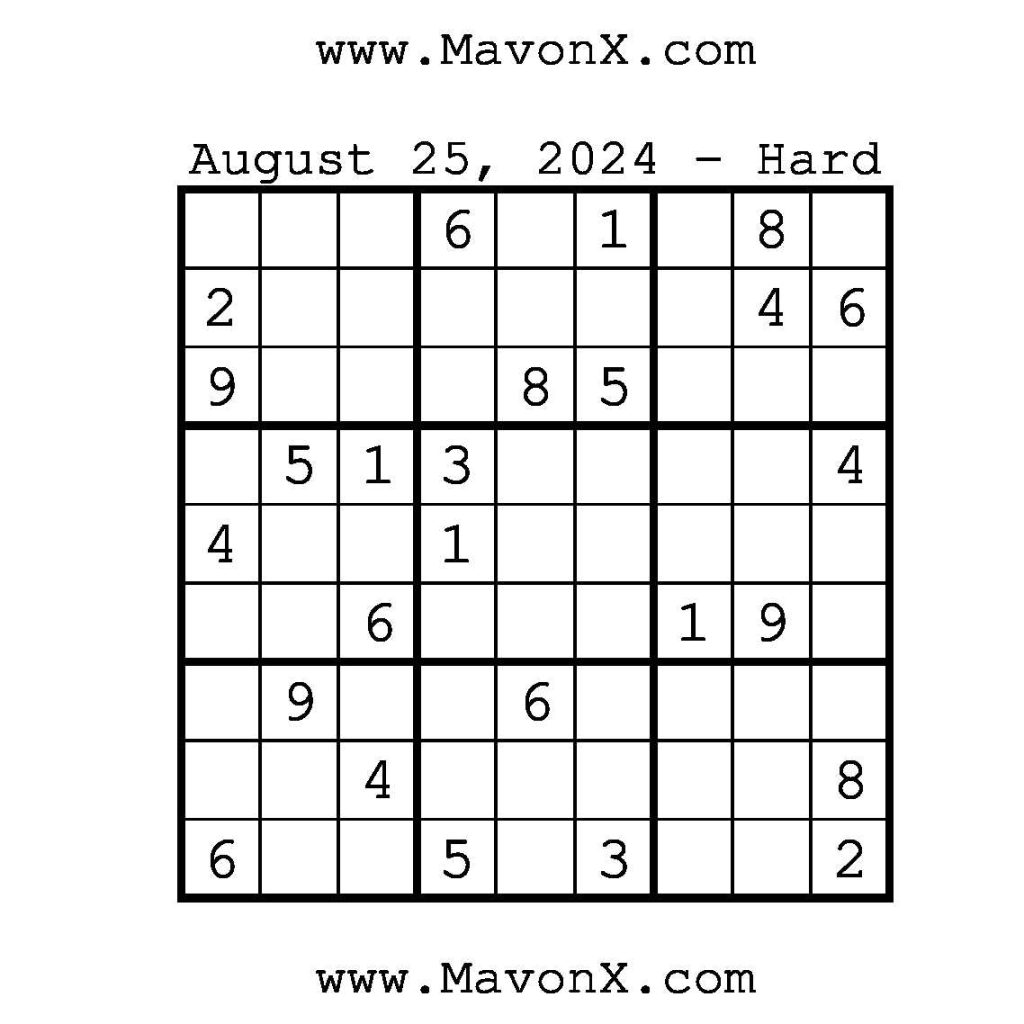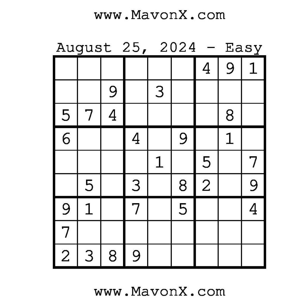 Puzzles of the Day – August 25, 2024 Post author:admin Post published:August 25, 2024 Post category:Free Stuff / Puzzle of the Day / Puzzle of the Day Solutions / Solutions Post comments:0 Comments Check out our books on Amazon!!!!! Easy Sudoku Coach Link Medium Sudoku Coach Link Hard Sudoku Coach Link Show Solution You Might Also Like Puzzles of the Day – January 1, 2025 January 1, 2025 Puzzles of the Day – May 1, 2025 April 30, 2025 Puzzles of the Day – November 19, 2025 November 19, 2025 Leave a Reply Cancel replyCommentEnter your name or username to comment Enter your email address to comment Enter your website URL (optional) Save my name, email, and website in this browser for the next time I comment.