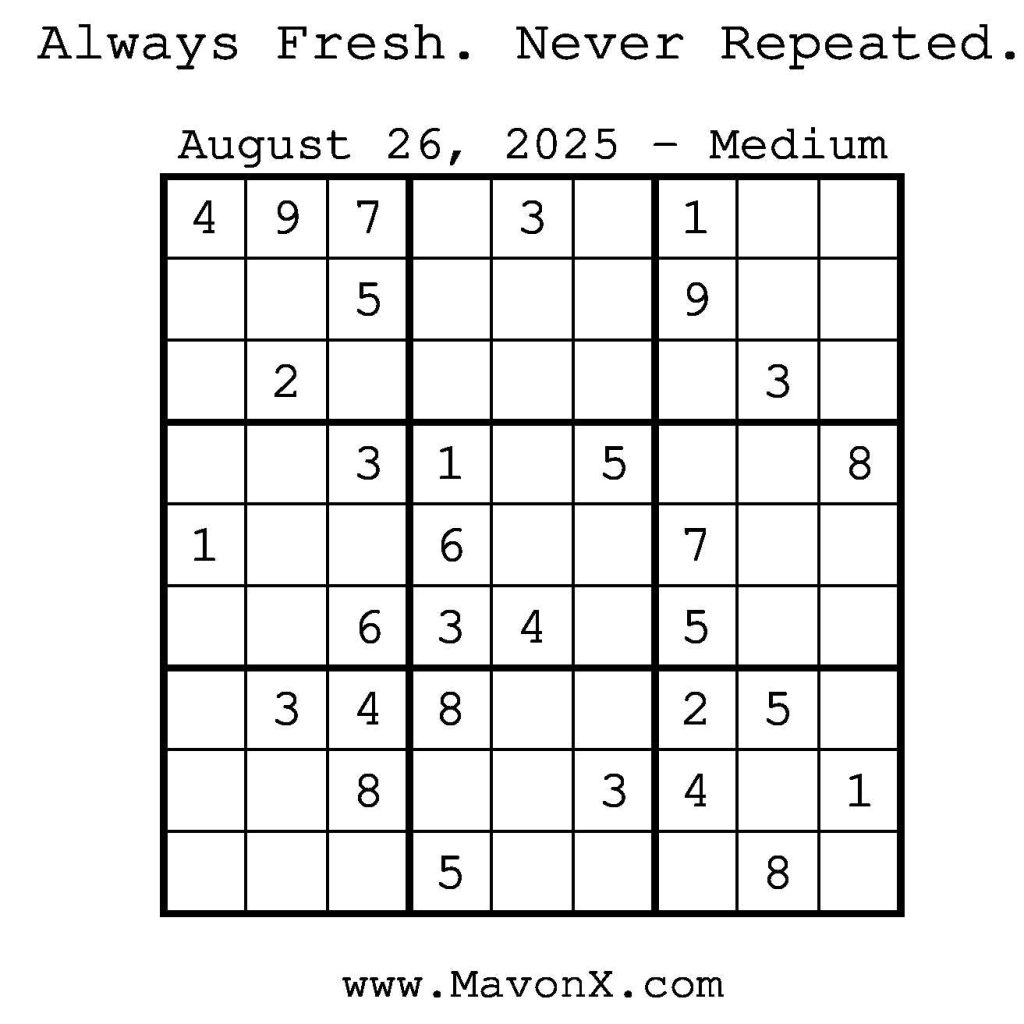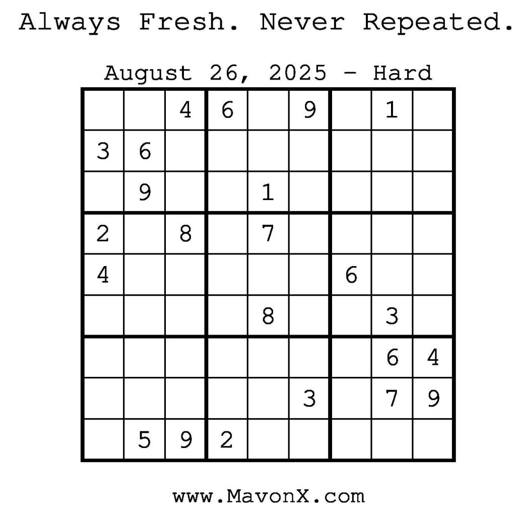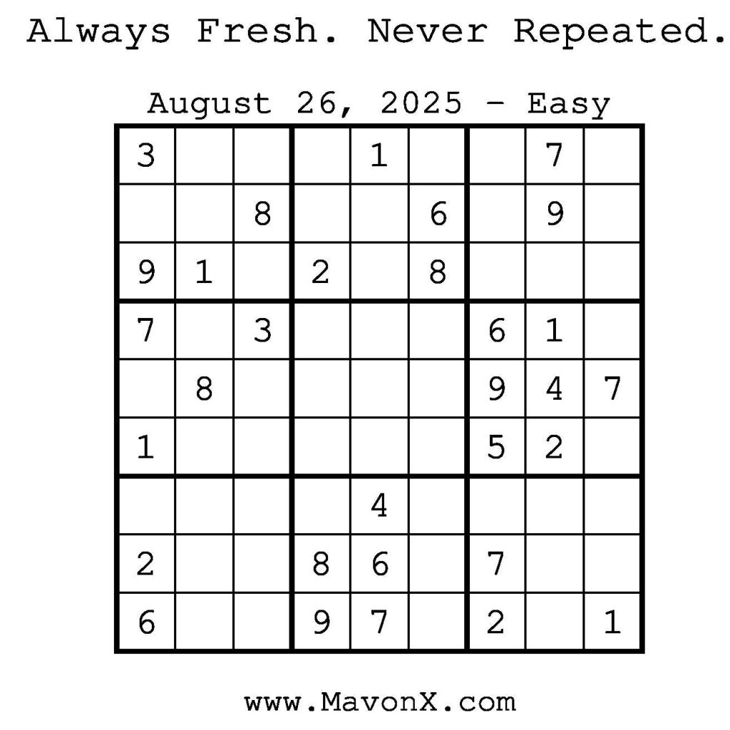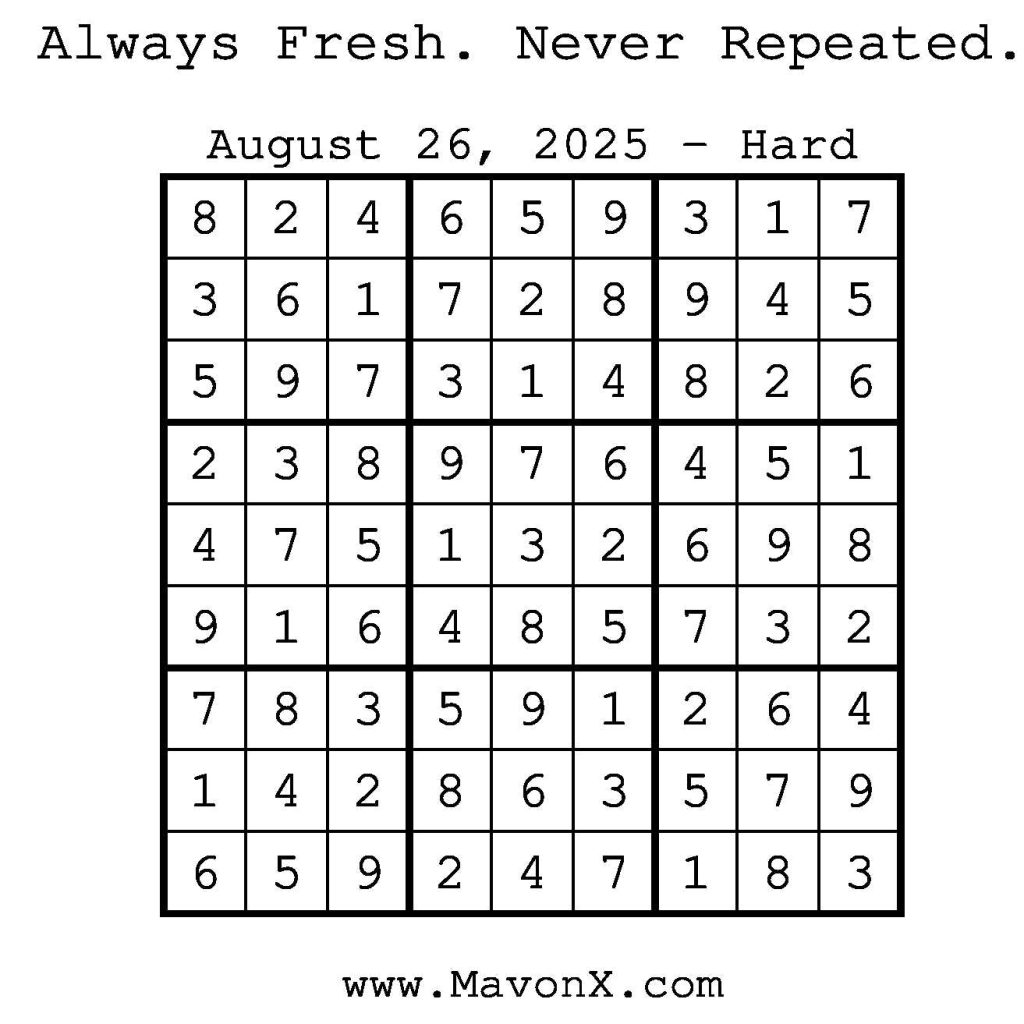 Puzzles of the Day – August 26, 2025 Post author:admin Post published:August 25, 2025 Post category:Free Stuff / Puzzle of the Day / Puzzle of the Day Solutions / Solutions Post comments:0 Comments Check out our books on Amazon! Check out our books on Barnes and Noble! Check out our books on Etsy! Easy Sudoku Coach Link Medium Sudoku Coach Link Hard Sudoku Coach Link Show Solution You Might Also Like Puzzles of the Day – September 28, 2025 September 28, 2025 Puzzles of the Day – September 17, 2024 September 17, 2024 Puzzles of the Day – November 19, 2025 November 19, 2025 Leave a Reply Cancel replyCommentEnter your name or username to comment Enter your email address to comment Enter your website URL (optional) Save my name, email, and website in this browser for the next time I comment.