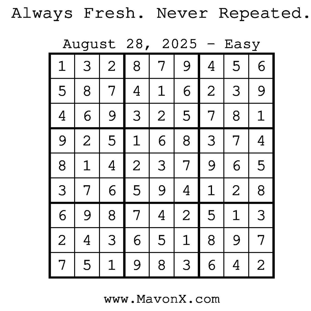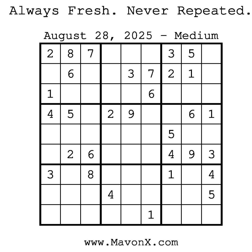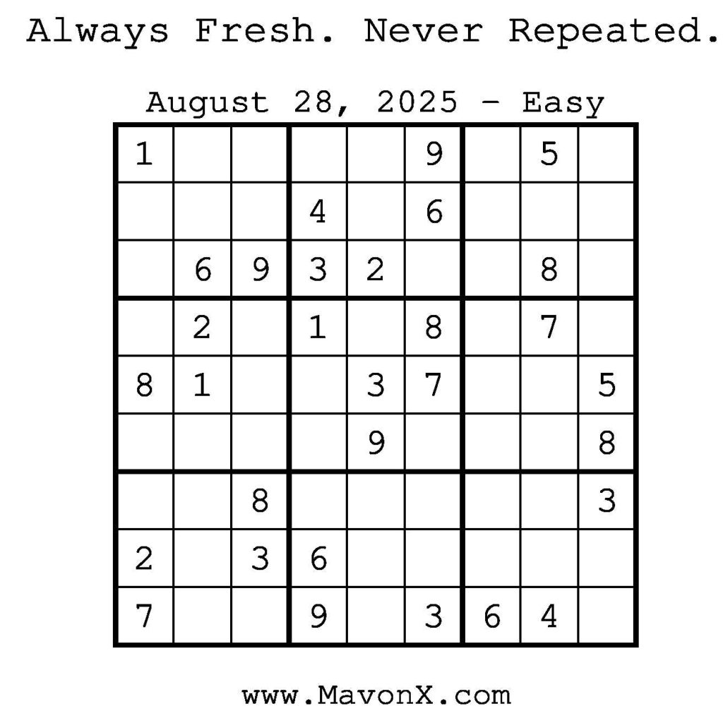 Puzzles of the Day – August 28, 2025 Post author:admin Post published:August 28, 2025 Post category:Free Stuff / Puzzle of the Day / Puzzle of the Day Solutions / Solutions Post comments:0 Comments Check out our books on Amazon! Check out our books on Barnes and Noble! Check out our books on Etsy! Easy Sudoku Coach Link Medium Sudoku Coach Link Hard Sudoku Coach Link Show Solution You Might Also Like Puzzles of the Day – November 4, 2024 November 4, 2024 Puzzles of the Day – January 9, 2025 January 8, 2025 Puzzles of the Day – September 1, 2024 September 1, 2024 Leave a Reply Cancel replyCommentEnter your name or username to comment Enter your email address to comment Enter your website URL (optional) Save my name, email, and website in this browser for the next time I comment.