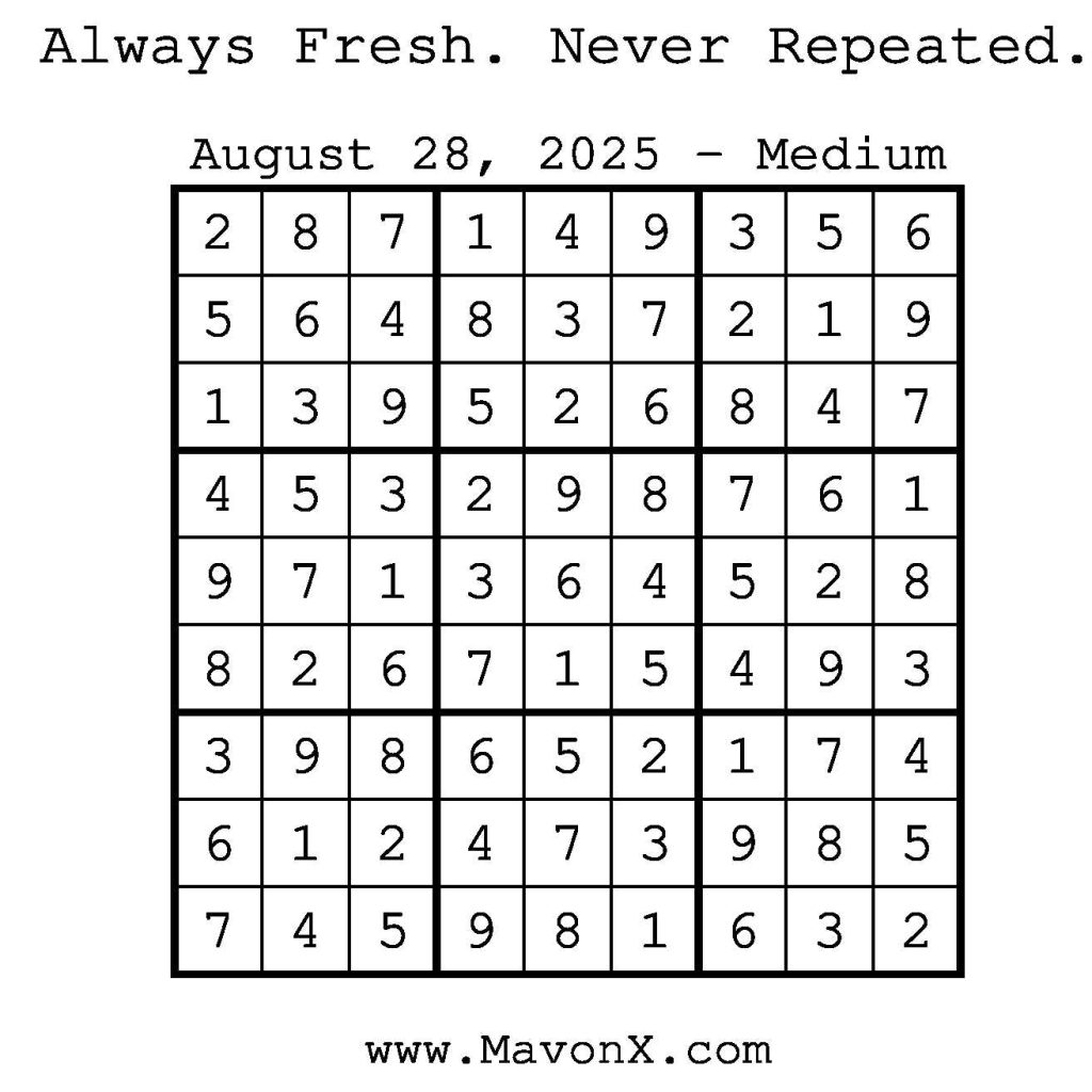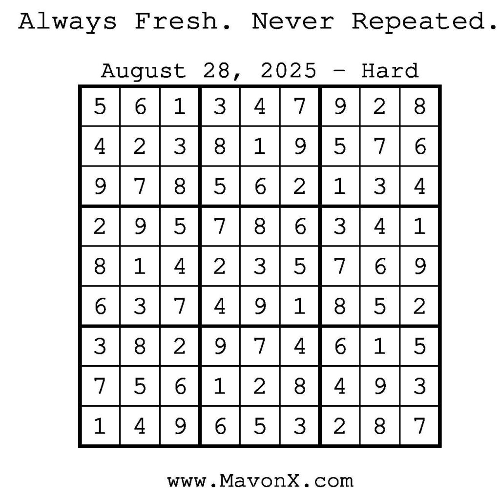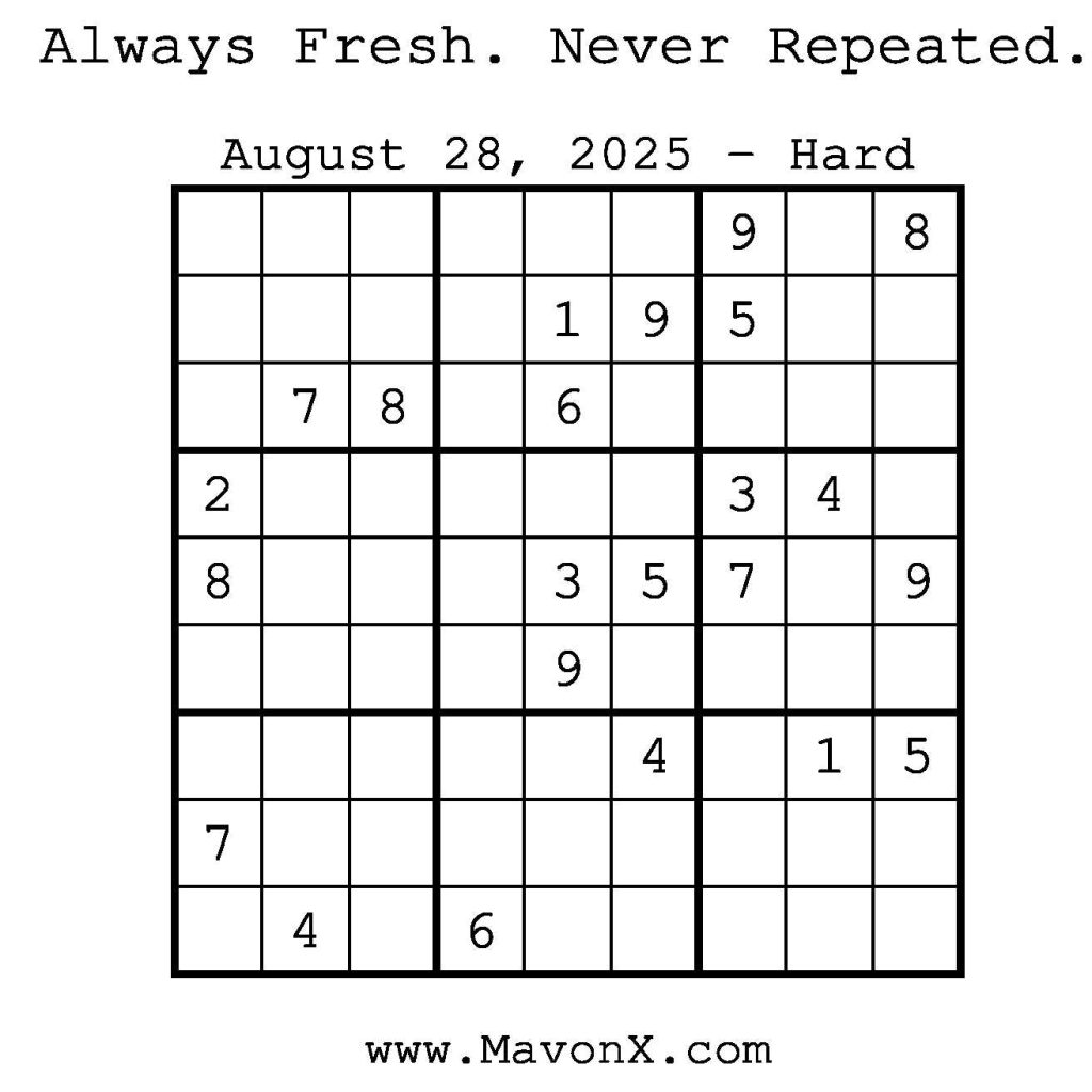 Puzzles of the Day – August 28, 2025 Post author:admin Post published:August 28, 2025 Post category:Free Stuff / Puzzle of the Day / Puzzle of the Day Solutions / Solutions Post comments:0 Comments Check out our books on Amazon! Check out our books on Barnes and Noble! Check out our books on Etsy! Easy Sudoku Coach Link Medium Sudoku Coach Link Hard Sudoku Coach Link Show Solution You Might Also Like Puzzles of the Day – November 4, 2024 November 4, 2024 Puzzles of the Day – January 9, 2025 January 8, 2025 Puzzles of the Day – September 1, 2024 September 1, 2024 Leave a Reply Cancel replyCommentEnter your name or username to comment Enter your email address to comment Enter your website URL (optional) Save my name, email, and website in this browser for the next time I comment.
