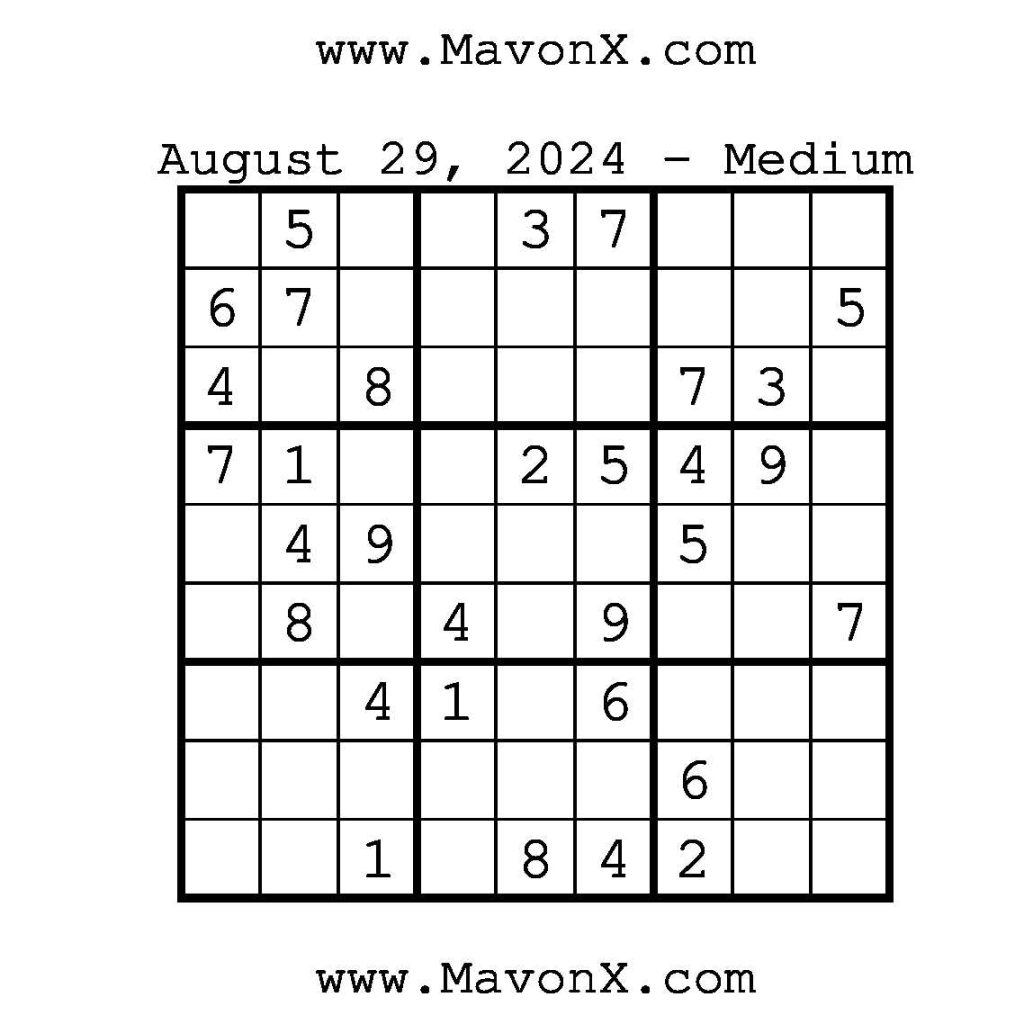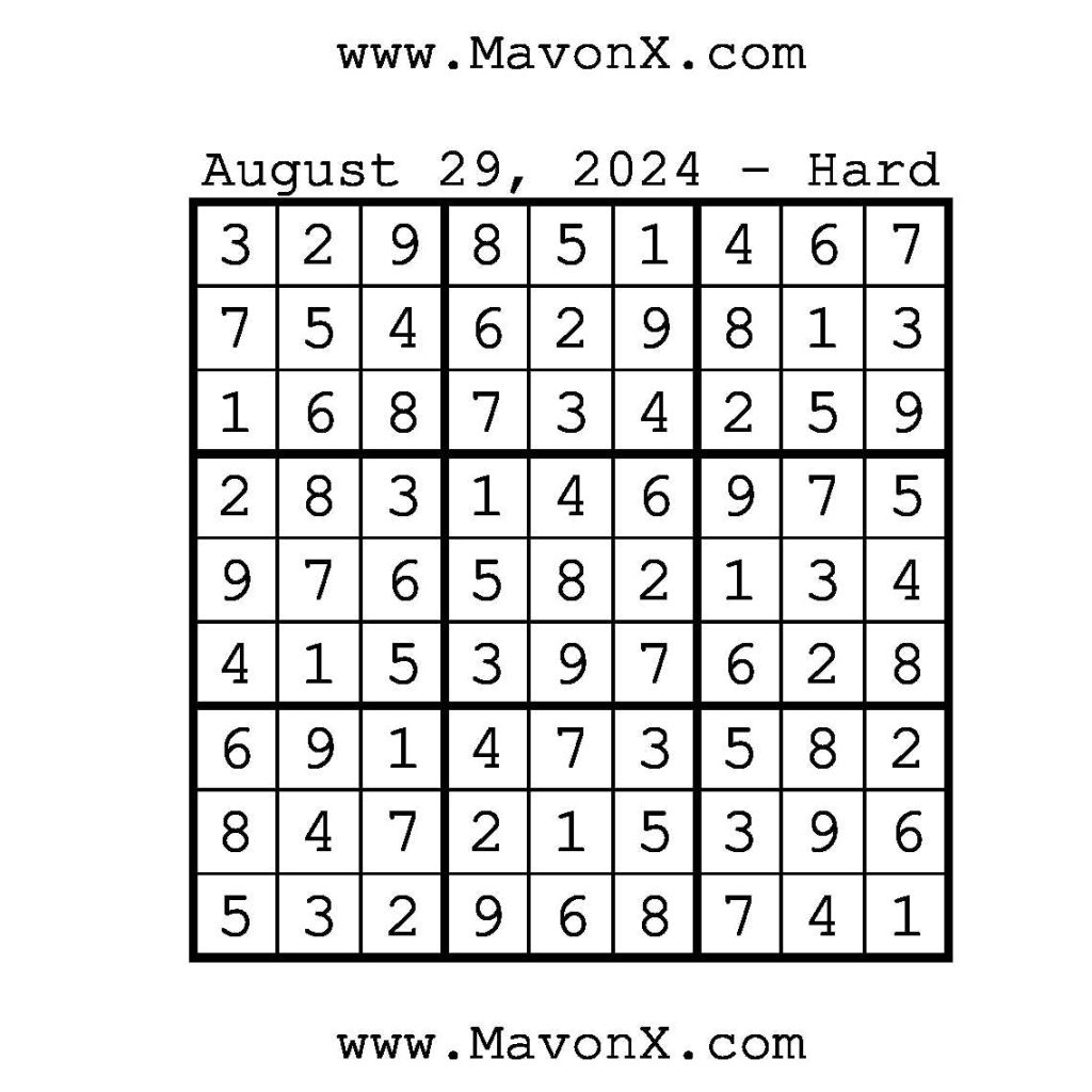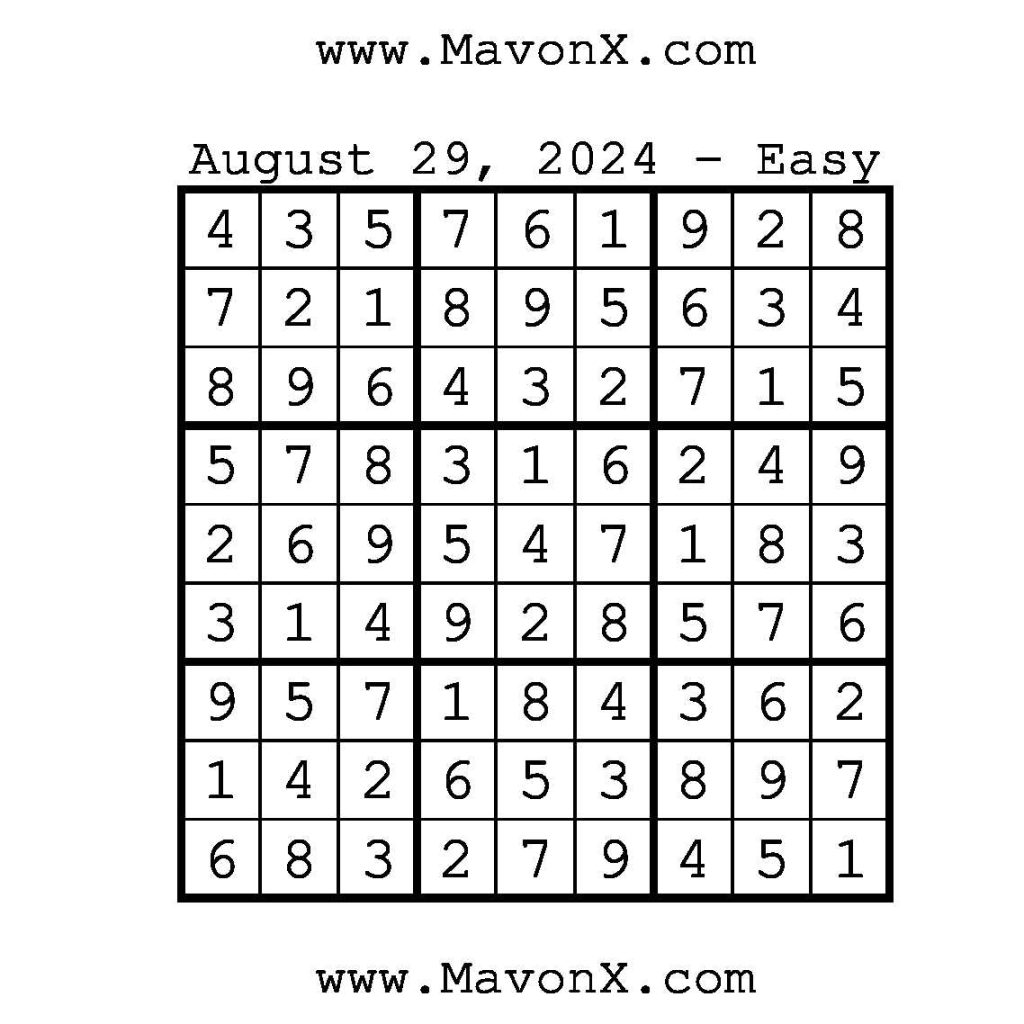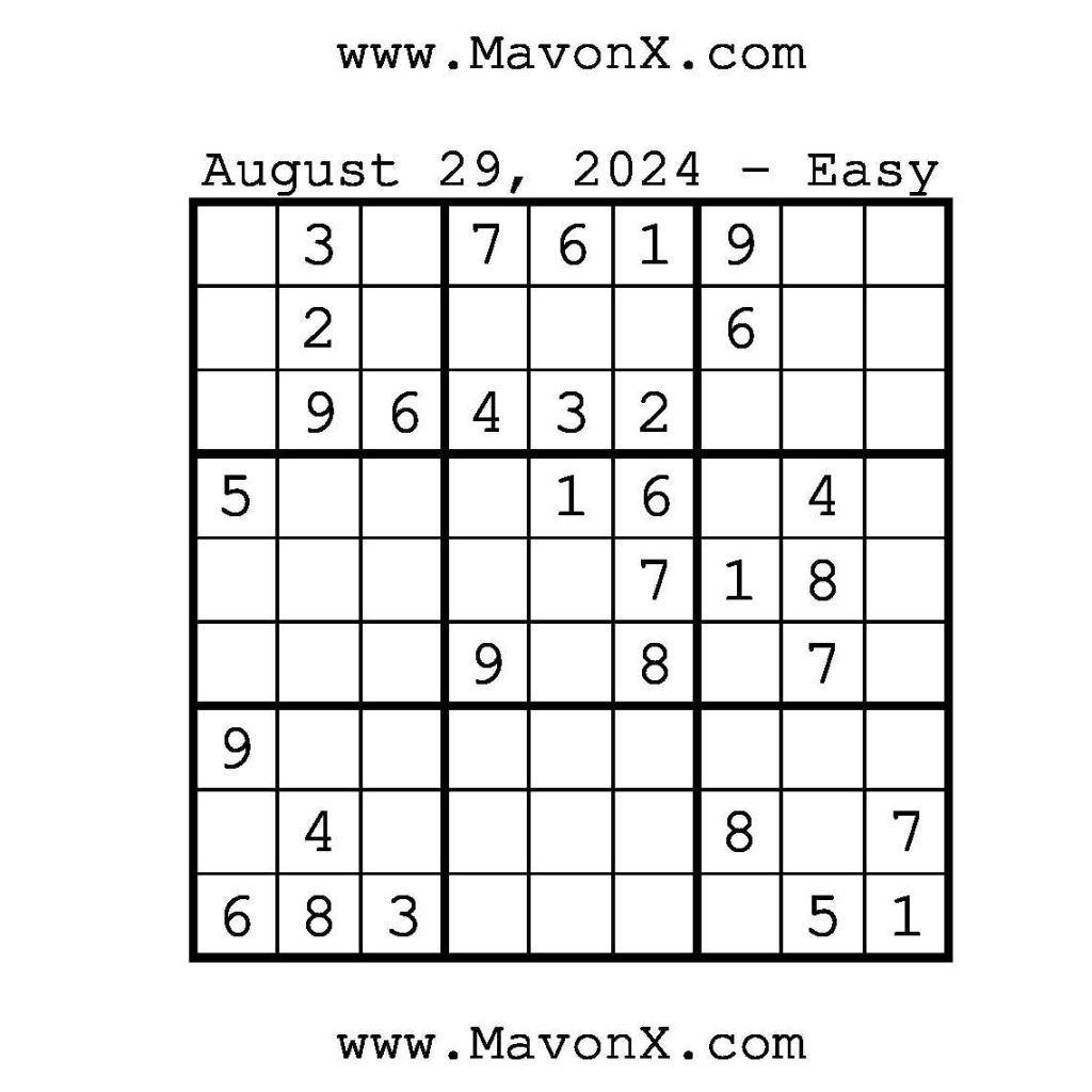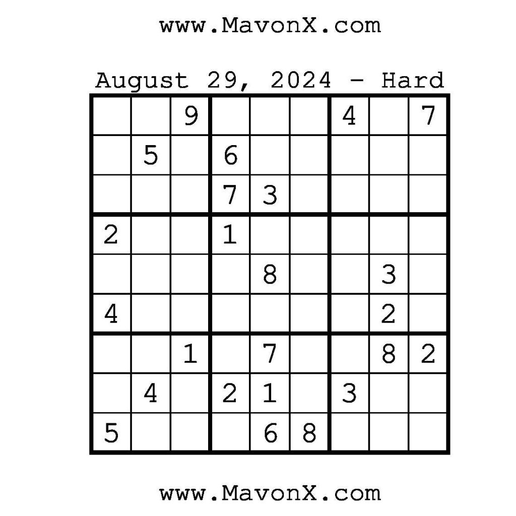 Puzzles of the Day – August 29, 2024 Post author:admin Post published:August 29, 2024 Post category:Free Stuff / Puzzle of the Day / Puzzle of the Day Solutions / Solutions Post comments:0 Comments Check out our books on Amazon!!!!! Easy Sudoku Coach Link Medium Sudoku Coach Link Hard Sudoku Coach Link Show Solution You Might Also Like Puzzle of the Day – August 8, 2024 August 8, 2024 Puzzles of the Day – March 8, 2026 March 9, 2026 Puzzles of the Day – September 29, 2024 September 29, 2024 Leave a Reply Cancel replyCommentEnter your name or username to comment Enter your email address to comment Enter your website URL (optional) Save my name, email, and website in this browser for the next time I comment.