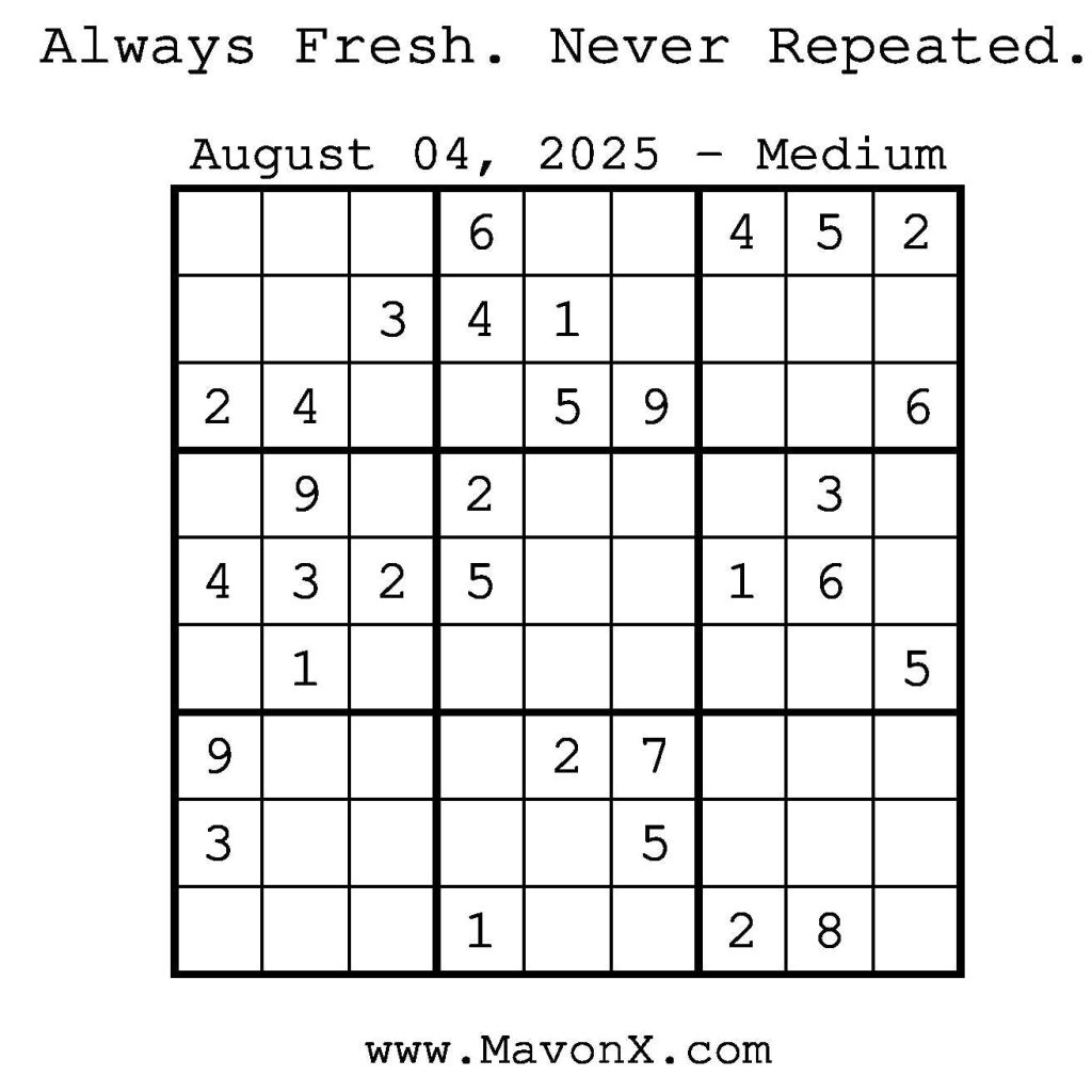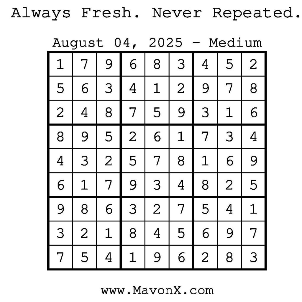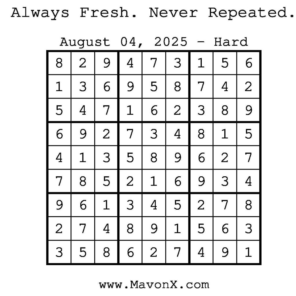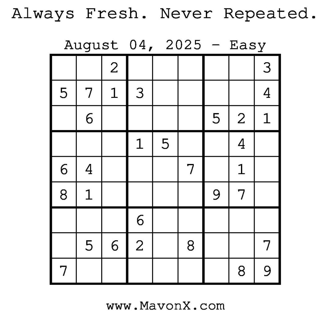Puzzles of the Day – August 4, 2025 Post author:admin Post published:August 3, 2025 Post category:Free Stuff / Puzzle of the Day / Puzzle of the Day Solutions / Solutions Post comments:0 Comments Check out our books on Amazon! Check out our books on Barnes and Noble! Check out our books on Etsy! Easy Sudoku Coach Link Medium Sudoku Coach Link Hard Sudoku Coach Link Show Solution You Might Also Like Puzzles of the Day – August 31, 2025 August 30, 2025 Puzzles of the Day – January 3, 2026 January 2, 2026 Puzzles of the Day – November 7, 2025 November 6, 2025 Leave a Reply Cancel replyCommentEnter your name or username to comment Enter your email address to comment Enter your website URL (optional) Save my name, email, and website in this browser for the next time I comment.